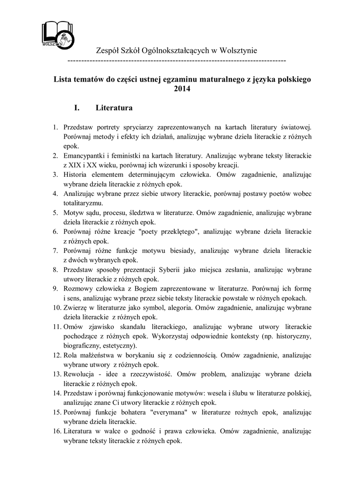 Zespół Szkół Ogólnokształcących w Wolsztynie ------------------------------------------------------------------------------Lista tematów do części ustnej egzaminu maturalnego z języka polskiego 2014 I. Literatura 1. Przedstaw portrety spryciarzy zaprezentowanych na kartach literatury światowej. Porównaj metody i efekty ich działań, analizując wybrane dzieła literackie z różnych epok. 2. Emancypantki i feministki na kartach literatury. Analizując wybrane teksty literackie z XIX i XX wieku, porównaj ich wizerunki i sposoby kreacji. 3. Historia elementem determinującym człowieka. Omów zagadnienie, analizując wybrane dzieła literackie z różnych epok. 4. Analizując wybrane przez siebie utwory literackie, porównaj postawy poetów wobec totalitaryzmu. 5. Motyw sądu, procesu, śledztwa w literaturze. Omów zagadnienie, analizując wybrane dzieła literackie z różnych epok. 6. Porównaj różne kreacje "poety przeklętego", analizując wybrane dzieła literackie z różnych epok. 7. Porównaj różne funkcje motywu biesiady, analizując wybrane dzieła literackie z dwóch wybranych epok. 8. Przedstaw sposoby prezentacji Syberii jako miejsca zesłania, analizując wybrane utwory literackie z różnych epok. 9. Rozmowy człowieka z Bogiem zaprezentowane w literaturze. Porównaj ich formę i sens, analizując wybrane przez siebie teksty literackie powstałe w różnych epokach. 10. Zwierzę w literaturze jako symbol, alegoria. Omów zagadnienie, analizując wybrane dzieła literackie z różnych epok. 11. Omów zjawisko skandalu literackiego, analizując wybrane utwory literackie pochodzące z różnych epok. Wykorzystaj odpowiednie konteksty (np. historyczny, biograficzny, estetyczny). 12. Rola małżeństwa w borykaniu się z codziennością. Omów zagadnienie, analizując wybrane utwory z różnych epok. 13. Rewolucja - idee a rzeczywistość. Omów problem, analizując wybrane dzieła literackie z różnych epok. 14. Przedstaw i porównaj funkcjonowanie motywów: wesela i ślubu w literaturze polskiej, analizując znane Ci utwory literackie z różnych epok. 15. Porównaj funkcje bohatera "everymana" w literaturze rożnych epok, analizując wybrane dzieła literackie. 16. Literatura w walce o godność i prawa człowieka. Omów zagadnienie, analizując wybrane teksty literackie z różnych epok. Zespół Szkół Ogólnokształcących w Wolsztynie ------------------------------------------------------------------------------17. Kostium mitologiczny i historyczny jako sposób mówienia o problemach Polaków. Przedstaw zagadnienie, analizując wybrane utwory literackie z różnych epok. 18. Spory ideowe "starych" i "młodych" w literaturze wybranych epok. Przedstaw zagadnienie, analizując konkretne programy i utwory literackie. 19. Literackie powroty do motywów mitologicznych i biblijnych. Przedstaw sposoby ich reinterpretacji i porównaj ich funkcjonalność, analizując wybrane dzieła literackie z różnych epok. 20. Porównaj sposoby kreowania portretów ludzi zasługujących na pogardę, analizując wybrane teksty literackie. 21. Pamiętnikarz jako narrator i bohater swego dzieła. Analizując wybrane dzieła literackie, pochodzące z różnych epok, przedstaw sposoby realizacji tych ról. 22. Folklor jako inspiracja pisarzy w różnych epokach. Przedstaw zagadnienie, analizując wybrane utwory literackie. 23. Przedstaw rolę artystów jako moralistów i wychowawców społeczeństwa, analizując wybrane teksty literackie. 24. Polacy w satyrze i karykaturze literackiej. Przedstaw sposoby kreowania portretów i ich funkcje w literaturze, analizując wybrane utwory. 25. Rosja w oczach swoich pisarzy – przedstaw sposoby mówienia o państwie i społeczeństwie, analizując przykłady literatury radzieckiej i rosyjskiej. 26. Porównaj portrety artystów (muzyków, malarzy itd.) w literaturze. Przedstaw różnorodne sposoby kreacji, analizując odpowiednio dobrane utwory literackie. 27. Francja w oczach pisarzy - przedstaw sposoby mówienia o państwie i społeczeństwie, analizując wybrane dzieła literackie. 28. „Choroby wieku” jako temat twórczości romantycznej. Przedstaw ich przyczyny i skutki, analizując stosownie dobrane utwory literackie. 29. Porównaj różne realizacje gatunku ballady w literaturze, analizując wybrane teksty. 30. Rola strachu w życiu bohaterów literackich. Omów zagadnienie, analizując wybrane dzieła. 31. Porównaj różne realizacje motywu drzewa, analizując wybrane teksty literackie. 32. Przedstaw, jak literatura XX w. komentuje dzieła sztuki, analizując wybrane dzieła. 33. Porównaj różne realizacje hymnu w literaturze wybranych epok. Przedstaw zagadnienie, analizując wybrane dzieła. 34. Absurd i groteska jako wyraz dezaprobaty wobec istniejącej rzeczywistości. Omów zagadnienie, analizując wybrane utwory literackie. 35. Porównaj obrazy wsi współczesnej i dziewiętnastowiecznej. Analizując wybrane dzieła literackie, przedstaw, jak zmieniło się wyobrażenie wsi w literaturze. 36. "Poezja porażonych wojną". Porównaj sposoby przedstawienia świata i uczuć podmiotu lirycznego, analizując twórczość dwóch wybranych poetów. 37. Przedstaw stosunek literatów II połowy XIX wieku do romantycznych wzorców osobowych, analizując wybrane teksty literackie. Zespół Szkół Ogólnokształcących w Wolsztynie ------------------------------------------------------------------------------38. Tytuły, motta, zakończenia kluczem do interpretacji dzieła. Przedstaw funkcje, jakie pełnią w wybranych utworach, analizując wybrane teksty literackie. 39. Analizując wybrane teksty literackie, przedstaw, jak ewoluowała konwencja erotyku na przestrzeni epok. 40. Analizując wybrane przykłady reportaży literackich, zbadaj relacje między autorem a bohaterem. Sformułuj wnioski na temat dostrzeżonych prawidłowości. 41. Konflikt pokoleń - mit czy rzeczywistość? Omów problem, analizując wybrane teksty litera