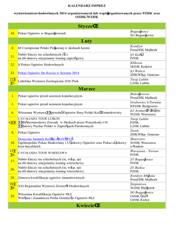KALENDARZ IMPREZ wystawienniczo-hodowlanych 2014 organizowanych lub współorganizowanych przez PZHK oraz OZHK/WZHK Styczeń Bogusławice SO Bogusławice 18. Pokaz Ogierów w Bogusławicach Luty 8. III Czempionat Polski Północnej w skokach luzem 11. Nabór klaczy ras szlachetnych (śl.) na 60-dniowy stacjonarny trening zaprzęgowy 22. II Pokaz Ogierów Hodowlanych 22. Pokaz Ogierów Do Krycia w Sezonie 2014 22 – Lubelska Wystawa Zoologiczna ZOO Park 23. Kwidzyn PomZHK Malbork ZT Książ PZHK Klikowa MZHK Kraków KJ Wolica ZHKWlkp. Gniezno Targi Lublin LZHK Lublin Marzec 1. Pokaz ogierów przed sezonem kopulacyjnym 1. Pokaz ogierów przed sezonem kopulacyjnym 6. Wiosenna Wystawa – Sprzedaż Ogierów Rasy Polski Koń Zimnokrwisty CAVALIADA TOUR LUBLIN 6 – 9. – Międzynarodowe Zawody w Skokach przez Przeszkody CSI – Halowy Puchar Polski w Zaprzęgach Parokonnych 8. Pokaz Ogierów Doroczny Jarmark Koński „WSTĘPY„ 10. Ogólnopolski Pokaz Hodowlany i Użytkowy Ogierów oraz Pokaz użytkowy koni huculskich 13 – CAVALIADA TOUR WARSZAWA 16. Nabór klaczy ras szlachetnych (m, wlkp, sp) 17. na 60-dniowy stacjonarny trening wierzchowy Nabór klaczy ras szlachetnych (m, wlkp, sp) 26. na 60-dniowy stacjonarny trening wierzchowy 28. Zimowa kwalifikacja ogierów zimnokrwistych 28 – XXI Regionalna Wystawa Zwierząt Hodowlanych 29. 29. Wiosenna Kwalifikacja Ogierów PKZ Wstępna i Zasadnicza Próba Dzielności Ogierów PKZ Kwiecień Bolesławowo PomZHK Malbork Grabowiec k/Torunia KPZHK Bydgoszcz KJ Aromer — Jóżefin WZHK Warszawa Targi Lublin PZHK LZHK Lublin Turek ZHKWlkp. Gniezno Skaryszew WZHK Warszawa o/Radom Warszawa - Torwar PZHK ZT Bogusławice PZHK ZT Bielice PZHK Kwidzyn Miłosna PomZHK Malbork Szepietowo WZHK Białystok SO Bogusławice OZHK Łódź OZHK Kielce 3. 4. Nabór klaczy ras szlachetnych (m, wlkp, sp) na 60-dniowy stacjonarny trening wierzchowy Nabór klaczy ras szlachetnych (m, wlkp, sp) na 60-dniowy stacjonarny trening wierzchowy 11 – Zaprzęgowa próba dzielności klaczy ras szlachetnych (śl.) 12. 12. Pokaz orki konnej i wiosennych prac polowych 13. Agrotargi 25. Szkolenie „Programy ras zachowawczych” 26. Pokaz ogierów kryjących w 2014 r. 29. Polowa wierzchowa próba dzielności klaczy – ras szlachetnych 29. VII Wiosenna Gala Koni rasy polski koń zimnokrwisty – Zasadnicza polowa próba zaprzęgowa ogierów starszych ZT Włocławek PZHK ZT Doruchów PZHK ZT Książ PZHK Muzeum Wsi Lubelskiej LZHK Lublin Czarnków ZHKWlkp. Gniezno Lubelska Izba Rolnicza LZHK Lublin ODR Olsztyn W-MZHK Olsztyn Galiny k/Bartoszyc W-MZHK Olsztyn Horodyszcze k/Wisznic LZHK Lublin Maj 1. Ogólnopolski Czempionat Koni Małopolskich SO Bogusławice OZHK Kielce 3. Ogólnopolski Czempionat Koni PKZ SO Bogusławice OZHK Kielce 3. Amatorskie zawody w powożeniu — Memoriał im. J.Lipowego 6. 9. Nabór klaczy ras szlachetnych (śl.) na 60-dniowy stacjonarny trening zaprzęgowy Nabór klaczy ras szlachetnych (m, wlkp, sp) na 60-dniowy stacjonarny trening zaprzęgowy 10. Zrywka drewna w wersji sportowej 10. Ogólnopolskie Targi Końskie (edycja wiosenna) 11. IX Pokaz Wszechstronnego Wykorzystania Koni i Kuców 16. Wierzchowa próba dzielności klaczy ras szlachetnych (m, wlkp, sp) Bukówiec ZHKWlkp. Gniezno ZT Książ PZHK ZT Bogusławice PZHK Kępino k/Wejherowa PomZHK Malbork Pajęczno OZHK Kielce Bychawa LZHK Lublin ZT Bogusławice PZHK Gniezno ZHKWlkp. Gniezno Małopolskie Zawody Oddziałów Kawalerii Ochotniczych — „Militarii”, połą- Klikowa czonych z Galicyjskim Turniejem Jeździeckim MZHK Kraków Nabór klaczy ras szlachetnych (m, wlkp, sp) ZT Bogusławice PZHK na 60-dniowy stacjonarny trening wierzchowy ZT Bielice Wierzchowa próba dzielności klaczy ras szlachetnych (m, wlkp, sp) 17. Premiowanie źrebiąt 17 – 18. 23. 24. 24. V Świętokrzyski Młodzieżowy Czempionat PKZ 24. III Czempionat Koni Ras Szlachetnych PZHK Gołoszyce OZHK Kielce Janów k/Chełma LZHK Lublin 24 – „Majówka w Regietowie„ 25. Próba dzielności + Eliminacje do Czempionatu Użytkowego SKH — Gładyszów MZHK Kraków 25. Preselekcja ogierów ras szlachetnych do Zakładów Treningowych Janów k/Chełma LZHK Lublin Czerwiec 1. XI Dzień Woźnicy – przegląd młodzieży rasy pkz 1. III Wojewódzkie Zawody w Powożeniu Zaprzęgami Konnymi 2. Wierzchowa próba dzielności klaczy ras szlachetnych (m, wlkp, sp) 3. Wierzchowa próba dzielności klaczy ras szlachetnych (m, wlkp, sp) 5. Polowa zaprzęgowa próba dzielności klaczy ras szlachetnych 7. Młodzieżowy Ogólnopolski Czempionat Koni Rasy Śląskiej 7 – 8. XXIII Pomorskie Targi Rolno-Przemysłowe, Pomorska Wojewódzka Wystawa Zwierząt Hodowlanych 7 – 8. II Mistrzostwa Małopolskie w Powożeniu Zaprzęgami Parokonnymi 7 – 8. XXIV Wiosenny Młodzieżowy Pokaz Koni Czystej Krwi Arabskiej 7 – 8. Konie i Powozy 7 – 9. XX Regionalna Wystawa Zwierząt Hodowlanych 8. Zjazd Miłośników Koni 8. Zawody konnych sikawek strażackich 12. Polowa zaprzęgowa próba dzielności klaczy zimnokrwistych 14 – XXI Żuławskie Targi Rolne, 15. XIV Regionalna Wystawa Zwierząt Hodowlanych 14 – Pokaz ras rodzimych i zachowawczych w Małopolsce 15. 14 – VIII Mazowiecka Wystawa Klaczy Hodowlanych oraz 15. Amatorskie Zwody Zaprzęgowe 14 – Regionalna Wystawa Koni Hodowlanych Marszew 2014 15. 14 – „Święto Konia Małopolskiego„ 15. VIII Regionalny Czempionat Koni Rasy Małopolskiej 15. Czempionat Źrebiąt rasy pkz pod matkami Smolajny k/Dobrego Miasta W-MZHK Olsztyn Borki k/Nowodworu LZHK Lublin ZT Włocławek PZHK ZT Doruchów PZHK Urzędów LZHK Lublin Pajęczno OZHK Kielce Lubań PomZHK Malbork SKH — Gładyszów MZHK Kraków SO Białka LZHK Lublin Rokosowo ZHKWlkp. Gniezno Sielinko ZHKWlkp. Gniezno Pajęczno OZHK Kielce Rudawka Rymanowska OZHK Rzeszów Wolica LZHK Lublin Stare Pole PomZHK Malbork Szczyrzyc MZHK Kraków ODR Poświętne k/Płońska WZHK Warszawa Marszew ZHKWlkp. Gniezno Klikowa MZHK Kraków OZHK Rzeszów Szta