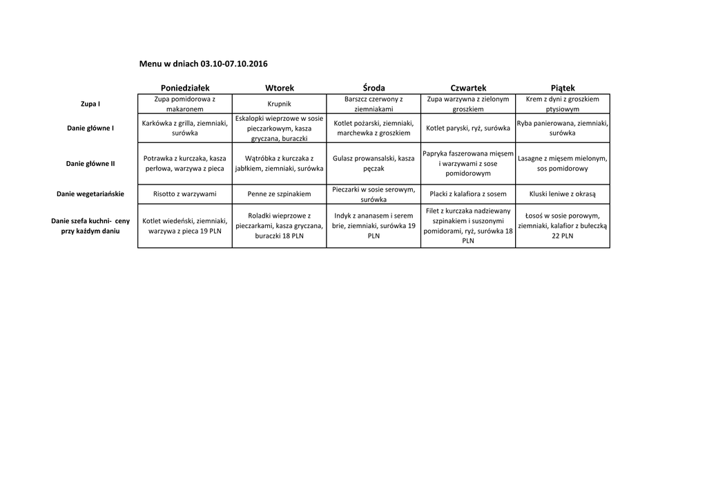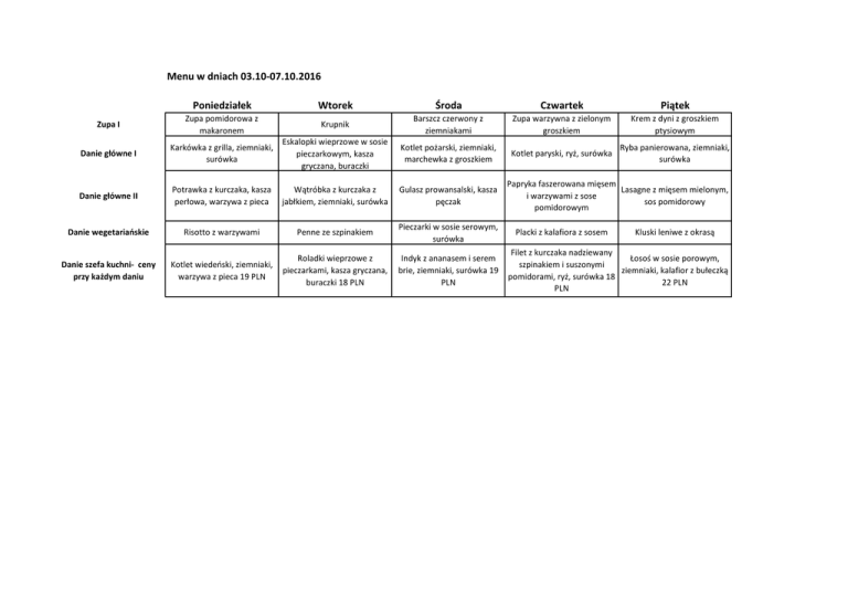 Menu w dniach 03.10-07.10.2016 Wtorek Środa Czwartek Piątek Zupa I Zupa pomidorowa z makaronem Poniedziałek Krupnik Barszcz czerwony z ziemniakami Zupa warzywna z zielonym groszkiem Krem z dyni z groszkiem ptysiowym Danie główne I Karkówka z grilla, ziemniaki, surówka Eskalopki wieprzowe w sosie pieczarkowym, kasza gryczana, buraczki Kotlet pożarski, ziemniaki, marchewka z groszkiem Kotlet paryski, ryż, surówka Ryba panierowana, ziemniaki, surówka Danie główne II Potrawka z kurczaka, kasza perłowa, warzywa z pieca Wątróbka z kurczaka z jabłkiem, ziemniaki, surówka Gulasz prowansalski, kasza pęczak Danie wegetariańskie Risotto z warzywami Penne ze szpinakiem Pieczarki w sosie serowym, surówka Danie szefa kuchni- ceny przy każdym daniu Kotlet wiedeński, ziemniaki, warzywa z pieca 19 PLN Roladki wieprzowe z pieczarkami, kasza gryczana, buraczki 18 PLN Indyk z ananasem i serem brie, ziemniaki, surówka 19 PLN Papryka faszerowana mięsem Lasagne z mięsem mielonym, i warzywami z sose sos pomidorowy pomidorowym Placki z kalafiora z sosem Kluski leniwe z okrasą Filet z kurczaka nadziewany Łosoś w sosie porowym, szpinakiem i suszonymi ziemniaki, kalafior z bułeczką pomidorami, ryż, surówka 18 22 PLN PLN