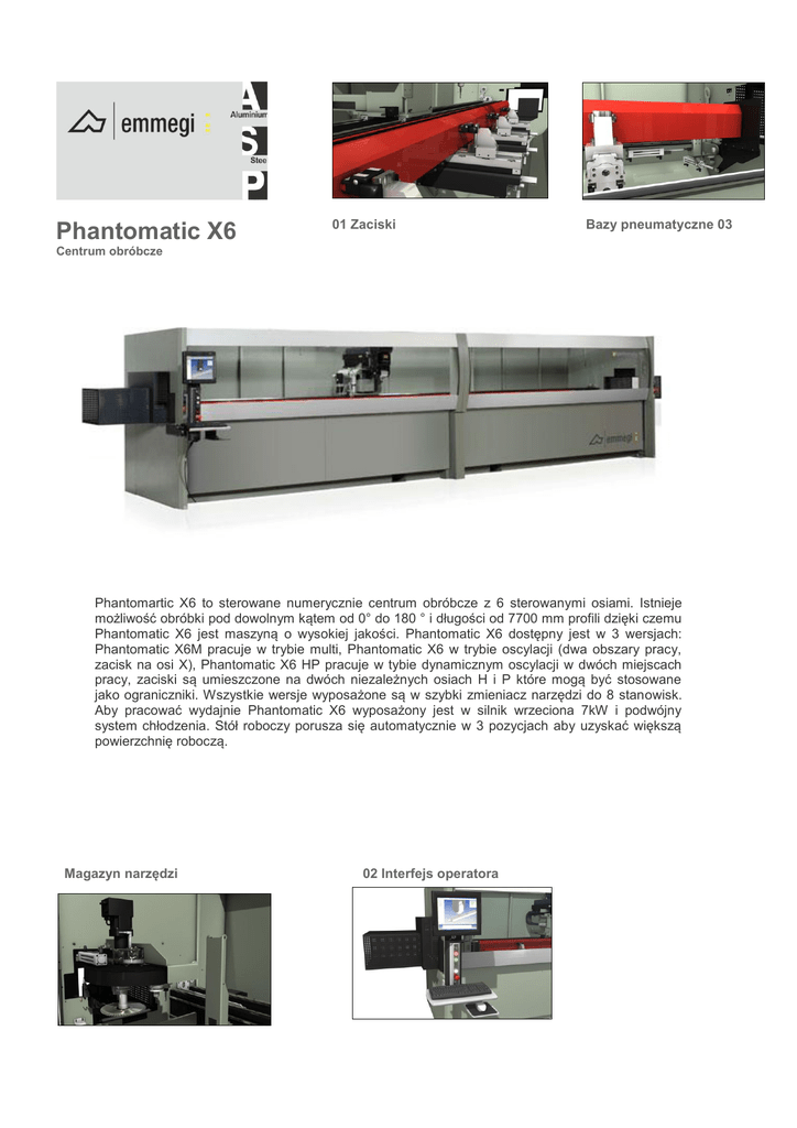 Phantomatic X6 01 Zaciski Bazy pneumatyczne 03 Centrum obróbcze Phantomartic X6 to sterowane numerycznie centrum obróbcze z 6 sterowanymi osiami. Istnieje możliwość obróbki pod dowolnym kątem od 0° do 180 ° i długości od 7700 mm profili dzięki czemu Phantomatic X6 jest maszyną o wysokiej jakości. Phantomatic X6 dostępny jest w 3 wersjach: Phantomatic X6M pracuje w trybie multi, Phantomatic X6 w trybie oscylacji (dwa obszary pracy, zacisk na osi X), Phantomatic X6 HP pracuje w tybie dynamicznym oscylacji w dwóch miejscach pracy, zaciski są umieszczone na dwóch niezależnych osiach H i P które mogą być stosowane jako ograniczniki. Wszystkie wersje wyposażone są w szybki zmieniacz narzędzi do 8 stanowisk. Aby pracować wydajnie Phantomatic X6 wyposażony jest w silnik wrzeciona 7kW i podwójny system chłodzenia. Stół roboczy porusza się automatycznie w 3 pozycjach aby uzyskać większą powierzchnię roboczą. Magazyn narzędzi 02 Interfejs operatora Phantomatic X6 Centrum obróbcze 01 02 03 Zaciski Interfejs operatora Imadła pneumatyczne Nowa wersja sterowania, z interfejsem wiszącym, pozwala operatorowi na oglądanie obrazu video z każdej pozycji, dzięki możliwości obracania monitora według osi pionowej. Interfejs operatora posiada wyświetlacz 15’’ typu „touchscreen” wyposażony we wszystkie połączenia USB konieczne do łączenia się na odległość z PC i CN. Ponadto posiada konsolę, mysz i klawiaturę, jak również możliwość podłączenia czytnika kodów kreskowych i konsoli zdalnej. Frontowy port USB, łatwo dostępny, zastępuje czytnik dyskietek i czytnik CD – Rom. W urządzeniu znajdują się mocne imadła, które służą do ustawiania sztangi, ułożone w ten sposób, że jedna jest po stronie prawej, a druga po lewej. Każda baza, uruchamiana za pośrednictwem cylindra pneumatycznego, jest typem bazy możliwej do schowania i jest wybierana automatycznie do danej funkcji obróbki, której ma służyć przez oprogramowanie komputerowe urządzenia. Korzyści z podwójnej bazy można podsumować jako możliwość załadowania większej liczby profili do obróbki w trybie wieloelementowym, a ponadto, jako możliwość stosowania różnych ponownych ustawień sztangi lub detalu i wykonywania obróbki profili szczególnie długich. System zacisków pozycjonowany jest automatycznie poprzez oś X. Pozwala to na pozycjonowanie wszystkich zespołów zaciskowych z niezwykłą łatwością, tak by w ten sposób zablokować profil. Wskazanie pozycji i sprawdzenie prawidłowego rozmieszczenia zacisków sterowane jest numerycznie (CN), a informacje ukazują się bezpośrednio na ekranie sterowania. PHANTOMATIC X6 Centrum obróbcze z 6 osiami Opis i charakterystyka POSUW OSI OŚ - X (wzdłużna) (mm) 7.700 OŚ - Y (poprzeczna) (mm) 270 OŚ - Z (pionowa) (mm) 420 OŚ - A 0° ÷ 180° OŚ - H (mm) 3.300 OŚ - P(mm) 3.300 PRĘDKOŚĆ POZYCJONOWANIA OŚ – X (m/min) OŚ - Y (m/min) OŚ - Z (m/min) OŚ - A (°/min) OŚ - H (mm) OŚ - P (mm) 75 22 22 4500 45 45 PRZYSPIESZENIE OSI OŚ – X (m/sec²) 4,6 OŚ - Y (m/sec²) 1,8 OŚ - Z (m/sec²) 1,8 OŚ - H (mm) 2 OŚ - P (mm) 2 ELEKTROWRZECIONO Max. moc w S1 (kW) Max. prędkość obrotowa (U/Min) Stożek narzędziowy 7 16.500 HSK – 50F Zaczepienie automatycznej oprawki narzędziowej ● Chłodzenie powietrza wentylatorem ● AUTOMATYCZNY MAGAZYNEK NARZĘDZIOWY Max. liczba narzędzi w magazynku Liczba głowic Max średnica piły jaką można założyć na magazynek narzędziowy (mm) TRYBY PRACY Tryb wieloelementowy (X6 M) 8 1 Ø = 180 ● Tryb oscylacji (X6) ● Dynamiczny tryb oscylacji (X6 HP) ● OBRABIANE POWIERZCHNIE Prostym narzędziem (powierzchnie górna i boczne) Agregatem kątowym (powierzchnie boczn ei czołowe) Tarczą (powierzchnie górna, boczne i czołowe) ● standard ○ opcja 3 2 1+2+2 PHANTOMATIC X6 Centrum obróbcze z 6 osiami Opis, obrabiane powierzchnie i właściwości Wymiary w mm Phantomatic X6 M tryb pojedynczy Phantomatic X6 t pojedynczy podwójny Phantomatic X6 HP pojedynczy podwójny A 45 45 45 45 45 B 102 102 102 102 102 C 232 232 232 232 232 D 45,5 45,5 45,5 45,5 45,5 GWINTOWANIE (gwintownikiem z aluminium i otworem przelotowym) M8 Z uchwytem kompensacyjnym Gwintowanie sztywne (opcjonalnie) PODAWANIE PROFILU Pneumatyczne zderzaki referencyjne Automatyczne zderzaki referencyjne z pozycją osi H i P (Phantomatic X6 HP) MOCOWANIE NARZĘDZI Standardowa liczba zacisków M10 2 2 6 Max. liczba zacisków 12 Automatyczne pozycjonowanie zacisków przez oś X ● Automatyczne pozycjonowanie zacisków przez osie H i P (wersja HP) ● URZĄDZENIA BEZPIECZEŃSTWA I URZĄDZENIA OCHRONNE Obudowa ochronna maszyny zabezpieczająca przed wypadkiem ● RAMA MASZYNY z elektro spawalnej stali ● JEDNOSTKA OBRÓBCZA Struktura sztabowa ● Podwójny pojemnik do stosowania środków do smarowania -z minimalną ilością chłodziwa ● - spryskiwacze (wody i emulsji) ● X1 7700 7700 3220 7320 3000 Y1 210 210 210 210 210 Z1 250 250 250 250 250 X2 7460 7460 2980 7080 2760 Y2 180 180 180 180 180 Z2 250 250 250 250 250 PHANTOMATIC X6 Centrum obróbcze z 6 osiami OBSŁUGA I STEROWANIE Kabina wentylacyjna ● Panel pneumatyczny ● CNC-PC z procesorem Intel® ● Graficzny kolorowy wyświetlacz 15" LCD-TFT-F ● Klawiatura ● 512 MB RAM ● USB-Porty 1 RJ45 Karta sieciowa ● OPROGRAMOWANIE Wbudowany Microsoft® Windows® XP ] ● CAM ● EDITOR ● DRILL ● standard ○ opcja ●