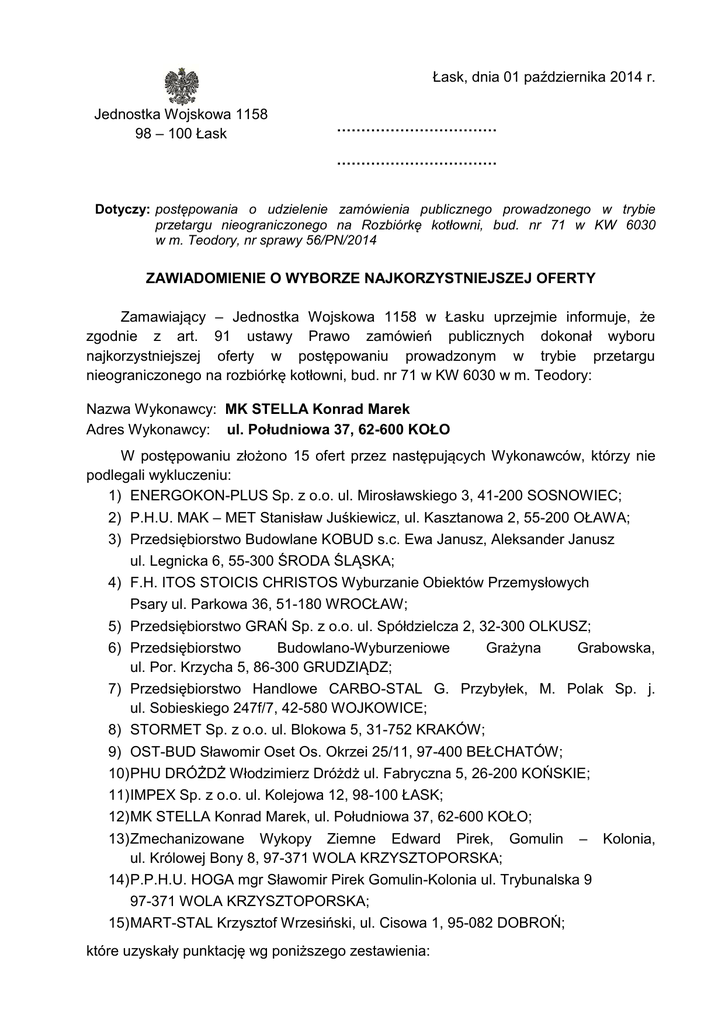 Łask, dnia 01 października 2014 r. Jednostka Wojskowa 1158 98 – 100 Łask …………………………… …………………………… Dotyczy: postępowania o udzielenie zamówienia publicznego prowadzonego w trybie przetargu nieograniczonego na Rozbiórkę kotłowni, bud. nr 71 w KW 6030 w m. Teodory, nr sprawy 56/PN/2014 ZAWIADOMIENIE O WYBORZE NAJKORZYSTNIEJSZEJ OFERTY Zamawiający – Jednostka Wojskowa 1158 w Łasku uprzejmie informuje, że zgodnie z art. 91 ustawy Prawo zamówień publicznych dokonał wyboru najkorzystniejszej oferty w postępowaniu prowadzonym w trybie przetargu nieograniczonego na rozbiórkę kotłowni, bud. nr 71 w KW 6030 w m. Teodory: Nazwa Wykonawcy: MK STELLA Konrad Marek Adres Wykonawcy: ul. Południowa 37, 62-600 KOŁO W postępowaniu złożono 15 ofert przez następujących Wykonawców, którzy nie podlegali wykluczeniu: 1) ENERGOKON-PLUS Sp. z o.o. ul. Mirosławskiego 3, 41-200 SOSNOWIEC; 2) P.H.U. MAK – MET Stanisław Juśkiewicz, ul. Kasztanowa 2, 55-200 OŁAWA; 3) Przedsiębiorstwo Budowlane KOBUD s.c. Ewa Janusz, Aleksander Janusz ul. Legnicka 6, 55-300 ŚRODA ŚLĄSKA; 4) F.H. ITOS STOICIS CHRISTOS Wyburzanie Obiektów Przemysłowych Psary ul. Parkowa 36, 51-180 WROCŁAW; 5) Przedsiębiorstwo GRAŃ Sp. z o.o. ul. Spółdzielcza 2, 32-300 OLKUSZ; 6) Przedsiębiorstwo Budowlano-Wyburzeniowe Grażyna Grabowska, ul. Por. Krzycha 5, 86-300 GRUDZIĄDZ; 7) Przedsiębiorstwo Handlowe CARBO-STAL G. Przybyłek, M. Polak Sp. j. ul. Sobieskiego 247f/7, 42-580 WOJKOWICE; 8) STORMET Sp. z o.o. ul. Blokowa 5, 31-752 KRAKÓW; 9) OST-BUD Sławomir Oset Os. Okrzei 25/11, 97-400 BEŁCHATÓW; 10) PHU DRÓŻDŻ Włodzimierz Dróżdż ul. Fabryczna 5, 26-200 KOŃSKIE; 11) IMPEX Sp. z o.o. ul. Kolejowa 12, 98-100 ŁASK; 12) MK STELLA Konrad Marek, ul. Południowa 37, 62-600 KOŁO; 13) Zmechanizowane Wykopy Ziemne Edward Pirek, Gomulin – Kolonia, ul. Królowej Bony 8, 97-371 WOLA KRZYSZTOPORSKA; 14) P.P.H.U. HOGA mgr Sławomir Pirek Gomulin-Kolonia ul. Trybunalska 9 97-371 WOLA KRZYSZTOPORSKA; 15) MART-STAL Krzysztof Wrzesiński, ul. Cisowa 1, 95-082 DOBROŃ; które uzyskały punktację wg poniższego zestawienia: Nr oferty Nazwa i adres wykonawcy 1 ENERGOKON-PLUS Sp. z o.o. ul. Mirosławskiego 3, 41-200, SOSNOWIEC 2 P.H.U. MAK – MET Stanisław Juśkiewicz ul. Kasztanowa 2, 55-200, OŁAWA 3 4 5 6 7 Przedsiębiorstwo Budowlane KOBUD s.c. Ewa Janusz, Aleksander Janusz ul. Legnicka 6, 55-300, ŚRODA ŚLĄSKA F.H. ITOS STOICIS CHRISTOS Wyburzanie Obiektów Przemysłowych Psary ul. Parkowa 36, 51-180, WROCŁAW Przedsiębiorstwo GRAŃ Sp. z o.o. ul. Spółdzielcza 2, 32-300, OLKUSZ Przedsiębiorstwo Budowlano-Wyburzeniowe Grażyna Grabowska ul. Por. Krzycha 5, 86-300, GRUDZIĄDZ Przedsiębiorstwo Handlowe CARBO-STAL G. Przybyłek, M. Polak Sp. j. ul. Sobieskiego 247f/7, 42-580, WOJKOWICE Uzyskane punkty w kryterium cena 46,06 Oferta odrzucona 23,06 57,14 Oferta odrzucona 92,30 Oferta odrzucona 8 STORMET Sp. z o.o. ul. Blokowa 5, 31-752, KRAKÓW 57,27 9 OST-BUD Sławomir Oset Os. Okrzei 25/11, 97-400, BEŁCHATÓW 11,27 10 PHU DRÓŻDŻ Włodzimierz Dróżdż ul. Fabryczna 5, 26-200, KOŃSKIE 35,16 11 IMPEX Sp. z o.o. ul. Kolejowa 12, 98-100, ŁASK 29,35 12 MK STELLA Konrad Marek ul. Południowa 37, 62-600, KOŁO 100,00 13 14 15 Zmechanizowane Wykopy Ziemne Edward Pirek Gomulin – Kolonia, ul. Królowej Bony 8 97-371, WOLA KRZYSZTOPORSKA P.P.H.U. HOGA mgr Sławomir Pirek Gomulin-Kolonia ul. Trybunalska 9 97-371, WOLA KRZYSZTOPORSKA MART-STAL Krzysztof Wrzesiński ul. Cisowa 1, 95-082, DOBROŃ 66,04 77,60 69,92 ZAWIADOMIENIE O ODRZUCENIU OFERT Na podstawie art. 92 ust. 1 pkt 2 ustawy – Prawo zamówień publicznych Zamawiający informuje o odrzuceniu następujących ofert: - na podstawie art. 89 ust. 1 pkt. 2 i 6 ustawy Prawo zamówień publicznych Nr 5 - Przedsiębiorstwo GRAŃ Sp. z o.o. ul. Spółdzielcza 2, 32-300 OLKUSZ, Nr 7 - Przedsiębiorstwo Handlowe CARBO-STAL G. Przybyłek, M. Polak Sp. j. ul. Sobieskiego 247f/7, 42-580 WOJKOWICE, ponieważ jej treść nie odpowiadała treści specyfikacji istotnych warunków zamówienia i zawierała błędy w obliczeniu ceny; - na podstawie art. 89 ust. 1 pkt. 2 ustawy Prawo zamówień publicznych Nr 2 - P.H.U. MAK – MET Stanisław Juśkiewicz, ul. Kasztanowa 2, 55-200 OŁAWA, ponieważ ich treść nie odpowiadała treści specyfikacji istotnych warunków zamówienia. Jednocześnie Zamawiający informuje, iż zgodnie z wyborem najkorzystniejszej oferty zawrze umowę z Wykonawcą, którego oferta była najkorzystniejsza w postępowaniu o udzielenie zamówienia publicznego na rozbiórkę kotłowni, bud. nr 71 w KW 6030 w m. Teodory. Zgodnie z art. 94 ust. 1 pkt 2) termin po upływie którego umowa w sprawie zamówienia publicznego może być zawarta to: 06.10.2014 r. DOWÓDCA (-) zu. ppłk mgr inż. Zbigniew ROSIAK
