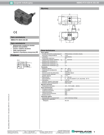 Czujnik indukcyjny NBN3-F31-E8-K-3G-3D Wymiary 65 33,5 I II 5 14 25 9 5,4 36 LED S Opis zamówienia 7 NBN3-F31-E8-K-3G-3D 30 Opis zamówienia • • • • Bezpośredni montaż do standardowych rozruszników Zwarta i stabilna obudowa Stałe wyjustowanie Zgodnie z Dyrektywą maszynową WE Dane ogólne Funkcja elementów przełączających Nominalny zasięg działania sn Instalacja Polaryzacja wyjżciowa Zapewniony dystans działania sa Współczynnik redukcyjny rAl Współczynnik redukcyjny rCu Współczynnik redukcyjny rV2A Współczynnik redukcyjny rSt37 Parametry Napięcie robocze UB Częstotliwożć przełączania f histereza H Ochrona przed złą polaryzacją Ochrona przed zwarciem spadek napięcia Ud Prąd roboczy IL Prąd resztkowy Ir Prąd jałowy I0 Wskażnik napięcia roboczego Wskażnik stanu przełączenia Warunki otoczenia Temperatura otoczenia Dane mechaniczne Przyłącze (system) Przekrój żył (system) Materiał obudowy Powierzchnia pomiarowa Rodzaj ochrony Informacje ogólne Zastosowanie w przestrzeniach zagrożonych wybuchem Kategoria PNPpodwójny normalnie otwarty 3 mm zabudowany DC 0 ... 2,43 mm 0,5 0,4 1 1,2 10 ... 30 V 0 ... 500 Hz zwykle 5 % wszystkie złącza pulsująca ≤3V 0 ... 100 mA 0 ... 0,5 mA zwykle 0,1 µA przy temp. 25 °C ≤ 25 mA Zielona dioda Żółta dioda -25 ... 70 °C (248 ... 343 K) 5 m, kabel PVC 0.75 mm? PBT PBT IP67 patrz instrukcja obsługi 3G; 3D Data publikacji: 2009-10-23 16:33 Data wydania: 2009-10-23 211279_POL.xml Przyłącze Dane techniczne Niezbêdne zmiany podyktowane postêpem technicznym pozostaj¹ zastrze¿one Pepperl+Fuchs Group USA: +1 330 486 0001 Germany: +49 621 776-4411 www.pepperl-fuchs.com [email protected] [email protected] Copyright Pepperl+Fuchs Singapore: +65 6779 9091 [email protected] 1 Czujnik indukcyjny ATEX 3G (nA) Instrukcja obsługi Kategoria urządzenia 3G (nA) zgodność z wytycznymi Zgodnożć norm NBN3-F31-E8-K-3G-3D Urządzenia elektryczne dla przestrzeni zagrożonych wybuchem do użytku w przestrzeniach zagrożonych wybuchem gazu, oparów i mgły. 94/9/EG EN 60079-0:2006, EN 60079-15:2005 Zabezpieczenie przed zapłonem typu "n" ograniczenie przez następujące warunki Oznakowanie CE Znak Ex Informacje ogólne Instalacja, uruchomienie Konserwacja, serwis ¬ II 3G Ex nA IIC T6 X Urządzenie należy używać zgodnie z danymi katalogowymi oraz danymi zawartymi w tej instrukcji obsługi. Podane dane katalogowe ograniczone są przez tą instrukcję obsługi! Należy przestrzegać warunków szczególnych! Należy przestrzegać przepisów prawnych i/lub rozporządzeń i norm regulujących użycie lub też użycia zgodnego z przeznaczeniem. Nie wolno dokonywać żadnych zmian przy urządzeniach przeznaczonych do pracy w przestrzeniach zagrożonych wybuchem. Wykonywanie napraw tych urządzeń nie jest możliwe. Szczególne warunki Maksymalny prąd obciążenia IL Data publikacji: 2009-10-23 16:33 Data wydania: 2009-10-23 211279_POL.xml Maksymalne dopuszczalne wartości prądu obciążenia są ograniczone do wartości podanych w następującej liście. Wyższe wartości prądu obciążenia i zwarcia nie są dopuszczalne. Maksymalne napięcie robocze UBmax Maksymalne dopuszczalne wartości napięcia roboczego UBmax ograniczone są do wartości podanych w następującej liście, tolerancja nie jest dopuszczalna. w zależności od prądu obciążenia IL i max. napięcia roboczego UBmax. Maksymalna dopuszczalna temperaDane zawarte są w następującej liście. tura otoczenia TUmax 43 °C gdy UBmax=30 V, IL=100 mA 45 °C gdy UBmax=30 V, IL=50 mA Ochrona przed uszkodzeniami mecha- Czujnik nie może być narażony na ŻADNE mechaniczne uszkodzenia. nicznymi Ochrona przed żwiatłem UV Czujnik i przewód instalacyjny należy chronić przed szkodliwym promieniowaniem UV. Możliwe jest to przez montaż wewnątrz pomieszczeń. Ochrona przewodu instalacyjnego Należy chronić przewód instalacyjny przed naprężeniem i przekręceniem. 2 Niezbêdne zmiany podyktowane postêpem technicznym pozostaj¹ zastrze¿one Pepperl+Fuchs Group USA: +1 330 486 0001 Germany: +49 621 776-4411 www.pepperl-fuchs.com [email protected] [email protected] Copyright Pepperl+Fuchs Singapore: +65 6779 9091 [email protected] Czujnik indukcyjny ATEX 3D (tD) Instrukcja obsługi Kategoria urządzenia 3D zgodność z wytycznymi Zgodnożć norm NBN3-F31-E8-K-3G-3D Urządzenia elektryczne dla przestrzeni zagrożonych wybuchem do użytku w przestrzeniach zagrożonych wybuchem z obecnością palnego pyłu 94/9/EG EN 61241-0:2006, EN 61241-1:2004 ochrona przez obudowÄ™ âÄžtDâÄ″ ograniczenie przez następujące warunki Oznakowanie CE Znak Ex Informacje ogólne Instalacja, uruchomienie Konserwacja, serwis ¬ II 3D Ex tD A22 IP67 T80°C X Urządzenie należy używać zgodnie z danymi katalogowymi oraz danymi zawartymi w tej instrukcji obsługi. MaksymalnÄ… temperaturÄ™ powierzchni okreĹ›lono na podstawie metody A bez warstwy pyĹ‚u na materiale. Podane dane katalogowe ograniczone są przez tą instrukcję obsługi! Należy przestrzegać warunków szczególnych! Należy przestrzegać przepisów prawnych i/lub rozporządzeń i norm regulujących użycie lub też użycia zgodnego z przeznaczeniem. Nie wolno dokonywać żadnych zmian przy urządzeniach przeznaczonych do pracy w przestrzeniach zagrożonych wybuchem. Wykonywanie napraw tych urządzeń nie jest możliwe. Szczególne warunki Maksymalny prąd obciążenia IL Data publikacji: 2009-10-23 16:33 Data wydania: 2009-10-23 211279_POL.xml Maksymalne dopuszczalne wartości prądu obciążenia są ograniczone do wartości podanych w następującej liście. Wyższe wartości prądu obciążenia i zwarcia nie są dopuszczalne. Maksymalne napięcie robocze UBmax Maksymalne dopuszczalne wartości napięcia roboczego UBmax ograniczone są do wartości podanych w następującej liście, tolerancja nie jest dopuszczalna. Maksymalna dopuszczalna temperaw zależności od prądu obciążenia IL i max. n