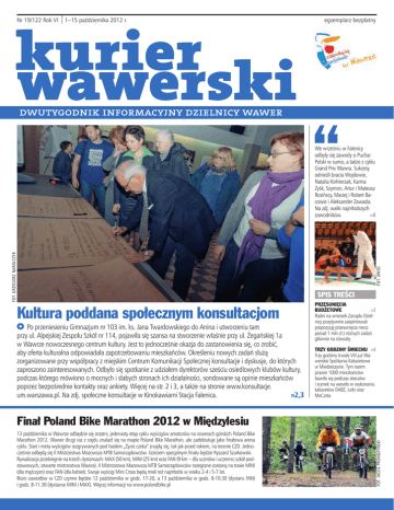 Nr 19/122 Rok VI 1–15 października 2012 r. egzemplarz bezpłatny fot. AWOJ Spis treści Kultura poddana społecznym konsultacjom Po przeniesieniu Gimnazjum nr 103 im. ks. Jana Twardowskiego do Anina i utworzeniu tam przy ul. Alpejskiej Zespołu Szkół nr 114, pojawiła się szansa na stworzenie właśnie przy ul. Żegańskiej 1a w Wawrze nowoczesnego centrum kultury. Jest to jednocześnie okazja do zastanowienia się, co zrobić, aby oferta kulturalna odpowiadała zapotrzebowaniu mieszkańców. Określeniu nowych zadań służą zorganizowane przy współpracy z miejskim Centrum Komunikacji Społecznej konsultacje i dyskusje, do których zaproszono zainteresowanych. Odbyło się spotkanie z udziałem dyrektorów sześciu osiedlowych klubów kultury, podczas którego mówiono o mocnych i słabych stronach ich działalności, sondowane są opinie mieszkańców poprzez bezpośrednie kontakty oraz ankiety. Więcej na str. 2 i 3, a także na stronie www.konsultacje. »2,3 um.warszawa.pl. Na zdj. społeczne konsultacje w Kinokawiarni Stacja Falenica. PRZESUNIĘCIA BUDŻETOWE »2 Radni na wniosek Zarządu Dzielnicy pozytywnie zaopiniowali propozycję przesunięcia nieco ponad 1 mln zł z różnych zadań głównie na oświatę. TRZY GODZINY ŚMIECHU »4 Trzy godziny trwały VIII już Wawerskie Spotkania Kabaretowe w Miedzeszynie. Tym razem prawie 1000 mieszkańców bawiło się podczas skeczów i scenek na wesoło w wykonaniu kabaretów DABZ, Jurki oraz MoCarta. Finał Poland Bike Marathon 2012 w Międzylesiu 13 października w Wawrze odbędzie się ostatni, jedenasty etap cyklu wyścigów amatorów na rowerach górskich Poland Bike Marathon 2012. Wawer drugi raz z rzędu znalazł się na mapie Poland Bike Marathon, ale zadebiutuje jako finałowa arena cyklu. Start i meta wyścigów rozgrywanych pod hasłem „Życie czeka” znajdą się, tak jak przed rokiem, na terenie CZD. Jednocześnie odbędą się II Mistrzostwa Mazowsza MTB Samorządowców. Gościem specjalnym finału będzie Ryszard Szurkowski. Rywalizacja przebiegnie na trzech dystansach: MAX (50 km), MINI (25 km) oraz FAN (9 km – dla uczniów i uczennic szkół podstawowych, otwarte mistrzostwa Wawra). II Mistrzostwa Mazowsza MTB Samorządowców rozegrane zostaną na trasie MINI (dla mężczyzn) oraz FAN (dla kobiet). Swoje wyścigi Mini Cross będą mieli też najmłodsi w wieku 2-4 i 5-7 lat. Biuro zawodów w CZD czynne będzie 12 października w godz. 17-20, a 13 października w godz. 8-10.30 (dystans FAN) i godz. 8-11.30 (dystanse MINI i MAX). Więcej informacji na www.polandbike.pl fot. JACEK PRONDZYŃSKI Fot. GRZEGORZ NAROJCZYK We wrześniu w Falenicy odbyły się zawody o Puchar Polski w sumo, a także z cyklu Grand Prix Wawra. Sukcesy odnieśli bracia Wojdowie, Natalia Kołnierzak, Karina Zyśk, Szymon, Artur i Mateusz Rosińscy, Maciej i Robert Bacowie i Aleksander Zawada. Na zdj. walki najmłodszych zawodników. »8 2 OD MARYSINA PO FALENICĘ Kurier KULTURALNY Konsultacje i warsztaty Podziel się opinią na temat oferty kulturalnej Wawra. Stwórz z nami wizję rozwoju kultury w Twojej dzielnicy – wszystkie pomysły są dla nas ważne. Odbyły się już konsultacje społeczne. Można jeszcze uczestniczyć w warsztatach konsultacyjnych w październiku: 16 w godz. 17 – 21 w bibliotece przy ul. Żegańskiej 1a, 18 – w godz. 17 – 21 w SP nr 109 przy ul. Przygodnej 2, 24 – dla młodzieży, w godz. 13 – 17 w XXV, ul. Halna 20, a w listopadzie 10, w godz. 10 – 14 w KK Marysin, ul. Korkowa 96. Wymagane są wcześniejsze (najpóźniej na dwa dni przed terminem, decyduje kolejność) zgłoszenia drogą e-mailową [email protected]. pl lub telefoniczną, nr 22 443 68 98. Opinie na temat organizacji i działań kulturalnych w dzielnicy można przesyłać pod adresem: Urząd Dzielnicy Wawer, ul. Żegańska 1, 04-713 Warszawa, z dopiskiem „konsultacje” lub zgłaszać je na forum WWW. konsultacje.um.warszawa. pl Kurier KONKURSOWY Nie zwlekajcie ze zdjęciami Kurier samorządowy | WRZEŚNIOWA Sesja Rady Dzielnicy Przesunięcia budżetowe i opinie Podczas wrześniowego posiedzenia Rady Dzielnic zarząd wystąpił z wnioskiem o dokonanie przesunięć w budżecie 2012. Dotyczyło to kwoty niewiele przekraczającej 1 mln zł w dziale wydatków bieżących, na którą złożyły się na przykład oszczędności w wysokości 375 tys. zł, stanowiące część funduszu płac w Urzędzie Dzielnicy, 145 tys. zł będące w dyspozycji wydziału sportu i rekreacji, 82 tys. zł przeznaczone dotąd na pomoc społeczną, 176 tys. zł. znajdujące się na rachunku działu gospodarka komunalna i ochrona środowiska. Nieco ponad 213 tys. zł przeznaczono na dotacje dla niepublicznych przedszkoli, prawie 335 tys. zł na dotacje dla przedszkoli specjalnych. 210,5 tys. zł przeznaczono na prowadzenie gimnazjów, w tym 184 tys. zł to dotacja dla niepublicznych. Potrzeby finansowe w wysokości 184 tys. zł miały także wawerskie licea niepubliczne. Ponad 12 tys. zł skierowano na remonty w szkołach, a o 5 tys. zł zwiększono środki przeznaczone na dowożenie dzieci do szkół. Kwotą 18 tys. zł wsparto działalność bieżącą Klubu Kultury Radość. Rada na tym posiedzeniu wyraziła swą opinię na temat projektu miejscowego planu zagospodarowania przestrzennego obszaru węzła Marsa – Płowiecka, który był już wcześniej prezentowany na komisji ładu przestrzennego. Radni pozytywnie zaopiniowali ten projekt, ale z pewnymi uwagami. Opowiedzieli się za zmianami dotyczącymi linii rozgraniczenia ulic Szumnej, Sępiej i Kalinowskiej, spełniającymi wnioski mieszkańców. Wychodząc z założenia, że założenia planu powinny uwzględniać perspektywiczne rozwiązania komunikacyjne, sprzyjające rozwojowi dzielnicy, zgłosili propozycję usytuowania pętli autobusowej w pobliżu stacji PKP Gocławek i połączenia jej z Pragą Południe poprzez poszerzenie ul. Makowskiej w miejscu, gdzie przewidywany był tylko ciąg pieszy. R
