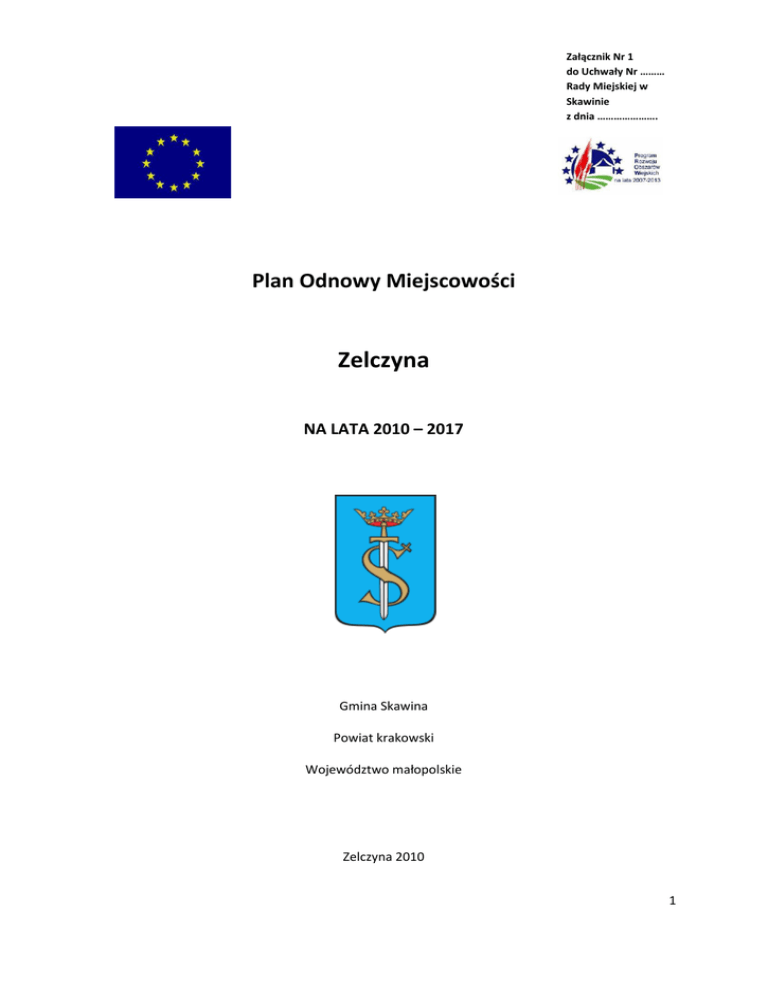 Załącznik Nr 1 do Uchwały Nr ……… Rady Miejskiej w Skawinie z dnia …………………. Plan Odnowy Miejscowości Zelczyna NA LATA 2010 – 2017 Gmina Skawina Powiat krakowski Województwo małopolskie Zelczyna 2010 1 PLAN ODNOWY MIEJSCOWOŚCI ZELCZYNA Spis treści Wstęp 1. Charakterystyka miejscowości Zelczyna 1.1. Położenie miejscowości, przynależnośd administracyjna, powierzchnia, liczba ludności. 1.2. Historia miejscowości ze szczególnym uwzględnieniem wydarzeo mających wpływ na powstanie układu przestrzennego. 1.3. Określenie przestrzennej struktury miejscowości. 2. Inwentaryzacja zasobów służących odnowie miejscowości 2.1. Zasoby przyrodnicze 2.2. Dziedzictwo kulturowe 2.3. Obiekty i tereny 2.4. Infrastruktura społeczna, infrastruktura techniczna, gospodarka i rolnictwo 2.5. Kapitał społeczny i ludzki 3. Ocena mocnych i słabych stron miejscowości Zelczyna 4. Wizja Rozwoju Zelczyny 4.1 Dlaczego chcemy odnowy wsi? 4.2 Jak się zorganizujemy? 4.3 Nasza wizja – jakie ma byd nasze życie? 4.4 Misja 5. Opis planowanych zadao inwestycyjnych i przedsięwzięd aktywizujących społecznośd lokalną w okresie 2010-2017 (w kolejności wynikającej z przyjętych priorytetów rozwoju miejscowości) 6. Podsumowanie 2 Wstęp Rozwój i odnowa obszarów wiejskich stanowi kluczowe wyzwanie dla Polski w okresie integracji z Unią Europejską. Zasadniczym celem jest wzmocnienie działao służących zmniejszaniu dysproporcji i różnic w poziomie rozwoju obszarów wiejskich w stosunku do terenów miejskich. Plan odnowy miejscowości jest jednym z najważniejszych elementów odnowy wsi, jej rozwoju oraz poprawy warunków pracy i życia mieszkaoców. W Planie mieszkaocy wsi określają własne zasoby (co wyróżnią naszą wieś, kim są mieszkaocy, jakie tradycje pielęgnują, jaki wygląd ma miejscowośd, jaką posiadamy infrastrukturę) i potrzeby (co nam najbardziej przeszkadza, jakie są dla nas najistotniejsze działania inwestycyjne, społeczne, dla dzieci i młodzieży, jak poprawid wizerunek naszej miejscowości). Uwarunkowania Planu odnowy miejscowości polegają na tym, że ma on zdecentralizowany, lokalny charakter, obejmuje ograniczony teren jednej miejscowości i przygotowywany jest (przy udziale przedstawicieli gminy) z inicjatywy i przez mieszkaoców miejscowości. Specyfika planu polega na tym, że jest on ukierunkowany na zagadnienia cywilizacyjno - kulturowe, koncentruje się na prostych, lokalnych przedsięwzięciach, które prowadzid mają do poprawy standardu i jakości życia mieszkaoców. Celem planu jest podtrzymanie lub odtworzenie atrakcyjności wsi jako miejsca zamieszkania i zaplanowanie oraz przeprowadzenie tego w sposób oczekiwany i popierany przez lokalną społecznośd. Jest to szczególnie ważne w dzisiejszej sytuacji, gdy miasta oferują konkurencyjną alternatywę zamieszkania, a rolnictwo traci swą atrakcyjnośd jako źródło utrzymania, co prowadzi m.in. do migracji młodych ludzi, szczególnie tych lepiej wykształconych ze wsi do miasta. Idea odnowy wsi wyrasta z przekonania, że odnowiona, doinwestowana i ożywiona kulturowo wieś odzyska swoją atrakcyjnośd jako miejsce zamieszkania. Zapewni ona swoim mieszkaocom godziwy standard i jakośd życia oraz zdoła zatrzymad młodzież na miejscu, nie jako „mini-miasto”, wysoko zurbanizowane i konkurujące z ośrodkami miejskimi bogactwem oferty, ale właśnie jako „nowa wieś”, nowoczesna, lecz ceniąca i zachowująca swój wiejski charakter i kulturową specyfikę. Plan odnowy ma więc charakter „planu małych kroków”, które podejmowane przez mieszkaoców przy finansowym i organizacyjnym wsparciu gminy, doprowadzid mają do trwałej poprawy miejscowych warunków życia. Plan Odnowy Miejscowości Zelczyna obejmuje swoim zasięgiem obszar tej miejscowości. Niniejsze opracowanie zawiera charakterystykę miejscowości, inwentaryzację zasobów służącą ujęciu stanu rzeczywistego, analizę SWOT czyli mocne i słabe strony miejscowości, planowane kierunki rozwoju oraz przedsięwzięcia wraz z szacunkowym kosztem i okresem realizacji. Plan Odnowy Miejscowości stanowi więc nie tylko plan działao, ale przede wszystkim jest swoistą deklaracją mieszkaoców do podjęcia wysiłków na rzecz poprawy jakości życia w swojej miejscowości. Jakośd życia mieszkaoców, obok inwestycji zewnętrznych, zależy bowiem również od ludzkiej aktywności, umiejętności współpracy i pozytywnego myślenia. Dokument został opracowany przez społecznośd wsi Zelczyna przy współpracy i merytorycznym wsparciu Zespołu ds. pozyskiwania środków zewnętrznych Urzędu Miasta i Gminy w Skawinie oraz Lokalnej Grupy Działania „Blisko Krakowa”. W pracach nad planem uczestniczyli Sołtys, Przedstawiciele Rady Sołeckiej, Rady Miasta oraz dyrekcja i pracownicy Szkoły Podstawowej. 3 Plan Odnowy Miejscowości jest zgodny z następującymi dokumentami strategicznymi: Strategią Rozwoju Gminy Skawina na lata 2003-2013 Cele strategiczne: 1. Tworzenie warunków dla przyspieszonego rozwoju gospodarczego gminy. 2. Tworzenie warunków dla podniesienia standardu i jakości życia mieszkaoców. 3. Osiągnięcie europejskich standardów w zakresie ochrony środowiska i infrastruktury komunalnej. Strategią Rozwoju Powiatu Krakowskiego na lata 2008-2013 Cel strategiczny 1: Poprawa stanu środowiska naturalnego na terenie powiatu Cel strategiczny 2: Poprawa dostępności komunikacyjnej powiatu Cel strategiczny 5: Rozwój turystyki z wykorzystaniem walorów przyrodniczych i kulturowych powiatu Cel strategiczny 8: Wzmacnianie działao z zakresu ochrony i promocji zdrowia Cel strategiczny 9: Zwiększenie efektywności i skuteczności systemu edukacyjnego na terenie powiatu Cel strategiczny 10: Podniesienie poziomu bezpieczeostwa mieszkaoców powiatu Cel strategiczny 11: Zwiększenie ochrony i opieki nad zabytkami Cel strategiczny 12: Wspieranie integracji kulturalnej mieszkaoców powiatu Str