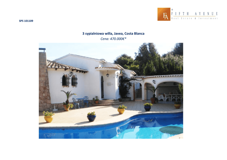 SPS 101109 3 sypialniowa willa, Javea, Costa Blanca Cena: 470.000€* Lokalizacja: Willa położona jest w miejscowości Javea. Ok. 5 km na północ od Benitachell i ok.15 km na północ od Calpe, na wybrzeżu Costa Blanca. Opis willi: Jednopoziomowa willa, 3 sypialnie, 2 łazienki. Salon łączony z jadalnią, kuchnia, pomieszczenie magazynowe. Kominek, centralne ogrzewanie gazowe. Prywatny basen o długości 17m. Grill oraz letnia kuchnia. 2 miejsca garażowe. Sypialnie: 3 Łazienki: 2 Powierzchnia: 120m2 Powierzchnia działki: 981m2 *do ceny należy doliczyć podatki i koszty zakupu: 7% VAT, ok. 1% prawnik, 1-2% opłaty notarialne i wpis do hipoteki Kontakt i dodatkowe informacje: Marek Gąsiewski tel. 22 8286363 kom.501261523 www.fifthavenue.pl e-mail: [email protected]