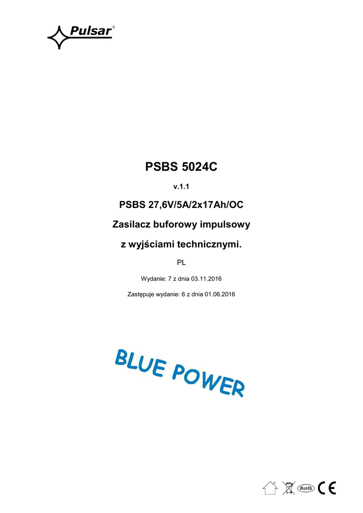 PSBS 5024C v.1.1 PSBS 27,6V/5A/2x17Ah/OC Zasilacz buforowy impulsowy z wyjściami technicznymi. PL Wydanie: 7 z dnia 03.11.2016 Zastępuje wydanie: 6 z dnia 01.06.2016 www.pulsar.pl BLUE POWER PSBS5024C Cechy zasilacza: bezprzerwowe zasilanie DC 27,6V/5A alternatywne wyjścia AUX1, AUX2, AUX3 ograniczone prądowo 3x1,25A miejsce na akumulatory 2x17Ah/12V napięcie zasilania AC 230V wysoka sprawność 81% niski poziom tętnień napięcia kontrola ładowania i konserwacji akumulatorów ochrona akumulatorów przed nadmiernym rozładowaniem (UVP) prąd ładowania akumulatorów 0,5A/1A/2A/3A przełączany zworką przycisk START załączenia akumulatorów zabezpieczenie wyjścia akumulatorów przed zwarciem i odwrotnym podłączeniem sygnalizacja optyczna LED wyjście techniczne EPS zaniku sieci 230V – typu OC wyjście techniczne PSU awarii zasilacza – typu OC wyjście techniczne LoB niskiego napięcia akumulatorów – typu OC opcja montażu modułu przekaźnikowego MPSBS zmieniającego wyjścia techniczne typu OC na przekaźnikowe regulowane czasy sygnalizacji zaniku sieci 230V AC zabezpieczenia: przeciwzwarciowe SCP termiczne OHP przepięciowe przeciążeniowe OLP nadnapięciowe OVP antysabotażowe: otwarcie obudowy oderwanie od podłoża gwarancja – 5 lat od daty produkcji SPIS TREŚCI: 1. Opis techniczny. 1.1 Opis ogólny 1.2 Schemat blokowy 1.3 Opis elementów i złącz zasilacza 1.4 Parametry techniczne 2. Instalacja. 2.1 Wymagania 2.2 Procedura instalacji 3. Sygnalizacja pracy zasilacza. 3.1 Sygnalizacja optyczna pracy 3.2 Wyjścia techniczne 3.3 Wyjścia techniczne przekaźnikowe 4. Obsługa oraz eksploatacja. 4.1 Przeciążenie lub zwarcie wyjścia zasilacza (zadziałanie SCP) 4.2 Uruchomienie zasilacza z akumulatorów 4.3 Ochrona akumulatorów przed nadmiernym rozładowaniem UVP 4.4 Konserwacja 1. Opis techniczny. 1.1 Opis ogólny. Zasilacz buforowy przeznaczony jest do nieprzerwanego zasilania urządzeń wymagających stabilizowanego napięcia 24V DC (+/-15%). Zasilacz dostarcza napięcia U=27,6V DC o wydajności prądowej: 1. Prąd wyjściowy 5A + 0,5A ładowanie akumulatorów 2. Prąd wyjściowy 4,5A + 1A ładowanie akumulatorów 3. Prąd wyjściowy 3,5A + 2A ładowanie akumulatorów 4. Prąd wyjściowy 2,5A + 3A ładowanie akumulatorów Sumaryczny prąd odbiorników + akumulatory wynosi max 5,5A W przypadku zaniku napięcia sieciowego następuje natychmiastowe przełączenie na zasilanie akumulatorowe. Zasilacz umieszczony jest w obudowie metalowej (kolor RAL 9003) z miejscem na akumulatory 2x17Ah/12V. Obudowa wyposażona jest w mikroprzełącznik sygnalizujący otwarcie drzwiczek (czołówki) oraz oderwanie jej od podłoża. 2 www.pulsar.pl PSBS5024C BLUE POWER OPCJONALNE KONFIGURACJE ZASILACZA: (wizualizacja dostępna na www.pulsar.pl) 1. Zasilacz buforowy PSBS 27,6V/moduł przekaźnikowy MPSBS/2x17Ah - PSBS 5024C + MPSBS + 2x17Ah 2. Zasilacz buforowy PSBS 27,6V/8x0,5A/2x17Ah - PSBS 5024C + LB8 8x0,5A (AWZ578, AWZ580) + 2x17Ah 3. Zasilacz buforowy PSBS 27,6V/4x1A/2x17Ah - PSBS 5024C + LB4 4x1A (AWZ575, AWZ576) + 2x17Ah 4. Zasilacz buforowy PSBS 27,6V/2x24V/2x2,5A/2x17Ah - PSBS 5024C + 2xRN25024 (27,6V/24V) + 2x17Ah 5. Zasilacz buforowy PSBS 27,6V/24V/4x1A/2x17Ah - PSBS 5024C + RN25024 (27,6V/24V) + LB4 4x1A (AWZ575, AWZ576) + 2x17Ah 6. Zasilacz buforowy PSBS 27,6V/5V÷18V/2A÷1,3A/2x17Ah - PSBS 5024C + DCDC20 (5V÷18V/2A÷1,3A) + 2x17Ah 1.2 Schemat blokowy (rys.1). Rys.1. Schemat blokowy zasilacza. 3 www.pulsar.pl PSBS5024C 1.3 Opis elementów i złącz zasilacza ( tab.1, rys.2). Tabela 1. Elementy płyty pcb zasilacza (patrz rys. 2). Element nr Opis Zworka PBAT - konfiguracja funkcji ochrony akumulatorów UVP PBAT = funkcja ochrony (odłączenia) akumulatorów wyłączona PBAT = funkcja ochrony (odłączenia) akumulatorów włączona Zworka TAC - konfiguracja czasu opóźnienia sygnalizacji zaniku sieci AC TAC = czas opóźnienia T= 60s TAC = czas opóźnienia T= 10s Opis: zworka założona, zworka zdjęta START przycisk (uruchomienie zasilacza z akumulatorów) VADJ potencjometr, regulacja napięcia DC 24 ÷ 29V FBAT bezpiecznik w obwodzie akumulatorów, F6,3A / 250V Zaciski: ~AC~ – wejście zasilania AC EPS – wyjście techniczne sygnalizacji zaniku sieci AC stan hi-Z = awaria zasilania AC stan 0V = zasilanie AC - O.K. PSU – wyjście techniczne sygnalizacji awarii zasilacza stan hi-Z = awaria stan 0V = praca zasilacza O.K. LoB – wyjście techniczne sygnalizacji niskiego napięcia akumulatorów stan hi-Z = napięcie akumulatorów UBAT <23V stan 0V = akumulatory O.K. +BAT- – zaciski do podłączenia akumulatorów +AUX- – wyjście zasilania DC, (+AUX= +U, -AUX=GND) Opis: hi-Z – wysoka impedancja, 0V – zwarcie do masy GND Diody LED – sygnalizacja optyczna: AC – napięcie AC AUX, AUX1, AUX2, AUX3 – napięcie wyjściowe DC Złącze wyjścia dodatkowej zewnętrznej sygnalizacji optycznej Zworka IBAT; - konfiguracja prądu ładowania akumulatora J1= J2= J3= Ibat =0,5A J1= J2= J3= Ibat =1A J1= J2= J3= Ibat =2A J1= J2= J3= Ibat =3A Opis: zworka założona, zworka zdjęta LB – sygnalizacja optyczna ładowania akumulatorów OVP – sygnalizacja optyczna zadziałania układu nadnapięciowego Rys. 2. Widok płyty pcb zasilacza. 4 BLUE POWER www.pulsar.pl PSBS5024C BLUE POWER Tabela 2. Elementy zasilacza (patrz rys. 3). Element nr Opis Transformator separacyjny Płyta zasilacza (patrz tab. 1, rys. 2) TAMPER; mikrowyłącznik ochrony antysabotażowej (NC) FMAINS bezpiecznik w obwodzie zasilania 230V, T6,3A / 250V L-N zacisk zasilania 230V AC, Zacisk ochronny PE Konektory akumulatorów; dodatni: +BAT = czerwony, ujemny: - BAT = czarny Rys.3. Widok zasilacza. 5 www.pulsar.pl PSBS5024C BLUE POWER 1.4 Parametry techniczne: - parametry elektryczne (tabela 3) - parametry mechaniczne (tabela 4) - bezpieczeństwo użytkowania (tabela 5) - parametry eksploatacyjne (tabela 6) Tabela 3. Parametry elektryczne Typ zasilacza: Napięcie zasilania Pobór prądu Moc zasilacza Sp