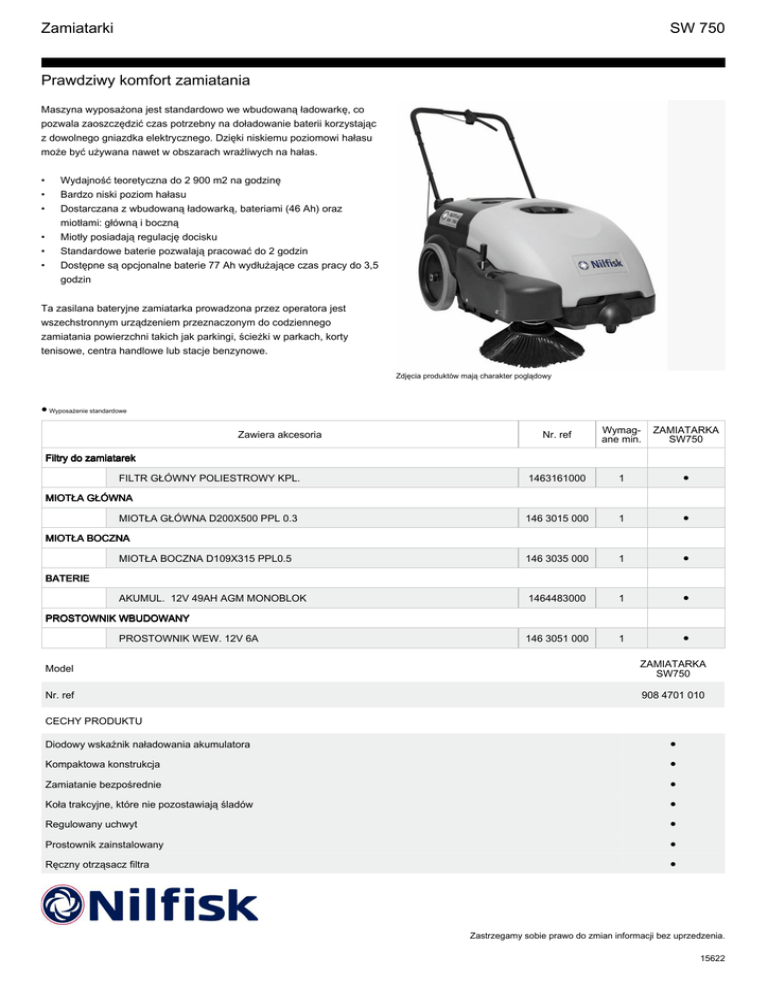 Zamiatarki SW 750 Prawdziwy komfort zamiatania Maszyna wyposażona jest standardowo we wbudowaną ładowarkę, co pozwala zaoszczędzić czas potrzebny na doładowanie baterii korzystając z dowolnego gniazdka elektrycznego. Dzięki niskiemu poziomowi hałasu może być używana nawet w obszarach wrażliwych na hałas. • • • • • • Wydajność teoretyczna do 2 900 m2 na godzinę Bardzo niski poziom hałasu Dostarczana z wbudowaną ładowarką, bateriami (46 Ah) oraz miotłami: główną i boczną Miotły posiadają regulację docisku Standardowe baterie pozwalają pracować do 2 godzin Dostępne są opcjonalne baterie 77 Ah wydłużające czas pracy do 3,5 godzin Ta zasilana bateryjne zamiatarka prowadzona przez operatora jest wszechstronnym urządzeniem przeznaczonym do codziennego zamiatania powierzchni takich jak parkingi, ścieżki w parkach, korty tenisowe, centra handlowe lub stacje benzynowe. Zdjęcia produktów mają charakter poglądowy ● Wyposażenie standardowe Nr. ref Wymag ane min. ZAMIATARKA SW750 1463161000 1 ● 146 3015 000 1 ● MIOTŁA BOCZNA D109X315 PPL0.5 146 3035 000 1 ● AKUMUL. 12V 49AH AGM MONOBLOK 1464483000 1 ● 146 3051 000 1 ● Zawiera akcesoria Filtry do zamiatarek FILTR GŁÓWNY POLIESTROWY KPL. MIOTŁA GŁÓWNA MIOTŁA GŁÓWNA D200X500 PPL 0.3 MIOTŁA BOCZNA BATERIE PROSTOWNIK WBUDOWANY PROSTOWNIK WEW. 12V 6A Model ZAMIATARKA SW750 Nr. ref 908 4701 010 CECHY PRODUKTU Diodowy wskaźnik naładowania akumulatora ● Kompaktowa konstrukcja ● Zamiatanie bezpośrednie ● Koła trakcyjne, które nie pozostawiają śladów ● Regulowany uchwyt ● Prostownik zainstalowany ● Ręczny otrząsacz filtra ● Zastrzegamy sobie prawo do zmian informacji bez uprzedzenia. 15622 Zamiatarki SW 750 Prawdziwy komfort zamiatania ZAMIATARKA SW750 Dane techniczne Poziom ciśnienia akustycznego (dB(A)) 59 Źródło napędu silnika Battery 12V Marka silnika Amer Prędkość maks. (km/h) 4 Wydajność zamiatania z 1 miotłą boczną teoretyczna/rzeczywista (m²/godz.) 2880/1730 Wydajność zamiatania z 2 miotłami teoretyczna/rzeczywista (m²/godz.) - Szerokość robocza z prawą miotłą boczną (MM) 720 Szerokość robocza z 2 miotłami bocznymi (MM) - Min. promień skrętu (cm) - Maks. stopień pokonywania wzniesień (%) 20 Pojemność zbiornika na śmieci (l) 60 Maks. wysokość opróżniania (cm) - Powierzchnia filtra głównego (m²) 1 Średnica szczotki bocznej (mm) 315 Prędkość szczotki bocznej (obr/min) 100 Prędkość miotły głównej (obr/min) 335 Miotła główna (mm) 500x200 Długość x szerokość x wysokość (cm) 99x80x110 Ciężar roboczy (kg) 68 ● Wyposażenie standardowe, ○ Akcesoria opcjonalne, □ Montaż w fabryce Nr. ref Wymag ane min. ZAMIATARKA SW750 1463161000 1 ● 1463167000 1 □ FARTUCH BOCZNY MIOTŁY 1463255000 1 □ ZESTAW DO WYKŁADZIN 1463171000 1 □ MIOTŁA GŁOWNA 200X500 PPL0.7PPL 1463174000 1 □ MIOTŁA GŁÓWNA 180X500 CHEVR 6R NYLON 146 3016 000 1 □ MIOTŁA GŁÓWNA D200X500 PPL 0.3 146 3015 000 1 ● AKUMUL. 12V 49AH AGM MONOBLOK 1464483000 1 ● AKUMUL. DISCOVER 12V 84Ah 1464853000 1 ○ Akcesoria Filtry do zamiatarek FILTR GŁÓWNY POLIESTROWY KPL. Fartuchy gumowe FARTUCHY GUMA NIEBRUDZĄCA INNE AKCESORIA MIOTŁA GŁÓWNA BATERIE MIOTŁA BOCZNA Zastrzegamy sobie prawo do zmian informacji bez uprzedzenia. 15622 Zamiatarki SW 750 Prawdziwy komfort zamiatania Nr. ref Wymag ane min. ZAMIATARKA SW750 MIOTŁA BOCZNA D109X315 NYLON 146 3036 000 1 □ MIOTŁA BOCZNA D109X315 PPL0.5 146 3035 000 1 ● 146 3051 000 1 ● Akcesoria PROSTOWNIK WBUDOWANY PROSTOWNIK WEW. 12V 6A Zastrzegamy sobie prawo do zmian informacji bez uprzedzenia. 15622