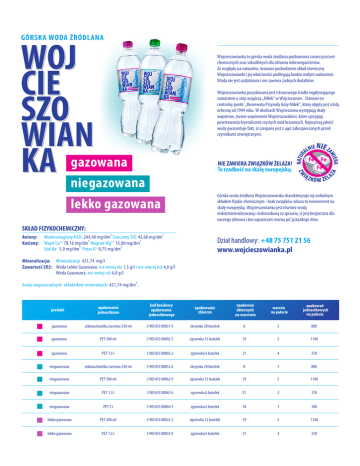 Wojcieszowianka to górska woda źródlana pozbawiona zanieczyszczeń chemicznych oraz szkodliwych dla zdrowia mikroorganizmów. Ze względu na naturalne, krasowe pochodzenie skład chemiczny Wojcieszowianki i jej właściwości podlegają bardzo małym wahaniom. Woda nie jest uzdatniana i nie zawiera żadnych dodatków. Wojcieszowianka pozyskiwana jest z krasowego źródła wypływającego samoistnie u stóp wzgórza „Miłek” w Wojcieszowie. Stanowi on centralny punkt „Rezerwatu Przyrody Góry Miłek”, który objęty jest ścisłą ochroną od 1944 roku. W okolicach Wojcieszowa występują skały wapienne, zwane wapieniami Wojcieszowskimi, które sprzyjają powstawaniu krystalicznie czystych wód krasowych. Najwyższą jakość wody gwarantuje fakt, iż czerpana jest z ujęć zabezpieczonych przed czynnikami zewnętrznymi. gazowana niegazowana lekko gazowana NIE ZAWIERA ZWIĄZKÓW ŻELAZA! To rzadkość na skalę europejską. Górska woda źródlana Wojcieszowianka charakteryzuje się unikalnym składem fizyko-chemicznym - brak związków żelaza to ewenement na skalę europejską. Wojcieszowianka jest również wodą niskozmineralizowaną i niskosodową co sprawia, iż jest bezpieczna dla naszego zdrowia i bez ograniczeń można pić ją każdego dnia. SKŁAD FIZYKOCHEMICZNY: 3 Aniony: Wodorowęglany HCO-3 244,40 mg/dm Siarczany SO24- 45,68 mg/dm 3 3 Kationy: Wapń Ca2+ 78,16 mg/dm Magnez Mg2+ 15,80 mg/dm 3 3 + + Sód Na 5,0 mg/dm Potas K 0,75 mg/dm 3 Dział handlowy: +48 75 751 21 56 www.wojcieszowianka.pl Mineralizacja: Mineralizacja 421,74 mg/l Zawartość CO2: Woda Lekko Gazowana: nie mniej niż 1,5 g/l i nie więcej niż 4,0 g/l Woda Gazowana: nie mniej niż 4,0 g/l 3 Suma rozpuszczalnych składników mineralnych: 421,74 mg/dm . produkt opakowanie jednostkowe kod kreskowy opakowania jednostkowego opakowanie zbiorcze opakowań zbiorczych na warstwie warstw na palecie opakowań jednostkowych na palecie gazowana szklana butelka zwrotna 330 ml 5 905453 00851 9 skrzynka 20 butelek 8 5 800 gazowana PET 500 ml 5 905453 00002 5 zgrzewka 12 butelek 19 5 1140 gazowana PET 1,5 l 5 905453 00003 2 zgrzewka 6 butelek 21 4 378 niegazowana szklana butelka zwrotna 330 ml 5 905453 00852 6 skrzynka 20 butelek 8 5 800 niegazowana PET 500 ml 5 905453 00062 9 zgrzewka 12 butelek 19 5 1140 niegazowana PET 1,5 l 5 905453 00063 6 zgrzewka 6 butelek 21 3 378 niegazowana PET 5 l 5 905453 00064 3 zgrzewka 6 butelek 18 3 108 lekko gazowana PET 500 ml 5 905453 00032 2 zgrzewka 12 butelek 19 5 1140 lekko gazowana PET 1,5 l 5 905453 00033 9 zgrzewka 6 butelek 21 4 378