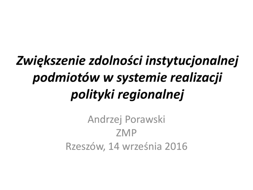 Zwiększenie zdolności instytucjonalnej podmiotów w systemie realizacji polityki regionalnej Andrzej Porawski ZMP Rzeszów, 14 września 2016 Perspektywa SOR Działania SOR wprost dotyczące miast (1) • Cel szczegółowy II – „Rozwój społecznie i terytorialnie zrównoważony”, w tym obszar „Rozwój terytorialnie zrównoważony”, a w jego ramach kierunki interwencji: 3. Rozwój miast – wsparcie horyzontalne. 4. Pełniejsze wykorzystanie potencjału rozwojowego aglomeracji. 5. Aktywizacja zasobów i potencjałów miast średnich, tracących funkcje społeczno-gospodarcze. a także: Działania SOR wprost dotyczące miast (2) 6. Rozwój obszarów wiejskich – wsparcie horyzontalne, a w tym: „wspomaganie rozwoju małych miast i centrów gminnych jako lokalnych ośrodków wzrostu”. 7. Rozwój obszarów wiejskich w oparciu o endogeniczne potencjały gospodarcze, a w tym: „wzmacnianie powiązań i współpracy z miastami na obszarach będących w zasięgu oddziaływania funkcjonalnego miast”. 8. Aktywizacja obszarów zagrożonych trwałą marginalizacją – „grupa obszarów wiejskich i połączonych z nimi funkcjonalnie mniejszych miast, w tym obszarów popegeerowskich położonych z dala od dużych ośrodków miejskich lub na styku granic województw”. Wpływ samorządów na realizację SOR • Planowanie rozwoju, ogólne i sektorowe. • Planowanie przestrzenne: - wymiar terytorialny, a nie administracyjny, - odwzorowanie terytorialne planów rozwoju. • Inwestycje lokalne i regionalne: - skala (ok. 40 mld rocznie, w tym 79 % miasta i gminy), - kierunki (rozwój infrastruktury lokalnej i regionalnej). • Polityka społeczna – gminne i powiatowe strategie rozwiązywania problemów społecznych. Główne wyzwania • Konieczność zintegrowanego planowania rozwoju w dłuższej perspektywie • Konieczność podejmowania działań w obszarach funkcjonalnych, a nie w granicach administracyjnych • Konieczność współdziałania gmin, powiatów i regionów • Konieczność współdziałania z sektorami niepublicznymi Najważniejsze ograniczenia • Brak kadr przygotowanych do sprostania tym wyzwaniom • Brak kultury współdziałania • Brak rozwiązań prawnych, ułatwiających współdziałanie Rekomendacje (1) • Zintegrowany krajowy program kształcenia kadr: - zintegrowane zarzadzanie (planowanie i zarządzanie strategiczne, wymiar przestrzenny, wymiar finansowy), - współpraca podmiotów 3 sektorów, - partycypacja społeczna, komunikacja społeczna, transparentność działania, udostępnianie informacji publ., - rewitalizacja jako narzędzie polityki rozwoju, - aktywne gospodarowanie majątkiem, - wykorzystanie partnerstwa publiczno-prywatnego. Rekomendacje (2) • Zmiany legislacyjne: - Uelastycznienie rozwiązań instytucjonalnych (wspólne „CUWy terytorialne”); - Wprowadzenie nowych rozwiązań instytucjonalnych (zespoły współpracy terytorialnej albo pro-rozwojowe związki komunalne w OF; konsorcja dla rozwoju); - Wprowadzenie nowych rozwiązań merytorycznych: o ramowe studium przestrzenne (kierunki rozwoju), powiązane ze strategią rozwoju OF, o wspólna strategia rozwiązywania problemów społ. OF, o wspólne plany transportowo-drogowe OF; o wspólne analizy potrzeb rynku pracy OF;
