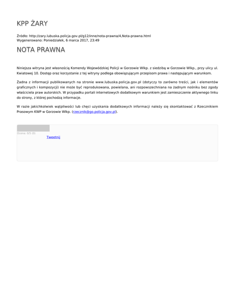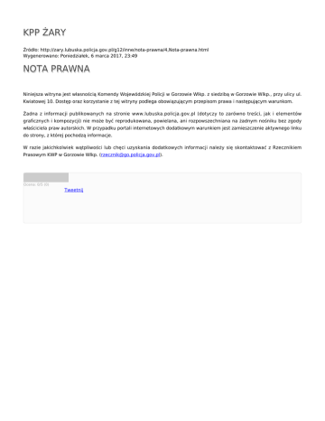 KPP ŻARY Źródło: http://zary.lubuska.policja.gov.pl/g12/inne/nota-prawna/4,Nota-prawna.html Wygenerowano: Poniedziałek, 6 marca 2017, 23:49 NOTA PRAWNA Niniejsza witryna jest własnością Komendy Wojewódzkiej Policji w Gorzowie Wlkp. z siedzibą w Gorzowie Wlkp., przy ulicy ul. Kwiatowej 10. Dostęp oraz korzystanie z tej witryny podlega obowiązującym przepisom prawa i następującym warunkom. Żadna z informacji publikowanych na stronie www.lubuska.policja.gov.pl (dotyczy to zarówno treści, jak i elementów graficznych i kompozycji) nie może być reprodukowana, powielana, ani rozpowszechniana na żadnym nośniku bez zgody właściciela praw autorskich. W przypadku portali internetowych dodatkowym warunkiem jest zamieszczenie aktywnego linku do strony, z której pochodzą informacje. W razie jakichkolwiek wątpliwości lub chęci uzyskania dodatkowych informacji należy się skontaktować z Rzecznikiem Prasowym KWP w Gorzowie Wlkp. ([email protected]). Ocena: 0/5 (0) Tweetnij