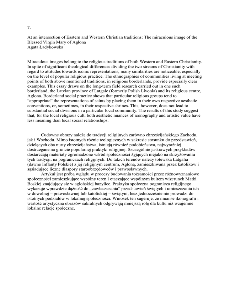 7. At an intersection of Eastern and Western Christian traditions: The miraculous image of the Blessed Virgin Mary of Aglona Agata Ładykowska Miraculous images belong to the religious traditions of both Western and Eastern Christianity. In spite of significant theological differences dividing the two streams of Christianity with regard to attitudes towards iconic representations, many similarities are noticeable, especially on the level of popular religious practice. The ethnographies of communities living at meeting points of both above mentioned traditions, in religious borderlands, provide especially clear examples. This essay draws on the long-term field research carried out in one such borderland, the Latvian province of Latgale (formerly Polish Livonia) and its religious centre, Aglona. Borderland social practice shows that particular religious groups tend to “appropriate” the representations of saints by placing them in their own respective aesthetic conventions, or, sometimes, in their respective shrines. This, however, does not lead to substantial social divisions in a particular local community. The results of this study suggest that, for the local religious cult, both aesthetic nuances of iconography and artistic value have less meaning than local social relationships. Cudowne obrazy należą do tradycji religijnych zarówno chrześcijańskiego Zachodu, jak i Wschodu. Mimo istotnych różnic teologicznych w zakresie stosunku do przedstawień, dzielących oba nurty chrześcijaństwa, istnieją również podobieństwa, najwyraźniej dostrzegane na gruncie popularnej praktyki religijnej. Szczególnie jaskrawych przykładów dostarczają materiały zgromadzone wśród społeczności żyjących niejako na skrzyżowaniu tych tradycji, na pograniczach religijnych. Do takich terenów należy łotewska Łatgalia (dawne Inflanty Polskie) z jej religijnym centrum, Agłoną, zamieszkiwana przez katolików i sąsiadujące liczne diaspory staroobrzędowców i prawosławnych. Artykuł jest próbą wglądu w procesy budowania tożsamości przez różnowyznaniowe społeczności zamieszkujące wspólny teren i otaczające wspólnym kultem wizerunek Matki Boskiej znajdujący się w agłońskiej bazylice. Praktyka społeczna pogranicza religijnego wykazuje wprawdzie dążność do „zawłaszczania” przedstawień świętych i umieszczania ich w dowolnej – prawosławnej lub katolickiej – świątyni, lecz jednocześnie nie prowadzi do istotnych podziałów w lokalnej społeczności. Wniosek ten sugeruje, że niuanse ikonografii i wartość artystyczna obrazów sakralnych odgrywają mniejszą rolę dla kultu niż wzajemne lokalne relacje społeczne.