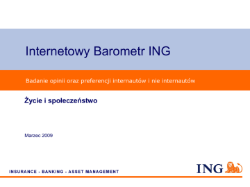 Internetowy Barometr ING Badanie opinii oraz preferencji internautów i nie internautów śycie i społeczeństwo Marzec 2009 METODOLOGIA • Badanie zostało przeprowadzone: • przez Millward Brown SMG/KRC • na próbie N=1000 respondentów, z czego N = 500 deklarujących się jako uŜytkujący Internet oraz N = 500 jako tych, którzy nie korzystają z Internetu. • Metodą CATI (computer assisted telephone interview). • Czas realizacji badania: styczeń 2009. ING 2 NajwaŜniejsze wyniki KLUCZOWE WYNIKI • Prawie połowa internautów (48%), uwaŜa Ŝe płaci za internet za duŜo • Większość osób niekorzystających z internetu tłumaczy to brakiem dostępu do sieci (26%) lub komputera (21%) • Dwie trzecie obecnych nie internautów (66%) korzystałoby z internetu, gdyby był on powszechnie dostępny i za darmo. • 59% nie korzystających z Internetu deklaruje chęć skorzystania z darmowej nauki obsługi komputera i Internetu. ING 3 NajwaŜniejsze wyniki FINANSE • Prawie co drugi internauta uwaŜa, Ŝe ceny internetu w Polsce są za wysokie • Połowowa uŜytkowników internetu korzysta z bankowości elektronicznej (posiada konto internetowe). Trzech na czterech posiadaczy kont bankowości elektronicznej korzysta z nich przynajmniej raz w tygodniu (74%) • 46% internautów korzysta z internetu jako platformy umoŜliwiającej dokonywanie róŜnego rodzaju płatności • 56% internautów twierdzi, Ŝe nie ma obaw przed płaceniem przez internet • 41% internautów jest zainteresowanych moŜliwością robienia przelewów za pomocą mobilnej bankowości elektronicznej TECHNOLOGIE • 60% internautów nie wyobraŜa juŜ sobie Ŝycia bez internetu • Co piąty internauta wolałby zrezygnować z seksu niźli z internetu • Internauci nie akceptują reklam w internecie. Czterech na pięciu polskich internautów byłoby skłonnych płacić 10 zł miesięcznie za moŜliwość korzystania z internetu bez reklam. Ponad połowa badanych zapłaciłaby za moŜliwość surfowania po internecie wolnym od reklam nawet 30 zł • Tylko co ósmy polski internauta kiedykolwiek kupił w internecie plik muzyczny. Prawie co drugi polski internauta ściąga muzykę z internetu, a co szósty robi to regularnie • Co trzeci polski internauta woli oglądać teledyski w internecie niŜ w telewizji • Tylko co 7 polski internauta korzysta z internetu w telefonie komórkowym ING 4 NajwaŜniejsze wyniki MEDIA • Internet dla internautów jest głównym źródłem informacji, waŜniejszym od telewizji, prasy i radia. • Fakty TVN, to najbardziej wiarygodny program informacyjny (przy czym wskazuje go aŜ 47% internautów oraz „tylko” 29% nie internautów). • Dwóch na pięciu internautów uznało portal Onet.pl za najlepsze zastępstwo prasy drukowanej (43%) • Co drugi polski internauta chciałby mieć moŜliwość oglądania przez internet stacji TVN • Ponad jedna trzecia internautów słucha radia przez internet śYCIE I SPOŁECZEŃSTWO • NiezaleŜnie od faktu korzystania z Internetu, Kraków, to zdaniem badanych najpiękniejsze polskie miasto (jako takie wskazuje je 44% internautów oraz 38% nie internautów). • Internauci są bardziej ukulturalnieni. Czytają więcej ksiąŜek, częściej chodzą do teatru i kina. • Co piąty polski internauta posiada płytę Feel (21%) lub Piotra Rubika (20%) • Prawie dwie trzecie polskich internautów chciałoby móć głosować przez internet • AŜ trzy czwarte internautów wzięłoby udział we wszystkich wyborach i referendach, gdyby mogli głosować przez internet • 84% polskich internautów chciałoby załatwiać sprawy w urzędzie za pomocą internetu • Najpopularniejszym polskim blogerem politykiem byłby Władysław Bartoszewski. Prawie co piąty Polak chciałby czytac blog Donalda Tuska • Najpopularniejszymi gwiazdami polskiego internetu są Czesio oraz Jožin z Bažin ING 5 śycie i społeczeństwo: Dlaczego nie wszyscy korzystają z internetu? ING 6 Proszę powiedzieć, dlaczego nie korzysta Pan/Pani z Internetu? 0% • • Osoby niekorzystające z internetu tłumaczą to brakiem dostępu do sieci (26%) lub komputera (21%) i brakiem odpowiedniej wiedzy (10%) Internauci, czyli osoby które muszą regularnie dokonywać oplat za internet, w większym stopniu zwracają uwagę na jego wysokie ceny. 48% internautów, uwaŜa Ŝe płaci za internet za duŜo N = 500 nie uŜytkownicy internetu 10% 15% 20% 25% nie m am dostępu 23% nie m am kom putera 21% nie um iem obsługiw ać kom putera 10% jest za drogi 9% inne 7 30% 26% nie potrzebuje (nie jest m i do niczego potrzebny) nie w iem ING 5% 22% 1% 35% 40% 45% 50% Czy uwaŜa Pan/Pani, Ŝe za Internet płaci Pan/Pani? nie w iem / trudno pow iedzieć; 5% nieduŜo; 4% za duŜo; 48% w sam raz; 43% ING N = 500 uŜytkownicy internetu 8 Gdyby internet był powszechnie dostępny i za darmo, to czy korzystałby z niego ? • • 66% obecnych nie internautów korzystałoby z internetu, gdyby był on powszechnie dostępny i za darmo. Oznacza to, Ŝe zadeklarowanych wrogów internetu nie jest aŜ tak duŜo. Nie wiem; 10% Nie; 24% Tak; 66% ING N = 500 nie uŜytkownicy internetu 9 A gdyby była taka moŜliwość, to czy skorzystałby/aby Pan/Pani z darmowej/bezpłatnej nauki obsługi komputera i Internetu? • 59% nie korzystających z Internetu deklaruje chęć skorzystania z darmowej nauki obsługi komputera i Internetu. Nie wiem; 6% Nie; 35% Tak; 59% ING N = 500 nie uŜytkownicy internetu 10 śycie i społeczeństwo: Porównanie preferencji internautów i nie internautów ING 11 Które polskie miasto uwaŜa Pan/Pani za najpiękniejsze? • • NiezaleŜnie od faktu korzystania z Internetu, Kraków, to zdaniem badanych najpiękniejsze polskie miasto (jako takie wskazuje je 44% internautów oraz 38% nie internautów). Warszawa jest nielubiana przez internautów. Tylko 5% uŜytkowników internetu uznało stolicę polski za najpięknięjsze miasto, choć tak je oceniło aŜ 13% nie internautów