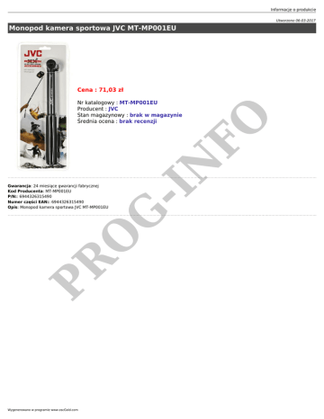 Informacje o produkcie Utworzono 06-03-2017 Monopod kamera sportowa JVC MT-MP001EU Cena : 71,03 zł PR O G Gwarancja: 24 miesiące gwarancji fabrycznej Kod Producenta: MT-MP001EU P/N:: 6944326315490 Numer części EAN:: 6944326315490 Opis: Monopod kamera sportowa JVC MT-MP001EU -I N FO Nr katalogowy : MT-MP001EU Producent : JVC Stan magazynowy : brak w magazynie Średnia ocena : brak recenzji Wygenerowano w programie www.oscGold.com
