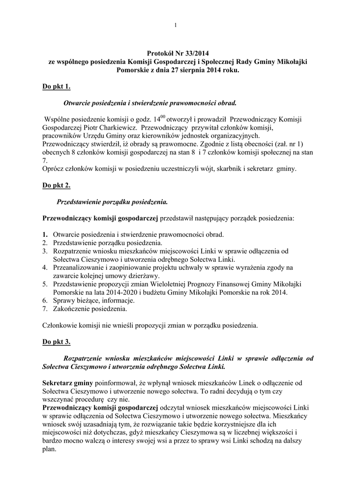 1 Protokół Nr 33/2014 ze wspólnego posiedzenia Komisji Gospodarczej i Społecznej Rady Gminy Mikołajki Pomorskie z dnia 27 sierpnia 2014 roku. Do pkt 1. Otwarcie posiedzenia i stwierdzenie prawomocności obrad. Wspólne posiedzenie komisji o godz. 1400 otworzył i prowadził Przewodniczący Komisji Gospodarczej Piotr Charkiewicz. Przewodniczący przywitał członków komisji, pracowników Urzędu Gminy oraz kierowników jednostek organizacyjnych. Przewodniczący stwierdził, iż obrady są prawomocne. Zgodnie z listą obecności (zał. nr 1) obecnych 8 członków komisji gospodarczej na stan 8 i 7 członków komisji społecznej na stan 7. Oprócz członków komisji w posiedzeniu uczestniczyli wójt, skarbnik i sekretarz gminy. Do pkt 2. Przedstawienie porządku posiedzenia. Przewodniczący komisji gospodarczej przedstawił następujący porządek posiedzenia: 1. Otwarcie posiedzenia i stwierdzenie prawomocności obrad. 2. Przedstawienie porządku posiedzenia. 3. Rozpatrzenie wniosku mieszkańców miejscowości Linki w sprawie odłączenia od Sołectwa Cieszymowo i utworzenia odrębnego Sołectwa Linki. 4. Przeanalizowanie i zaopiniowanie projektu uchwały w sprawie wyrażenia zgody na zawarcie kolejnej umowy dzierżawy. 5. Przedstawienie propozycji zmian Wieloletniej Prognozy Finansowej Gminy Mikołajki Pomorskie na lata 2014-2020 i budżetu Gminy Mikołajki Pomorskie na rok 2014. 6. Sprawy bieżące, informacje. 7. Zakończenie posiedzenia. Członkowie komisji nie wnieśli propozycji zmian w porządku posiedzenia. Do pkt 3. Rozpatrzenie wniosku mieszkańców miejscowości Linki w sprawie odłączenia od Sołectwa Cieszymowo i utworzenia odrębnego Sołectwa Linki. Sekretarz gminy poinformował, że wpłynął wniosek mieszkańców Linek o odłączenie od Sołectwa Cieszymowo i utworzenie nowego sołectwa. To radni decydują o tym czy wszczynać procedurę czy nie. Przewodniczący komisji gospodarczej odczytał wniosek mieszkańców miejscowości Linki w sprawie odłączenia od Sołectwa Cieszymowo i utworzenie nowego sołectwa. Mieszkańcy wniosek swój uzasadniają tym, że rozwiązanie takie będzie korzystniejsze dla ich miejscowości niż dotychczas, gdyż mieszkańcy Cieszymowa są w liczebnej większości i bardzo mocno walczą o interesy swojej wsi a przez to sprawy wsi Linki schodzą na dalszy plan. 2 Sekretarz gminy wyjaśnił, że nie jest tak źle, jak przedstawiają mieszkańcy Linek w swoim wniosku, czego przykładem może być fakt, że sołtysem już którąś kadencję z kolei jest osoba z Linek. Uczestnicząc w zebraniach sołectwa zaobserwowałem, powiedział sekretarz, że niejednokrotnie z Linek było więcej osób niż z Cieszymowa. W przypadku funduszu sołeckiego w początkowych latach, to większa część pieniędzy trafiała do Linek z tego względu, że na zebraniu nie było mieszkańców Cieszymowa i nie było zbytniego zainteresowania w Cieszymowie funduszem sołeckim. Radny Maciej Baurycza stwierdził, że jest zdecydowanie przeciwny odłączaniu Linek od Cieszymowa. Jestem mieszkańcem Linek, w tej miejscowości mieszkają ludzie bezrobotni i emeryci i w zasadzie młodych małżeństw jest 5 może 6. Nie wiem do czego ten podział ma prowadzić, czy do kolejnego rozdawania pieniędzy? Za chwilę mieszkańcy będą chcieli świetlicę, za chwilę będą kazać kupić od Agencji walący się budynek bo będą chcieli tam robić świetlicę czy coś w tym rodzaju. Nie uważam za stosowne odłączanie miejscowości Linki od sołectwa Cieszymowo, tym bardziej, że mieszkańcy Linek są aktywni, przychodzą na zebrania a mieszkańców Cieszymowa na zebraniach jest bardzo mało i zostają przegłosowywani. Jeżeli chodzi o fundusz sołecki to jest on dzielony proporcjonalnie. Mieszkańcy Linek przeznaczyli wyliczony proporcjonalnie fundusz i zakupili dwie ciężarówki kamienia, którego nie ma gdzie wysypać i leży na kupie. Myślę, że nie jest to trafiony pomysł. Jestem mieszkańcem Linek i nie podpisałem listy, jestem zdecydowanie przeciwny temu żeby powstawało sołectwo Linki. Moim zdaniem nie ma takiej potrzeby, gdyż w zasadzie w Linkach jest tylko droga gminna idąca przez wieś a reszta jest agencyjne lub prywatne. Radny Wiesław Kot zapytał o rozbicie proporcjonalne funduszu, przecież o funduszu sołeckim decydują mieszkańcy, skąd więc podział proporcjonalny. Sekretarz gminy wyjaśni, ze padła propozycja sołtysa aby podzielić proporcjonalnie co do ilości mieszkańców w miejscowościach. Mieszkańcy wyrazili zgodę na taki podział. Radny Piotr Charkiewicz zapytał czy wysokość funduszu sołeckiego np. po odłączeniu Linek fundusz będzie na maksymalnym poziomie? Wójt dodał, że jeśli chodzi o sam fundusz sołecki gdyby został rozdzielony to być może w Linkach minimalnie by wzrósł, natomiast wszelkie pozostałe argumenty to rzeczywiście są nietrafione. W poprzedniej kadencji sołtysem była osoba z Linek, teraz też jest z Linek. Jestem obecny na zebraniach sołeckich i mieszkańcy Linek dominują na zebraniach, to oni decydują o podziale funduszu sołeckiego. Pierwszy fundusz sołecki to praktycznie prawie cały poszedł do Linek. Pierwszy plac zabaw był utworzony w Linkach, nie w Cieszymowie. Cieszymowo dopiero teraz dostało plac zabaw, więc te argumenty które są przytaczane we wnioski są nietrafione. Poza tym, jak powiedział radny Baurycza, za chwilę mieszkańcy powiedzą, że chcą świetlicę czy boisko i będziemy mieć kolejny problem. Po to świetlica została utworzona w szkole żeby to było w miarę blisko dla mieszkańców Linek i dla mieszkańców Cieszymowa, zostało to wypośrodkowane. Gdyby mieszkańcy Linek po rozdzieleniu chcieli utworzyć świetlicę,bo tak by było, gdyż powiedzą że nie mają świetlicy to nie byłoby gdzie jej stworzyć. W związku z tym, że radni nie wnieśli więcej pytań i uwag do omawianej sprawy, prowadzący posiedzenie poddał wniosek mieszkańców Linki o odłą