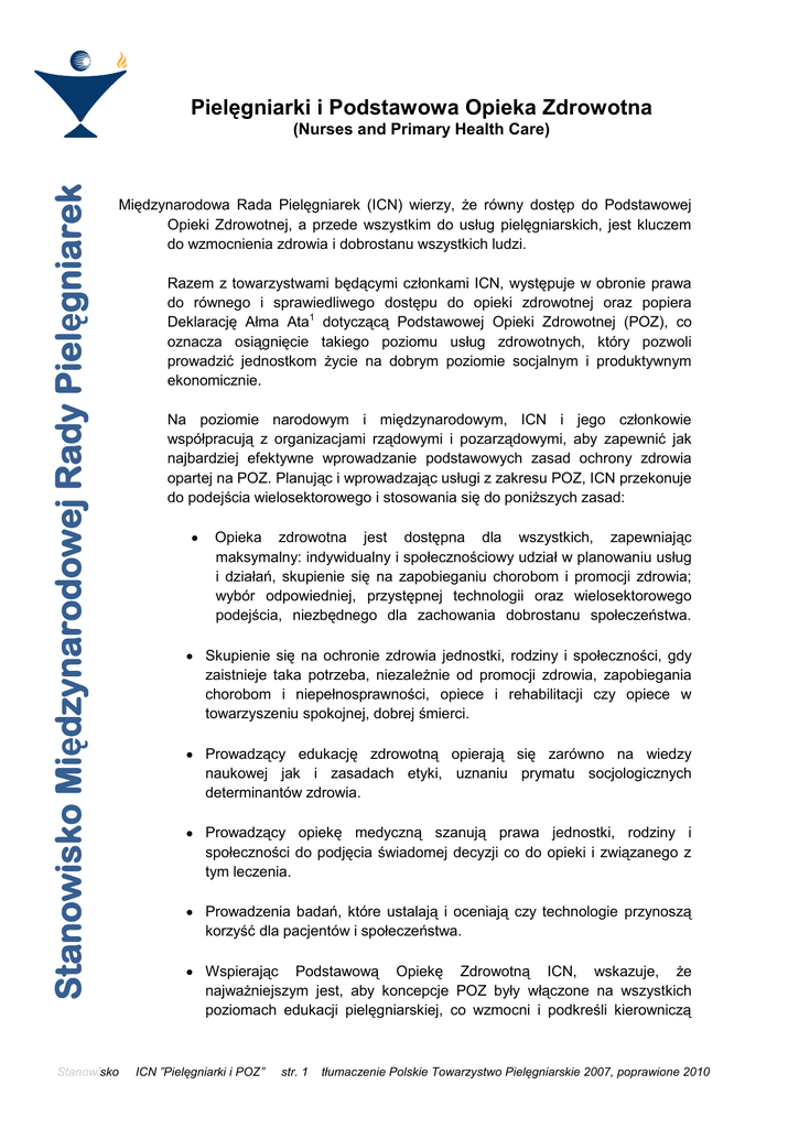 Pielęgniarki i Podstawowa Opieka Zdrowotna Stanowisko Międzynarodowej Rady Pielęgniarek (Nurses and Primary Health Care) Międzynarodowa Rada Pielęgniarek (ICN) wierzy, że równy dostęp do Podstawowej Opieki Zdrowotnej, a przede wszystkim do usług pielęgniarskich, jest kluczem do wzmocnienia zdrowia i dobrostanu wszystkich ludzi. Stanowisko Razem z towarzystwami będącymi członkami ICN, występuje w obronie prawa do równego i sprawiedliwego dostępu do opieki zdrowotnej oraz popiera Deklarację Ałma Ata1 dotyczącą Podstawowej Opieki Zdrowotnej (POZ), co oznacza osiągnięcie takiego poziomu usług zdrowotnych, który pozwoli prowadzić jednostkom życie na dobrym poziomie socjalnym i produktywnym ekonomicznie. Na poziomie narodowym i międzynarodowym, ICN i jego członkowie współpracują z organizacjami rządowymi i pozarządowymi, aby zapewnić jak najbardziej efektywne wprowadzanie podstawowych zasad ochrony zdrowia opartej na POZ. Planując i wprowadzając usługi z zakresu POZ, ICN przekonuje do podejścia wielosektorowego i stosowania się do poniższych zasad: Opieka zdrowotna jest dostępna dla wszystkich, zapewniając maksymalny: indywidualny i społecznościowy udział w planowaniu usług i działań, skupienie się na zapobieganiu chorobom i promocji zdrowia; wybór odpowiedniej, przystępnej technologii oraz wielosektorowego podejścia, niezbędnego dla zachowania dobrostanu społeczeństwa. Skupienie się na ochronie zdrowia jednostki, rodziny i społeczności, gdy zaistnieje taka potrzeba, niezależnie od promocji zdrowia, zapobiegania chorobom i niepełnosprawności, opiece i rehabilitacji czy opiece w towarzyszeniu spokojnej, dobrej śmierci. Prowadzący edukację zdrowotną opierają się zarówno na wiedzy naukowej jak i zasadach etyki, uznaniu prymatu socjologicznych determinantów zdrowia. Prowadzący opiekę medyczną szanują prawa jednostki, rodziny i społeczności do podjęcia świadomej decyzji co do opieki i związanego z tym leczenia. Prowadzenia badań, które ustalają i oceniają czy technologie przynoszą korzyść dla pacjentów i społeczeństwa. Wspierając Podstawową Opiekę Zdrowotną ICN, wskazuje, że najważniejszym jest, aby koncepcje POZ były włączone na wszystkich poziomach edukacji pielęgniarskiej, co wzmocni i podkreśli kierowniczą ICN ”Pielęgniarki i POZ” str. 1 tłumaczenie Polskie Towarzystwo Pielęgniarskie 2007, poprawione 2010 rolę pielęgniarek na wszystkich poziomach tak narodowych jak i międzynarodowych Tło: Ludzkość w przyszłości stanie w obliczu sytuacji, w której zdrowie i dobrostan mogą być zagrożone przez agresywnie rozwijającą się technologię; wyczerpywanie się zasobów naturalnych oraz degradację środowiska; wzrost populacji; wpływ nowych problemów zdrowotnych (np. AIDS) jak i od dawna rozpoznanych (np. malaria). Inne czynniki takie, jak starzenie się społeczeństwa i związane z tym choroby przewlekłe i nieuleczalne, stawiają coraz to nowe wymagania co do usług zdrowotnych i socjalnych. W 1978 r. ICN deklarowała wsparcie dla POZ oraz wyraziła zamiar współpracy zarówno na poziomie narodowym jak i międzynarodowym z organizacjami rządowymi i pozarządowymi, aby spowodować, że Podstawowa Opieka Zdrowotna będzie na tyle efektywna, aby zaspokoić potrzeby populacji. W kolejnych latach ICN oraz narodowe towarzystwa pielęgniarskie (NNA) przyczyniły się do lobbowania za włączeniem zasad i programów POZ do edukacji zdrowotnej, do planowania i świadczenia usług oraz do badań i późniejszej oceny. Wiele NNA promuje inicjatywę wcielenia POZ do praktyki pielęgniarskiej i polityki zdrowotnej. Pielęgniarki są główną grupą personelu ochrony zdrowia, dostarczającą opieki zdrowotnej na wszystkich poziomach i utrzymującą kontakt z jednostkami, rodzinami, społecznościami i resztą systemu opieki zdrowotnej. Pracując z innymi sektorami, innymi członkami zespołu opieki zdrowotnej albo na własnych praktykach, pielęgniarki odnajdują nowe i lepsze drogi do utrzymania zdrowia lub jego poprawy oraz zapobiegania chorobom czy niepełnosprawności. Pielęgniarki poprawiają równość i dostępność do opieki zdrowotnej, dbając o jakość wyników. Ważne jest, aby programy kształcenia w pielęgniarstwie były zgodne z ideą POZ na poziomie tak podstawowym i ponadpodstawowym. Adoptowane 2000 Zrewidowane w 2007 Poprzedni tytuł: Health Care and Quality of Life Riga Reaffirmation Powiązane Stanowiska ICN: Publikacje ICN: Udział w Pielęgniarek podejmowaniu decyzji dotyczących świadczeń ochrony zdrowia i polityki rozwoju (Participation of Nurses in Health Services Decision Making and Policy Development) ___________ 1 Światowa Organizacja Zdrowia, Alma Ata 1978 Podstawowa Opieka Zdrowotna, Genewa, 1978. Międzynarodowa Rada Pielęgniarek jest federacją ponad 120 krajowych stowarzyszeń pielęgniarek reprezentujących miliony pielęgniarek na całym świecie. Kierowana przez pielęgniarki i na rzecz pielęgniarek, ICN stanowi międzynarodowy głos na rzecz pielęgniarstwa i pracuje nad zapewnieniem opieki jakościowej obejmującej wszystkich obywateli oraz rozsądnej, globalnej polityki zdrowotnej. Stanowisko ICN ”Pielęgniarki i POZ” str. 2 tłumaczenie Polskie Towarzystwo Pielęgniarskie 2007, poprawione 2010
