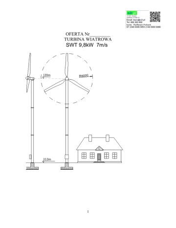 Chociw 23.02.2015r. OFERTA Nr_________ TURBINA WIATROWA SWT9,8kW –9.9 kW/7m/s SWT 7m/s 1 GŁÓWNE PARAMETRY Średnica wirnika Moc ograniczona elektronicznie doDopuszczalne chwilowe przeciążenie Startowa prędkość wiatru Prędkość wiatru wyłączenia Wysokość do osi piasty Klasa turbiny wiatrowej 12m 9.8 kW 3m/s 2m/s i 18 m/s 20m II (EN 61400-2:2006 WIRNIK Położenie Sterowanie łopat Zakres prędkości obrotowej Kierunek obrotów Materiał łopat Mocowanie łopat do piasty Liczba łopat Hamulec Przed wieżą Aktywne sterowanie kątem natarcia 40-120 obr/min Prawy Kompozyt Łożyska wieńcowe 3 Tarczowy elektryczny na wale PRĄDNICA Typ prądnicy Moc dla ciągłej pracy Studzenie powietrzem Zabezpieczenie termiczne Napięcie pracy Maksymalny ciągły prąd fazowy Prądnica trójfazowa System napędowy PMG 9.8 kW Kontrola temperatury uzwojenia Zgodne z parametrami sieci 10 A Tak Bezprzekładniowy - bezpośredni SYSTEM ORIENTACJI NA WIATR Serwonapęd z przekładnią Łożysko wieńcowe z uzębieniem wew. Aktywna kontrola Sterowanie aktywne Łożyskowanie Zabezpieczenia skręcania kabli 2 Tabela mocy w funkcji prędkości wiatru oraz współczynnik wykorzystania mocy. Wiatr Moc m/s kW 1 0,00 2 0,09 3 0,63 4 1,63 5 3,39 6 6,11 7 9,96 8 9 10 11 12 13 14 15 10,00 10,00 10,00 10,00 10,00 10,00 10,00 10,00 Współ. Cp(-) 0,00 0,16 0,33 0,37 0,39 0,41 0,42 0,28 0,19 0,14 0,10 0,08 0,06 0,05 0,04 0,60 10,0 0,50 8,0 0,40 6,0 0,30 4,0 0,20 2,0 0,10 0,0 0,00 Power (kW) 12,0 0 1 2 3 4 5 6 7 8 Wind (m/s) 3 9 10 11 12 13 14 15 Power coefficient Cp(-) Krzywa mocy dla wersji z prądnicą i inwerterem 9.8 kW Systemy bezpieczeństwa Wymiary i masy Średnica wieży Wysokość Ciężar wieży Gondola WxLxH Ciężar gondoli Ciężar łopat wirnika Długość łopat wirnika Ø 508 mm 20 m trzyczęściowa 2,1 T 726x1965x726 700 kg ( bez łopat) 240 kg 6m Ograniczenie mocy Hamulec elektryczny Hamulec rezystancyjny Kątem natarcia łopat Na wale głównym Oferta podstawowa: Chociw 23.02.2015r. OFERTA Na wykonanie na indywidualne zamówienie Elektrowni Wiatrowej SWT –9,8 kW w wersji „pod klucz” ( o produkcji 9,8 kW przy wietrze 7m/s) Z lokalizacją: W Polsce w zależności od lokalizacji i szorstkości terenu elektrownia wiatrowa SWT-9,8 kW ( średnica wirnika 12m, moc prądnicy 9.8 kW, wysokość wirnika nad poziomem gruntu 20m) może wyprodukować od 12 do 50 tysięcy kilowatogodzin energii w czasie jednego roku. Bardziej szczegółowe informacje o produktywności przy średniej predkości wiatru znajdują się na stronie następnej. By odczytać szacowaną ilość energii jaką może turbina wyprodukować w okresie jednego roku powinniśmy z zamieszczonej mapy wietrzności odczytać jakie średnie wiatry występują w naszym rejonie. W lewej rubryce podane są prędkości wiatru z dokładnością do 0,1 metra na sekundę. W prawej rubryce są podane odpowiadające im szacunkowe wartości rocznej produkcji w kWh. Dla dokładnego oszacowania mogą Państwo skorzystać z usług firmy Wiatrometr.pl. 4 Szacowana roczna produkcja energii w kWh przy średniej prędkośi wiatru w m/s 3.0 3.1 3.2 3.3 3.4 3.5 3.6 3.7 3.8 3.9 4.0 4.1 4.2 4.3 4.4 4.5 4.6 4.7 4.8 4.9 5.0 5.1 5.2 5.3 5.4 5.5 5.6 5.7 5.8 5.9 6.0 Model SWT 9,8kW 12460 13860 15280 16680 18100 19500 20910 22320 23730 25140 26550 27960 29370 30780 32190 33600 35000 36400 37800 39200 40600 42000 43400 44800 46200 47600 49100 50500 51900 53300 54000 Mapa średniorocznych rozkładów predkości wiatrów (wg Haliny Lorenc) 5 Ceny podano w wartościach netto w walucie PLN bez podatku VAT Poz.1 FUNDAMENT POD TURBINĘ. Szt.1. Wykonanie wykopu o wymiarach u podstawy 3,0x3,0 (o ścianach pionowych jeżeli pozwoli na to grunt) lub skosie ścian 45 stopni co daje wykop na powierzchni terenu maksymalnie ok. 6x6m. Głębokość wykopu 1,6m. ( oferta nie przewiduje wywiezienia urobku poza teren niezbędny dla wykonania wykopu)i. Zagospodarowanie ok. 10 m3 urobku leży w gestii inwestora; Wykonanie i ułożenie zbrojenia zgodnie z dokumentacją; Wykonanie szalunków; Wylanie betonu w ilości i klasie zgodnej z dokumentacją; Zasypanie fundamentu z wyrównaniem humusem. Posprzątanie po budowie. ( UWAGA 1. – cena fundamentu jest skalkulowana dla gruntu średniej nośności i średniego poziomu wód gruntowych na terenie Polski. W konkretnym przypadku należy wykonać stosowne badania geologiczne i przeliczyć projekt na właściwy do otrzymanych danych. W przypadku wystąpienia istotnych różnic nastąpi korekta wyceny) ( UWAGA 2. – nie mogą stanowić podstawy do reklamacji wygląd ani struktura powierzchni betonowej ponieważ najistotniejszym parametrem jest wytrzymałość konstrukcji). (UWAGA 3.- zastrzega się możliwość zmiany układu geometrycznego fundamentu np.: ze stożkowego na schodkowy lub inny. Decyzję pozostawia się w gestii wykonawcy po ostatecznych korektach projektu i wizji lokalnej ) (UWAGA 4.- obowiązkiem inwestora jest udostępnić media w postaci energii elektrycznej, wody, Internetu ). (UWAGA 5.- wszystkie następne operacje mogą nastąpić dopiero po całkowitym zakończeniu prac fundamentowych wraz z uporządkowaniem terenu). CENA NETTO WYKONANIA FUN DAMENTU Gwarancja na fundament wynosi 20 lat 11 500,00 zł. Poz.2 WIEŻA Szt.1 Wykonanie, dostawa i właściwe zdjęcie na placu budowy elementów składowych wieży jak w dokumentacji: Moduł dolny wieży; Moduł środkowy wieży; 6 Moduł górny; Stosowne śruby i nakrętki mocujące. (UWAGA 1.- wszystkie połączenia spawane wykonane są bez szlifowania dla zabezpieczenia maksymalnej wytrzymałości). ( UWAGA 2.- wszystkie elementy wieży są ocynkowane( opcjonalnie za dopłatą możliwe pomalowanie zestawem farb zabezpieczających przed korozją w kolorze RAL 7035, klasa korozyjności C5 wg PN-EN ISO 12944-5 ). Uwagi 3 i 4 dotyczą wersji malowanej. (UWAGA 3.- rodzaj powierzchni malowanych może posiadać strukturę „skórki pomarańczowej” i nie stanowi to podstawy do rekla