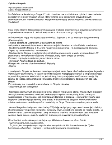 Opinie o Stogach Wpisany przez Anna Kwaśnik piątek, 03 lipca 2009 06:57 Co Gdańszczanie wiedzą o Stogach? Jaki charakter ma ta dzielnica w opiniach mieszkańców pozostałych rejonów miasta? Obraz, który wyłania się z odpowiedzi przypadkowych przechodniów jest niejednoznaczny. Wszystkim towarzyszy jednak wspólna, pierwsza reakcja: To daleko! Stogi wielu młodym Gdańszczanom kojarzą się z tablicą informacyjną o przystanku końcowym na przedzie tramwaju nr 8. Jednak większość z nich opuszcza go najdalej w Śródmieściu, nigdy nie dojeżdżając do końca. Zapytani o to, co wiedzą o Stogach mówią głównie o plaży. To takie osiedle za Gdańskiem, z dostępem do morza - odpowiada szesnastoletnia Asia z Wrzeszcza- jeździłam tam w dzieciństwie z rodzicami. Siedemnastoletni Mikołaj z II LO ma negatywne skojarzenia. To niebezpieczna dzielnica. Często są tam strzelaniny i morderstwa . Utożsamianie Stogów z zagłębiem kryminalistów powtarza się w wielu wypowiedziach. W przekonaniu mieszkańców Gdańska to obszar, który lepiej omijać po zmroku. Podobno rządzą tym miejscem jakieś ciemne moce - mówi pan Adam udając, że żartuje. Dlatego nikt tam nie chce inwestować. Boją się . Opinia o powiązaniu Stogów ze światem przestępczym jest nadal żywa, choć najbarwniejsze legendy o mafii krążyły dawno temu, w latach osiemdziesiątych. Najlepiej przekonani o ich prawdziwości są sami Stogowianie. Wśród nich są jednak tacy, którzy na jej obecność nie narzekają. Są zdania, że lepsza jedna mafia niż kilkunastu drobnych przestępców działających bez ładu i składu. Przynajmniej jest porządek. I samochody ze Stogów nie giną - argumentuje pan Władysław. Najwięcej pozytywnych skojarzeń na temat Stogów mają ludzie starsi. Wiążą z tym miejscem nostalgiczne wspomnienia młodości, wakacyjnych wycieczek na plażę, którą uznają za najpiękniejszą w Trójmieście. Jak twierdzi pani Barbara z Brzeźna – tramwaj trzynastka jako jedyny w Gdańsku łączył dawniej dwie plaże, w Brzeźnie i na Stogach. Mimo że Brzeźno miałam pod nosem, wolałam jeździć opalać się na Stogi. Tam zawsze była czystsza woda. A co o Stogach mówią sami mieszkańcy? Wydają się być przyzwyczajeni do swojej dzielnicy, choć towarzyszy im pewien kompleks, związany z tym, że jest ona odcięta od reszty miasta. Ur odziłam się tu i pewnie tutaj umrę. Lubię to miejsce choć ma mnóstwo wad. Jest z dala od centrum życia miasta, mało tu wydarzeń kulturalnych o wymiarze ponadlokalnym . Choć jest też wiele ciekawych inicjatyw, np. Biblioteka Społeczna, Dom Sztuki - wymienia pani Julia, nauczycielka. To jak tu jest w największym stopniu wina samych ludzi. Nic ich nie interesuje. Tylko bezrobocie, alkoholizm i marazm - kwituje zdenerwowana mieszkanka. 1/2 Opinie o Stogach Wpisany przez Anna Kwaśnik piątek, 03 lipca 2009 06:57 Czy czują się na Stogach bezpiecznie? Pan Eugeniusz wieczorami raczej nie spaceruje. Twierdzi, że jest bardzo ciemno, brakuje latarń. Pani Czesia, która od lat opiekuje się krzyżem przy ulicy Stryjewskiego, narzeka na młodzież, zwłaszcza innowierczą, która rzekomo notorycznie dewastuje sadzone przez panią Czesię rośliny wokół krzyża. Dużo się słyszy, że tu kogoś napadli, tam znów znaleźli nieboszczyka, strach się baćzałamuje dłonie pani Bożena, która na Stogach mieszka od 35 lat. Pociesza mnie i uspokaja dopiero rozmowa z młodą kobietą. Bezpiecznie może nie jest, zresztą jak wszędzie ale wiele z tego co się mówi to jedynie wymysły i plotki. Szerzej o tym, co mieszkańców męczy i denerwuje będzie można porozmawiać przed kamerą naszego portalu już wkrótce na ulicach Stogów. O szczegółach poinformujemy później ale już dziś zapraszamy. Autorka: Anna Kwaśnik 2/2
