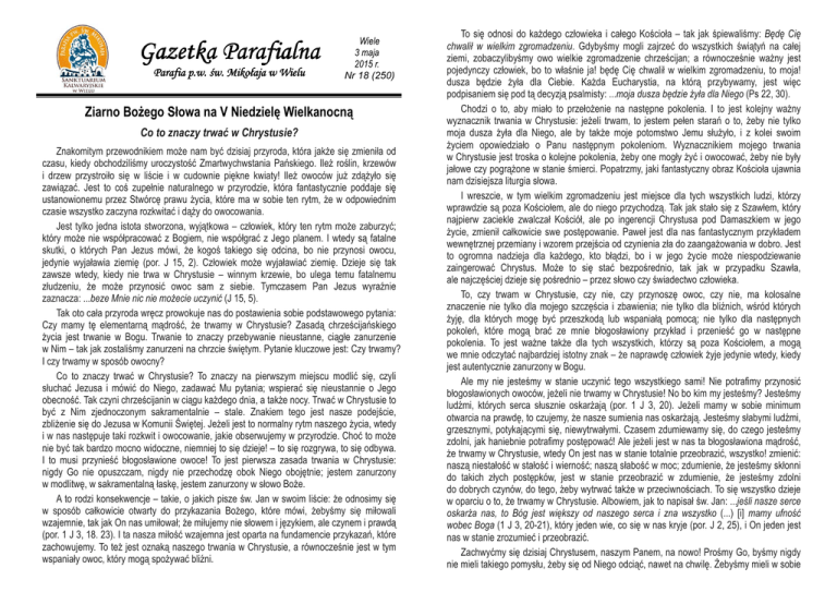 Gazetka Parafialna Parafia p.w. św. Mikołaja w Wielu Wiele 3 maja 2015 r. Nr 18 (250) Ziarno Bożego Słowa na V Niedzielę Wielkanocną Co to znaczy trwać w Chrystusie? Znakomitym przewodnikiem może nam być dzisiaj przyroda, która jakże się zmieniła od czasu, kiedy obchodziliśmy uroczystość Zmartwychwstania Pańskiego. Ileż roślin, krzewów i drzew przystroiło się w liście i w cudownie piękne kwiaty! Ileż owoców już zdążyło się zawiązać. Jest to coś zupełnie naturalnego w przyrodzie, która fantastycznie poddaje się ustanowionemu przez Stwórcę prawu życia, które ma w sobie ten rytm, że w odpowiednim czasie wszystko zaczyna rozkwitać i dąży do owocowania. Jest tylko jedna istota stworzona, wyjątkowa – człowiek, który ten rytm może zaburzyć; który może nie współpracować z Bogiem, nie współgrać z Jego planem. I wtedy są fatalne skutki, o których Pan Jezus mówi, że kogoś takiego się odcina, bo nie przynosi owocu, jedynie wyjaławia ziemię (por. J 15, 2). Człowiek może wyjaławiać ziemię. Dzieje się tak zawsze wtedy, kiedy nie trwa w Chrystusie – winnym krzewie, bo ulega temu fatalnemu złudzeniu, że może przynosić owoc sam z siebie. Tymczasem Pan Jezus wyraźnie zaznacza: ...beze Mnie nic nie możecie uczynić (J 15, 5). Tak oto cała przyroda wręcz prowokuje nas do postawienia sobie podstawowego pytania: Czy mamy tę elementarną mądrość, że trwamy w Chrystusie? Zasadą chrześcijańskiego życia jest trwanie w Bogu. Trwanie to znaczy przebywanie nieustanne, ciągłe zanurzenie w Nim – tak jak zostaliśmy zanurzeni na chrzcie świętym. Pytanie kluczowe jest: Czy trwamy? I czy trwamy w sposób owocny? Co to znaczy trwać w Chrystusie? To znaczy na pierwszym miejscu modlić się, czyli słuchać Jezusa i mówić do Niego, zadawać Mu pytania; wspierać się nieustannie o Jego obecność. Tak czyni chrześcijanin w ciągu każdego dnia, a także nocy. Trwać w Chrystusie to być z Nim zjednoczonym sakramentalnie – stale. Znakiem tego jest nasze podejście, zbliżenie się do Jezusa w Komunii Świętej. Jeżeli jest to normalny rytm naszego życia, wtedy i w nas następuje taki rozkwit i owocowanie, jakie obserwujemy w przyrodzie. Choć to może nie być tak bardzo mocno widoczne, niemniej to się dzieje! – to się rozgrywa, to się odbywa. I to musi przynieść błogosławione owoce! To jest pierwsza zasada trwania w Chrystusie: nigdy Go nie opuszczam, nigdy nie przechodzę obok Niego obojętnie; jestem zanurzony w modlitwę, w sakramentalną łaskę, jestem zanurzony w słowo Boże. A to rodzi konsekwencje – takie, o jakich pisze św. Jan w swoim liście: że odnosimy się w sposób całkowicie otwarty do przykazania Bożego, które mówi, żebyśmy się miłowali wzajemnie, tak jak On nas umiłował; że miłujemy nie słowem i językiem, ale czynem i prawdą (por. 1 J 3, 18. 23). I ta nasza miłość wzajemna jest oparta na fundamencie przykazań, które zachowujemy. To też jest oznaką naszego trwania w Chrystusie, a równocześnie jest w tym wspaniały owoc, który mogą spożywać bliźni. To się odnosi do każdego człowieka i całego Kościoła – tak jak śpiewaliśmy: Będę Cię chwalił w wielkim zgromadzeniu. Gdybyśmy mogli zajrzeć do wszystkich świątyń na całej ziemi, zobaczylibyśmy owo wielkie zgromadzenie chrześcijan; a równocześnie ważny jest pojedynczy człowiek, bo to właśnie ja! będę Cię chwalił w wielkim zgromadzeniu, to moja! dusza będzie żyła dla Ciebie. Każda Eucharystia, na którą przybywamy, jest więc podpisaniem się pod tą decyzją psalmisty: ...moja dusza będzie żyła dla Niego (Ps 22, 30). Chodzi o to, aby miało to przełożenie na następne pokolenia. I to jest kolejny ważny wyznacznik trwania w Chrystusie: jeżeli trwam, to jestem pełen starań o to, żeby nie tylko moja dusza żyła dla Niego, ale by także moje potomstwo Jemu służyło, i z kolei swoim życiem opowiedziało o Panu następnym pokoleniom. Wyznacznikiem mojego trwania w Chrystusie jest troska o kolejne pokolenia, żeby one mogły żyć i owocować, żeby nie były jałowe czy pogrążone w stanie śmierci. Popatrzmy, jaki fantastyczny obraz Kościoła ujawnia nam dzisiejsza liturgia słowa. I wreszcie, w tym wielkim zgromadzeniu jest miejsce dla tych wszystkich ludzi, którzy wprawdzie są poza Kościołem, ale do niego przychodzą. Tak jak stało się z Szawłem, który najpierw zaciekle zwalczał Kościół, ale po ingerencji Chrystusa pod Damaszkiem w jego życie, zmienił całkowicie swe postępowanie. Paweł jest dla nas fantastycznym przykładem wewnętrznej przemiany i wzorem przejścia od czynienia zła do zaangażowania w dobro. Jest to ogromna nadzieja dla każdego, kto błądzi, bo i w jego życie może niespodziewanie zaingerować Chrystus. Może to się stać bezpośrednio, tak jak w przypadku Szawła, ale najczęściej dzieje się pośrednio – przez słowo czy świadectwo człowieka. To, czy trwam w Chrystusie, czy nie, czy przynoszę owoc, czy nie, ma kolosalne znaczenie nie tylko dla mojego szczęścia i zbawienia; nie tylko dla bliźnich, wśród których żyję, dla których mogę być przeszkodą lub wspaniałą pomocą; nie tylko dla następnych pokoleń, które mogą brać ze mnie błogosławiony przykład i przenieść go w następne pokolenia. To jest ważne także dla tych wszystkich, którzy są poza Kościołem, a mogą we mnie odczytać najbardziej istotny znak – że naprawdę człowiek żyje jedynie wtedy, kiedy jest autentycznie zanurzony w Bogu. Ale my nie jesteśmy w stanie uczynić tego wszystkiego sami! Nie potrafimy przynosić błogosławionych owoców, jeżeli nie trwamy w Chrystusie! No bo kim my jesteśmy? Jesteśmy ludźmi, których serca słusznie oskarżają (por. 1 J 3, 20). Jeżeli mamy w sobie minimum otwarcia na prawdę, to czujemy, że nasze sumienia nas oskarżają. Jesteśmy słabymi ludźmi, grzesznymi, potykającymi się, niewyt