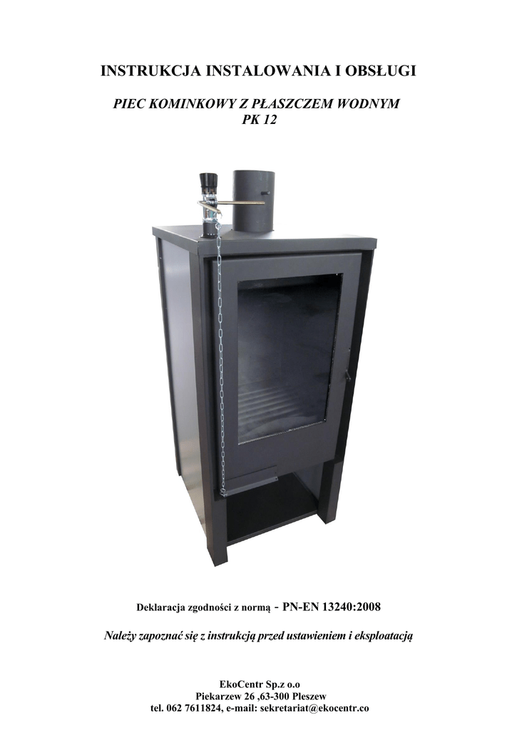 INSTRUKCJA INSTALOWANIA I OBSŁUGI PIEC KOMINKOWY Z PŁASZCZEM WODNYM PK 12 Deklaracja zgodności z normą - PN-EN 13240:2008 Należy zapoznać się z instrukcją przed ustawieniem i eksploatacją EkoCentr Sp.z o.o Piekarzew 26 ,63-300 Pleszew tel. 062 7611824, e-mail: [email protected] Podstawowe wymagania Piecyki kominkowe z płaszczem wodnym typu PK 12 są urządzeniami bardzo wydajnymi służącymi do zasilania instalacji c.o. oraz c.w.u. i ogrzewania pomieszczeń przez promieniowanie. Przed instalowaniem i eksploatacją należy przeczytać i stosować się do zaleceń zawartych w niniejszej instrukcji, zapewni to bezpieczną i wydajną pracę piecyka kominkowego. Przepisy i normy krajowe oraz lokalne dotyczące instalowania i eksploatacji powinny być spełnione a w szczególności: 1 ) Rozporządzenie Ministra Infrastruktury z dnia 12.04.2002 r. Dz.U.Nr75, poz. 690 ze zmianą z dnia 07.05.2004 r. Dz.U.Nr109, poz.1156. 2) Norma PN - B – 03406:1994 Ogrzewnictwo. Obliczeniowe zapotrzebowanie na ciepło. 3) Norma PN – 89 / B – 10425 Przewody dymowe, spalinowe i wentylacyjne murowane z cegły. 4) Norma PN – 78 / B – 03421.Wentylacja i klimatyzacja. Parametry obliczeniowe powietrza wewnętrznego. 5) Norma PN – 91/B – 02413:1991 Zabezpieczenie instalacji ogrzewań wodnych systemu otwartego. Wymagania Zaleca się instalację oraz dobór wielkości i montaż piecyka kominkowego uprawnionej firmie instalatorskiej a odbiór instalacji przez mistrza kominiarskiego. Piecyki kominkowe z płaszczem wodnym typu PK 12 spełniają wymagania zawarte w normie PN – EN 13240: 2008 Ogrzewacze pomieszczeń na paliwa stałe. Wymagania i Badania, zharmonizowanej z dyrektywą UE Wyroby Budowlane (89/106/EWG) PK z płaszczem wodnym strona 2 ver. 01102009 PL 1. ZASTOSOWANIE, OPIS I PODSTAWOWE PARAMETRY PIECYKÓW KOMINKOWYCH Z PŁASZCZEM WODNYM TYPU PK 12. Stałopalne stalowe piecyki kominkowe z płaszczem wodnym typu PK 12 służą do ogrzewania pomieszczeń oraz ich dogrzewania w okresie gdy ogrzewanie tych pomieszczeń instalacja C.O. jest nieekonomiczne. piec ten nie jest przeznaczony do ciągłego ogrzewanie przez 24 godziny. Piecyki kominkowe z płaszczem wodnym mogą wyłącznie zasilać instalację grzewczą o ciśnieniu statecznym 1 bar (10 m słupa wody). Zabezpieczoną naczyniem wzbiorczym systemu otwartego. Piece kominkowe mogą być montowane jedynie na podłożu nie palnym w odpowiednich odległościach od elementów palnych. Przykładowy schemat instalacji przedstawiono na rysunku poniżej. Opis budowy Korpus wodny obejmujący komorę paleniskową oraz część konwekcyjną jest konstrukcją spawaną z blach stalowych St235JR o grubości 4mm (płaszcz wewnętrzny) i 3mm (płaszcz zewnętrzny). Korpus wodny posiada także stalowy ruszt wodny wykonany z rur gatunku P235GH. W stalowym froncie drzwiczek umiejscowiona jest przepustnica powietrza pierwotnego. Drzwiczki piecyka kominkowego wyposażone są w płaską prostokątną szybę żaroodporną. Pomiędzy górną krawędzią szyby a ramą drzwiczek jest szczelina, przez którą doprowadzane jest powietrze wtórne. Drzwiczki otwierane są przy pomocy uchwytu obsługiwanego za pomocą haczyka znajdującego się na wyposażeniu piecyka. Nad komorą paleniskową znajdziemy kanał wodny, będące częścią korpusu wodnego. Przed osuwaniem się paliwa na szybę, podczas spalania oraz przed wypadaniem żaru w czasie obsługi paleniska, zabezpiecza stalowy ruszt pionowy. Czopuch piecyka kominkowego wyposażony jest w stalową przepustnicę, regulowana za PK z płaszczem wodnym strona 3 ver. 01102009 PL pomocą uchwytu dźwigni. Płaszcz wodny wyposażony jest w króciec zasilania oraz powrotu. Króćce te umieszczone są na tylnej ścianie piecyka. Na górnej ścianie piecyka znajduje się króciec przyłączeniowy do termostatycznego regulatora mocy (termostatyczny regulator mocy nie występuje na wyposażeniu piecyka, należy go dokupić do prawidłowej eksploatacji piecyków). Podstawowe dane techniczno – eksploatacyjne gwarantowane przy eksploatacji kominków zgodnie z zasadami ujętymi w niniejszej instrukcji zestawiono w tabeli 1. Tabela 1. Dane techniczno - eksploatacyjne piecyków kominkowych z płaszczem wodnym typoszeregu PK 12 Lp. Wyszczególnienie 1 Moc cieplna nominalna 2 Moc cieplna obiegu wodnego 3 4 5 6 7 8 9 10 11 12 13 14 15 16 17 18 drewno liściaste węgiel drewno liściaste węgiel drewno liściaste węgiel Moc cieplna przekazywana do pomieszczenia Stałopalność przy mocy nominalnej Jednorazowy załadunek paliwa Sprawność przy mocy nominalnej Emisja CO (13%O2) Strumień masy spalin Średnia temperatura spalin Dopuszczalne ciśnienie robocze Ciśnienie próby wodnej Maksymalna temp. robocza Odstęp części palnych od szyby - przy mocy nominalnej Ciąg kominowy - przy obciążeniu zredukowanym - gabarytowe (szer. x wys.x głębokość) Wymiary - średnica wylotu spalin Masa piecyka Pojemność wodna Króćce zasilania i powrotu -rodzaj 19 Paliwo PK z płaszczem wodnym - długość dla drewna - obwód dla drewna - wilgotność dla drewna strona 4 Wartość Miano Typ piecyka PK 12 15,95 kW 38,7 13,78 kW 16,66 2,17 kW 22,04 h 2 kg <7 % 75,5 % 0,8 g/s 11 °C ok. 200 bar 1 bar 2 °C 95 cm Min. 80 Pa 12 Pa 6 mm 480 x 1000 x 520 mm 120 kg 82 l 22 DN 25 (1”) drewno liściaste węgiel cm 30 cm 35-50 % <20 ver. 01102009 PL 2. INSTRUKCJA MONTAŻU PIECYKÓW Przed montażem kominka należy zapoznać się z wymaganiami niniejszej instrukcji oraz wymaganiami krajowych i lokalnych przepisów a w szczególności wymaganiami Rozporządzenia Ministra Infrastruktury z dnia 12.04.2002 r. Dz.U.Nr75, poz. 690 ze zmianą z dnia 07.05.2004 r. Dz.U.Nr109, poz. 1156. Stosowanie się do ww. wymagań przy instalowaniu i eksploatacji piecyków kominkowych gwarantuje uzyskanie parametrów cieplnych piecyków jak i ich długą, bezpieczną i bezawaryjną pracę. Zaleca się, aby projekt instalacji oraz montaż piecyka wykonała posiadająca u
