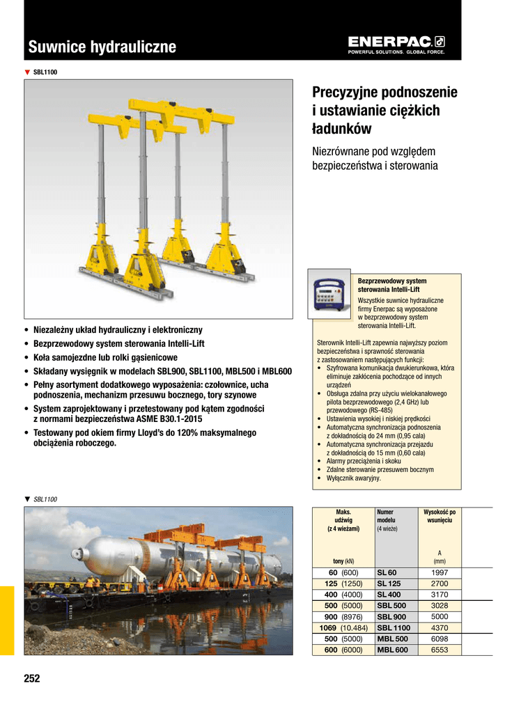 Suwnice hydrauliczne ▼ SBL1100 Precyzyjne podnoszenie i ustawianie ciężkich ładunków Niezrównane pod względem bezpieczeństwa i sterowania Bezprzewodowy system sterowania Intelli-Lift • Niezależny układ hydrauliczny i elektroniczny • Bezprzewodowy system sterowania Intelli-Lift • Koła samojezdne lub rolki gąsienicowe • Składany wysięgnik w modelach SBL900, SBL1100, MBL500 i MBL600 • Pełny asortyment dodatkowego wyposażenia: czołownice, ucha podnoszenia, mechanizm przesuwu bocznego, tory szynowe • System zaprojektowany i przetestowany pod kątem zgodności z normami bezpieczeństwa ASME B30.1-2015 • Testowany pod okiem firmy Lloyd’s do 120% maksymalnego obciążenia roboczego. Wszystkie suwnice hydrauliczne firmy Enerpac są wyposażone w bezprzewodowy system sterowania Intelli-Lift. Sterownik Intelli-Lift zapewnia najwyższy poziom bezpieczeństwa i sprawność sterowania z zastosowaniem następujących funkcji: • Szyfrowana komunikacja dwukierunkowa, która eliminuje zakłócenia pochodzące od innych urządzeń • Obsługa zdalna przy użyciu wielokanałowego pilota bezprzewodowego (2,4 GHz) lub przewodowego (RS-485) • Ustawienia wysokiej i niskiej prędkości • Automatyczna synchronizacja podnoszenia z dokładnością do 24 mm (0,95 cala) • Automatyczna synchronizacja przejazdu z dokładnością do 15 mm (0,60 cala) • Alarmy przeciążenia i skoku • Zdalne sterowanie przesuwem bocznym • Wyłącznik awaryjny. ▼ SBL1100 Maks. udźwig (z 4 wieżami) Numer modelu (4 wieże) A (mm) tony (kN) 60 125 400 500 900 1069 500 600 252 (600) (1250) (4000) (5000) (8976) (10.484) (5000) (6000) Wysokość po wsunięciu SL 60 SL 125 SL 400 SBL 500 SBL 900 SBL 1100 MBL 500 MBL 600 1997 2700 3170 3028 5000 4370 6098 6553 Suwnice hydrauliczne Suwnice hydrauliczne z podnoszeniem ładunków poniżej 400 ton na wysokość do 9 metrów. Suwnice hydrauliczne to bezpieczny, efektywny sposób podnoszenia i pozycjonowania ciężkich ładunków w zastosowaniach, w których tradycyjne suwnice byłyby nieodpowiednie i w których stałe konstrukcje napowietrzne dla suwnic roboczych nie mogą być stosowane. • Suwnica Super Boom Lift z serii SBL Wytrzymałe suwnice Super Boom Lift zapewniają większy udźwig, co umożliwia podnoszenie ładunków o masie powyżej 400 ton na wysokość niemal 12,2 metra. • Suwnica Mega Boom Lift z serii MBL Masywna suwnica Mega Boom Lift z serii MBL umożliwia podnoszenie ładunków o masie powyżej 600 ton na skrajną wysokość prawie 14,6 metra. Suwnice hydrauliczne są umieszczane na szynach, po których mogą się przemieszczać i układać ciężkie ładunki, wiele razy przy zaledwie jednym podnoszeniu. Firma Enerpac oferuje trzy serie systemów suwnic hydraulicznych: SL, SBL, MBL Udźwig z 4 wieżami: 61 - 1069 ton Wysokość podnoszenia: Wszystkie suwnice firmy Enerpac są dostarczane ze szczególnymi właściwościami i systemami sterowania, które zapewniają najlepszą stabilność i największe bezpieczeństwo. • Suwnica Super Lift z serii SL Atrakcyjny pod względem finansowym system Super Lift z serii SL zapewnia sterowanie i stabilność w codziennych zastosowaniach związanych Serie 3,49 - 14,55 metra ▼ Opcjonalne wyposażenie dodatkowe suwnicy W celu uzyskania pomocy należy skontaktować się drogą elektroniczną z firmą Enerpac pod adresem [email protected] Szyny ślizgowe Umożliwiają łatwe wypoziomowanie wieży suwnicy, dostępne w dwóch standardowych długościach: 3 i 6 m. Belki bramowe Sprzedawane w parach. Zawierają punkty podnoszenia i kieszenie na widły w celu ułatwienia ustawiania na wieżach suwnicy. Dostępne w standardowych długościach 8, 10 i 12 metrów. B A C E Stopień 1 Stopień 2 1) Stopień 3 transportowa Szerokośćszyny Wysokość Numer modelu (4 wieże) Maks. Maks. Maks. Maks. Maks. Maks. B (mm) (tony) B (mm) (tony) B (mm) (tony) C (mm) E (mm) (kg) 2) 3397 4635 5228 4988 8300 7004 – – 15 31 100 130 224 262 125 150 4956 6700 7236 6898 11300 9668 12.867 14.552 15 31 100 130 148 169 125 150 – – 9144 8608 – 12.002 – – – – 46 75 – 94 – – 2034 2762 3170 3028 2243 2244 2243 2525 770 812 1218 1218 1218 1218 1682 1982 1050 2130 4600 6300 13.350 11.950 19.750 20.950 wysokość udźwig wysokość udźwig wysokość udźwig System przesuwu bocznego z zasilaniem Napęd elektryczny sterowany za pomocą pilotów do suwnicy. Każdy zestaw składa się z 4 urządzeń i 2 drążków przedłużających. Ucha do podnoszenia SL 60 SL 125 SL 400 SBL 500 SBL 900 SBL 1100 MBL 500 MBL 600 Suwnice MBL500 i MBL600 są to suwnice dwustopniowe. Stopnie 1 i 2 wysuwają się jednocześnie i zapewniają pełny udźwig na dowolnej wysokości. 2) Masa na każdą wieżę Mają na celu przeniesienie obciążenia na szczyt belki bramowej. Można do nich podczepić szekle o udźwigu 250 ton lub przymocować je bezpośrednio do ładunku. 1) www.enerpac.com 253