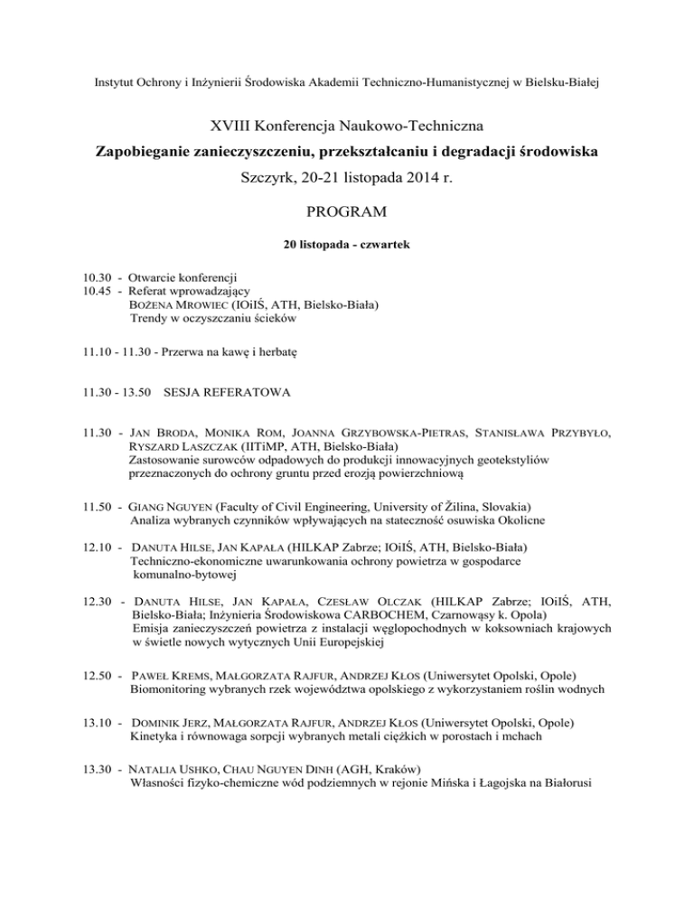 Instytut Ochrony i Inżynierii Środowiska Akademii Techniczno-Humanistycznej w Bielsku-Białej XVIII Konferencja Naukowo-Techniczna Zapobieganie zanieczyszczeniu, przekształcaniu i degradacji środowiska Szczyrk, 20-21 listopada 2014 r. PROGRAM 20 listopada - czwartek 10.30 - Otwarcie konferencji 10.45 - Referat wprowadzający BOŻENA MROWIEC (IOiIŚ, ATH, Bielsko-Biała) Trendy w oczyszczaniu ścieków 11.10 - 11.30 - Przerwa na kawę i herbatę 11.30 - 13.50 SESJA REFERATOWA 11.30 - JAN BRODA, MONIKA ROM, JOANNA GRZYBOWSKA-PIETRAS, STANISŁAWA PRZYBYŁO, RYSZARD LASZCZAK (IITiMP, ATH, Bielsko-Biała) Zastosowanie surowców odpadowych do produkcji innowacyjnych geotekstyliów przeznaczonych do ochrony gruntu przed erozją powierzchniową 11.50 - GIANG NGUYEN (Faculty of Civil Engineering, University of Žilina, Slovakia) Analiza wybranych czynników wpływających na stateczność osuwiska Okolicne 12.10 - DANUTA HILSE, JAN KAPAŁA (HILKAP Zabrze; IOiIŚ, ATH, Bielsko-Biała) Techniczno-ekonomiczne uwarunkowania ochrony powietrza w gospodarce komunalno-bytowej 12.30 - DANUTA HILSE, JAN KAPAŁA, CZESŁAW OLCZAK (HILKAP Zabrze; IOiIŚ, ATH, Bielsko-Biała; Inżynieria Środowiskowa CARBOCHEM, Czarnowąsy k. Opola) Emisja zanieczyszczeń powietrza z instalacji węglopochodnych w koksowniach krajowych w świetle nowych wytycznych Unii Europejskiej 12.50 - PAWEŁ KREMS, MAŁGORZATA RAJFUR, ANDRZEJ KŁOS (Uniwersytet Opolski, Opole) Biomonitoring wybranych rzek województwa opolskiego z wykorzystaniem roślin wodnych 13.10 - DOMINIK JERZ, MAŁGORZATA RAJFUR, ANDRZEJ KŁOS (Uniwersytet Opolski, Opole) Kinetyka i równowaga sorpcji wybranych metali ciężkich w porostach i mchach 13.30 - NATALIA USHKO, CHAU NGUYEN DINH (AGH, Kraków) Własności fizyko-chemiczne wód podziemnych w rejonie Mińska i Łagojska na Białorusi 14.00 - 15.00 - Obiad 15.10 - 16.50 SESJA REFERATOWA 15.10 - ALEKSANDRA STEINHOFF-WRZEŚNIEWSKA (ITP Falenty, Dolnośląski Ośrodek Badawczy, Wrocław) Przygotowanie gmin na terenach wiejskich do gospodarowania odpadami komunalnymi w świetle nowych regulacji prawnych 15.30 - ALEKSANDRA STEINHOFF-WRZEŚNIEWSKA, MARIA STRZELCZYK (ITP Falenty, Dolnośląski Ośrodek Badawczy, Wrocław) Ilość i struktura odpadów opakowaniowych pochodzących z wiejskich gospodarstw domowych 15.50 - DARIUSZ BORDOSZEWSKI (Olten, Katowice) Badanie przebiegu procesu kompostowania organicznej frakcji odpadów komunalnych w systemie BIO-COM 16.10 - RAFAŁ MALINOWSKI (IIMPiB, Toruń) Polimery biodegradowalne szansą dla zrównoważonego rozwoju produkcji opakowań przyjaznych środowisku naturalnemu 16.30 - WACŁAW ZYZAK, MONIKA HUTNICZAK (IOiIŚ, ATH, Bielsko-Biała) Turystyka zrównoważona - teoria i praktyka 16.50 - 17.20 - Przerwa na kawę i herbatę 17.20 - 18.00 SESJA POSTEROWA (postery pionowe – szerokość 70 cm max, wysokość 100 cm max) 19.00 - Uroczysta kolacja 21 listopada - piątek 7.30 - 8.30 - Śniadanie 8.30 - 13.00 - Wycieczka do elektrowni wodnej Porąbka-Żar Wyjazd na wycieczkę: godz. 8.30 Przewidywany termin powrotu: ok. godz. 13.00 13.00 - 13.20 - Przerwa na kawę i herbatę 13.20 - Referat: KONRAD SIKORA, JÓZEF MYRCZEK (IITiMP, ATH, Bielsko-Biała) Kontrasty termiczne w wybranych punktach pomiarowych na obszarze miasta Bielsko-Biała i w terenie pozamiejskim 13.40 - Dyskusja i zakończenie konferencji 14.00 - 15.00 - Obiad