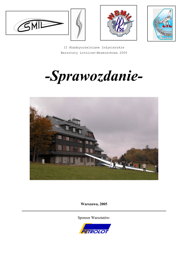 II Międzyuczelniane Inżynierskie Warsztaty Lotnicze-Bezmiechowa 2005 -Sprawozdanie- Warszawa, 2005 Sponsor Warsztatów: STOWARZYSZENIE MŁODYCH INŻYNIERÓW LOTNICTWA Al. Krakowska 110/114, 02-256 Warszawa tel./fax: 846-00-11 wew. 876 Spis treści: 1. Wstęp ................................................................................................................................ 3 2. Organizatorzy. ........................................................................................................... 4 Stowarzyszenie Młodych Inżynierów Lotnictwa......................................... 4 Wydział Mechaniczny Energetyki i Lotnictwa Politechniki Warszawskiej ................................................................................................................... 4 Wydział Budowy Maszyn i Lotnictwa Politechniki Rzeszowskiej .. 4 Wydział Mechaniczno- Energetyczny Politechniki Wrocławskiej .. 4 3. Komitet Organizacyjny .......................................................................................... 5 4. Kosztorys oraz jego realizacja..................................................................... 6 5. Program II MIWL oraz jego realizacja ...................................................... 7 6. Wnioski i podsumowanie ...................................................................................... 10 6.1 Organizacja MIWL .............................................................................................. 10 6.1.1 Uwagi co do organizacji MIWL ........................................................ 11 6.1.2 Propozycje organizacyjne................................................................. 11 6.2 Finansowanie MIWL............................................................................................ 13 6.3 MIWL 2006............................................................................................................... 14 7. Galeria .......................................................................................................................... 15 8. Płyta CD. ..................................................................................................................... 22 2 Tel. +48 602 580953 +48 609 138233 +48 607 624728 http:// www.smil.org.pl e-mail: [email protected] REGON: 015527900 NIP: 534-22-33-891 STOWARZYSZENIE MŁODYCH INŻYNIERÓW LOTNICTWA Al. Krakowska 110/114, 02-256 Warszawa tel./fax: 846-00-11 wew. 876 1. Wstęp Stowarzyszenie Młodych Inżynierów Lotnictwa, Politechnika WarszawskaWydział MEiL, Politechnika Rzeszowska- Wydział BMiL oraz Politechnika Wrocławska- Wydział ME to organizatorzy II Międzyuczelnianych Inżynierskich Warsztatów Lotniczych- Bezmiechowa 2005 które odbyły się w dniach 6-10 lipca 2005. Celem tylko Warsztatów uczelni było technicznych) zachęcenie oraz studentów pracowników uczelni naukowych wyższych (nie politechnik do szukania nowych rozwiązań na polu Bezzałogowych Statków Latających. MIWL obok pogłębienia wiedzy teoretyczno - praktycznej mają dać możliwość nagrodzenia całorocznych wysiłków zespołów studenckich poprzez organizacje konkursu na projekt i model BSL, który najlepiej spełni wymagania postawione przez Organizatorów. Dodatkową intencją organizatorów jest wprowadzenie do szkolnictwa wyższego (wydziały o specjalności lotniczej) formy edukacji stosowanej od lat na uczelniach zagranicznych jaką jest uczestnictwo w różnego rodzaju konkursach- projektach, które wymagają pracy zespołowej oraz pozwalają przejść przez cały proces od koncepcji aż do produkcji. Warsztaty odbyły się w ośrodku Politechniki Rzeszowskiej w Bezmiechowej w dniach 6-10 lipca. Dodatkowe informacje dostępne są na stronie SMIL: www.smil.org.pl. W imieniu Komitetu Organizacyjnego mgr inż. Marcin Trajer 3 Tel. +48 602 580953 +48 609 138233 +48 607 624728 http:// www.smil.org.pl e-mail: [email protected] REGON: 015527900 NIP: 534-22-33-891 STOWARZYSZENIE MŁODYCH INŻYNIERÓW LOTNICTWA Al. Krakowska 110/114, 02-256 Warszawa tel./fax: 846-00-11 wew. 876 2. Organizatorzy. MIWL zorganizowane zostały są przez: Stowarzyszenie Młodych Inżynierów Lotnictwa Organizacja, która pragnie zintegrować środowisko ludzi, wiążących swoją przyszłość zawodową i naukową z lotnictwem. Nie bez znaczenia pozostaje słowo "Młodych" w nazwie organizacji. To przede wszystkim dla nich powołane jest Stowarzyszenie. Wydział Mechaniczny Warszawskiej Energetyki i Lotnictwa Politechniki Wydział Mechaniczny Energetyki i Lotnictwa powstał w roku 1960 z połączenia Wydziału Lotniczego oraz Wydziału Mechanicznego Konstrukcyjnego. Wydział jest największym i jednym z najstarszych wydziałów kształcących w zakresie lotnictwa, robotyki i techniki cieplnej w Polsce. Wydział Budowy Maszyn i Lotnictwa Politechniki Rzeszowskiej Wydział Budowy Maszyn i Lotnictwa, który do 1988 r. nosił nazwę Wydziału Mechanicznego, jest tą jednostką organizacyjną Uczelni, od którego działalności rozpoczęły się wyższe studia techniczne w Rzeszowie. Wydział Mechaniczno- Energetyczny Politechniki Wrocławskiej Wydział Politechniki Mechaniczno-Energetyczny Wrocławskiej. Katedry, należy które w do najstarszych roku 1954 weszły wydziałów w skład samodzielnego Wydziału Mechaniczno-Energetycznego powstały w latach 19451950 w obrębie Wydziału Mechaniczno-Elektrotechnicznego. Po jego podziale znalazły się na Wydziale Mechanicznym. Wydział Mechaniczno-Energetyczny powstał w 1954 r. na bazie Oddziału Energetycznego istniejącego na Wydziale Mechanicznym od roku 1951. 4 Tel. +48 602 580953 +48 609 138233 +48 607 624728 http:// www.smil.org.pl e-mail: [email protected] REGON: 015527900 NIP: 534-22-33-891 STOWARZYSZENIE MŁODYCH INŻYNIERÓW LOTNICTWA Al. Krakowska 110/114, 02-256 Warszawa tel./fax: 846-00-11 wew. 876 3. Komitet Organizacyjny Komitet zaangażowanych Organizacyjny składał się z przedstawicieli jednostek w organizacje MIWL: SMIL- 