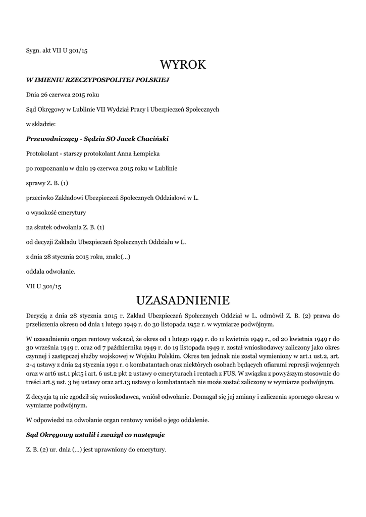 Sygn. akt VII U 301/15 WYROK W IMIENIU RZECZYPOSPOLITEJ POLSKIEJ Dnia 26 czerwca 2015 roku Sąd Okręgowy w Lublinie VII Wydział Pracy i Ubezpieczeń Społecznych w składzie: Przewodniczący - Sędzia SO Jacek Chaciński Protokolant - starszy protokolant Anna Łempicka po rozpoznaniu w dniu 19 czerwca 2015 roku w Lublinie sprawy Z. B. (1) przeciwko Zakładowi Ubezpieczeń Społecznych Oddziałowi w L. o wysokość emerytury na skutek odwołania Z. B. (1) od decyzji Zakładu Ubezpieczeń Społecznych Oddziału w L. z dnia 28 stycznia 2015 roku, znak:(...) oddala odwołanie. VII U 301/15 UZASADNIENIE Decyzją z dnia 28 stycznia 2015 r. Zakład Ubezpieczeń Społecznych Oddział w L. odmówił Z. B. (2) prawa do przeliczenia okresu od dnia 1 lutego 1949 r. do 30 listopada 1952 r. w wymiarze podwójnym. W uzasadnieniu organ rentowy wskazał, że okres od 1 lutego 1949 r. do 11 kwietnia 1949 r., od 20 kwietnia 1949 r do 30 września 1949 r. oraz od 7 października 1949 r. do 19 listopada 1949 r. został wnioskodawcy zaliczony jako okres czynnej i zastępczej służby wojskowej w Wojsku Polskim. Okres ten jednak nie został wymieniony w art.1 ust.2, art. 2-4 ustawy z dnia 24 stycznia 1991 r. o kombatantach oraz niektórych osobach będących ofiarami represji wojennych oraz w art6 ust.1 pkt5 i art. 6 ust.2 pkt 2 ustawy o emeryturach i rentach z FUS. W związku z powyższym stosownie do treści art.5 ust. 3 tej ustawy oraz art.13 ustawy o kombatantach nie może zostać zaliczony w wymiarze podwójnym. Z decyzja tą nie zgodził się wnioskodawca, wniósł odwołanie. Domagał się jej zmiany i zaliczenia spornego okresu w wymiarze podwójnym. W odpowiedzi na odwołanie organ rentowy wniósł o jego oddalenie. Sąd Okręgowy ustalił i zważył co następuje Z. B. (2) ur. dnia (...) jest uprawniony do emerytury. W okresie od 1 lutego1949 r. do 11 kwietnia 1949 r. odbył kurs zastępców dowódców batalionów brygad (...) w Ł. przy Oficerskiej Szkole (...) (...) ( świadectwo nr 82, k. 46 t. IV a.e.). Wyrokiem Sądu Wojewódzkiego w Rzeszowie z dnia 30 lipca 1997 r. okres teen został zaliczony wnioskodawcy do stażu pracy(k 7.0 t. IV a.e.). W okresie od 20 kwietnia 1949 r., do 30 września 1949 r. wnioskodawca uczestniczył w przysposobieniu zawodowym i wojskowym w (...) Organizacji (...). Stosownie do art. 47 ustawy z dnia 25 lutego o1948 r. o powszechnym obowiązku przysposobienia zawodowego, wychowania fizycznego i przysposobienia wojskowego młodzieży oraz o organizacji spraw kultury fizycznej i sportu powszechny obowiązek przysposobienia zawodowego obejmował: a) naukę, b) wykonywanie pracy okresowej, c) wykonywanie pracy dorywczej. Od 7 października 1949 r. do 19 listopada 1952 r. wnioskodawca odbywał służbę wojskową (kopia książeczki wojskowej t.II a.r. zaświadczenie Wojskowej Komendy Uzupełnień w N. z dnia 24 kwietnia 1995 r.). Powyższe okresy zostały również uwzględnione przy ustaleniu prawa i wysokości emerytury (okoliczność bezsporna). W dniu 16 grudnia 2014 r. Z. B. (2) złożył wniosek o przeliczenie okresu służby w Organizacji (...) oraz okresu służby wojskowej od 1 lutego 1949 r. do 30 listopada 1952 r. w wymiarze podwójnym traktując je jako okresy represji. Powyższy stan faktyczny Sąd ustalił na podstawie dokumentów znajdujących się w aktach emerytalnych i rentowych wnioskodawcy, których autentyczność i wiarygodność nie była przez żadną ze stron kwestionowana. Nie ma zatem żadnych wątpliwości co do ich mocy dowodowej. Odwołalnie wnioskodawcy nie zasługuje na uwzględnienie. Stosownie do treści art. 13 ustawy z dnia z dnia 24 stycznia 1991 r. o kombatantach oraz niektórych osobach będących ofiarami represji wojennych i okresu powojennego okresy, o których mowa w art. 1 ust. 2 i art. 2-4, uwzględnia się w wymiarze podwójnym przy ustalaniu prawa do emerytury lub renty, na zasadach określonych w przepisach ustawy z dnia 17 grudnia 1998 r. o emeryturach i rentach z Funduszu Ubezpieczeń Społecznych. Przepis art.1 ust.2 ustawy wskazuje co należy rozumieć przez działalność kombatancką, art. 2 zaś określa jaką działalność uznaje się za równorzędną z działalnością kombatancką. Do okresów tych zalicza się także okresy przebywania w więzieniu, niewoli, obozach, ośrodkach zagłady i innych miejscach odosobnienia szczegółowo wymienionych w art.3 ustawy. W końcu przepis art.4 ust.1 stanowi., że przepisy ustawy stosuje się również do osób, które podlegały represjom wojennym i okresu powojennego. Represjami w rozumieniu ustawy są okresy przebywania: 1) z przyczyn politycznych, narodowościowych, religijnych i rasowych: a) w hitlerowskich więzieniach, obozach koncentracyjnych i ośrodkach zagłady, b) w innych miejscach odosobnienia, w których warunki pobytu nie różniły się od warunków w obozach koncentracyjnych, a osoby tam osadzone pozostawały w dyspozycji hitlerowskich władz bezpieczeństwa, c) w innych miejscach odosobnienia, w których pobyt dzieci do lat 14 miał charakter eksterminacyjny, a osoby tam osadzone pozostawały w dyspozycji hitlerowskich władz bezpieczeństwa; 2) z przyczyn narodowościowych i rasowych w gettach; 3) z przyczyn politycznych, religijnych i narodowościowych: a) w więzieniach oraz poprawczych obozach pracy i poprawczych koloniach pracy podległych Głównemu Zarządowi Obozów i Kolonii Poprawczych NKWD, a od marca 1946 r. MWD ZSRR, b) na przymusowych zesłaniach i deportacji w ZSRR; 4) w więzieniach lub innych miejscach odosobnienia na terytorium Polski na mocy skazania w latach 1944-1956, na podstawie przepisów wydanych przez władze polskie, przez sądy powszechne, wojskowe i specjalne albo w latach 1944-1956 bez wyroku - za działalność polityczną bądź religijną, związaną z walką o suwerenność i niepodległość. Analiza przepisu art.4 wskazuje, że okres przysposobienia zawodowego i wojskowego w (...) Organizacji (...) oraz okres pełnienia