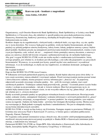 www.dabrowa-gornicza.pl Wygenerowano: 2017-03-07/00:07:31 Kurs na zysk - konkurs z nagrodami Anna Zubko, 5.03.2013 Organizatorzy, czyli Orzesko-Knurowski Bank Spółdzielczy, Bank Spółdzielczy w Leśnicy oraz Bank Spółdzielczy w Cieszynie chcą, aby młodzież w sposób praktyczny pozyskała podstawową wiedzę finansową, ekonomiczną, bankową i prawniczą, niezbędną do bezpiecznego i świadomego funkcjonowania na rynku. Konkurs skupia się na zagadnieniach, z którymi każdy z młodych ludzi, czy tego chcą czy nie, spotka się w życiu dorosłym. Nie wszyscy będą grać na giełdzie, wielu nie będzie biznesmenami, ale każdy prędzej czy później podpisze umowę kredytową, założy konto, lokatę, podpisze umowę o pracę i będzie płacił podatki. Każdemu przyda się umiejętność porównywania kredytów konsumenckich, wiedza o tym czym jest hipoteka, czek, weksel, ale też … znajomość różnic pomiędzy umową zleceniem, a umową o pracę czy umową o dzieło lub kwestie związane z pełnomocnictwami np. do rachunku bankowego. Aby grać i wygrać KURS NA ZYSK wcale nie trzeba myśleć o studiowaniu tych kierunków. Istotą nowego projektu, jest właśnie to, że konkurs jest dla każdego, a nie tylko dla pasjonatów czy przyszłych biznesmenów! Wystarczy, że uczestnik jest bystry, potrafi myśleć oraz analizować i wyszukiwać informacje. A co do technologii, to chyba nie ma wątpliwości, że młodzież doskonale posługuje się Internetem. Jak wygląda konkurs? Etap on-line KURSU NA ZYSK rusza 8 marca. W kilkunastu serwisach partnerskich pojawią się zadania. Każde będzie aktywne przez dwie doby i w tym czasie uczestnicy muszą odnaleźć i rozwiązać zadanie. Przed rozwiązywaniem można poznać temat i słowa kluczowe zadania, można przejrzeć serwisy informacyjne i „douczyć się”. Za poprawną odpowiedź uczestnik otrzymuje wirtualne punkty. Ale – jeśli źle rozwiąże zadanie, traci część zarobionych punktów. Trudniejsze zadania będą przewidywały „premię”. Uczestnik ponosi ryzyko braku wiedzy i zyskuje na jej posiadaniu – tak jak w świecie realnym. Musi być przygotowany na to, że zadania będą zamieszczane w różnym czasie, że nie wszystko odbywa się wg „planu lekcji”, ale przecież tak właśnie jest w „świecie dorosłym”. Każdy uczestnik gromadzi punkty na specjalnym wirtualnym koncie rozliczeniowym. Rozwiązywanie zadań, szukanie wiedzy, umiejętność śledzenia i szukania informacji w serwisach partnerskich to „praca” za którą uczestnicy otrzymują „wynagrodzenie” w postaci punktów. Im więcej punktów, tym większa szansa na nagrody. Zadania nie będą trudne – powinny być dostępne dla każdego ucznia. Można uczyć się rozwiązując je. Będą jednak wymagały myślenia i samodzielności. Nie jest to olimpiada wiedzy, raczej forma interaktywnych zawodów. KURS NA ZYSK w wersji on-line kończy się 8 kwietnia. Następne stopnie to powiatowe Półfinały 12 kwietnia oraz uroczysty Finał w Katowicach 15 czerwca, w formie quizu z udziałem publiczności. Nagrody, Patroni, Partnerzy Do wygrania czeka ponad osiemnaście tysięcy złotych oraz, dla uczniów szkół ponadgimnazjalnych, możliwość otrzymywania pierwszej pensji za praktyki w Banku BGK w Katowicach (minimum jeden miesiąc, a maksimum trzy miesiące). Partnerami KURSU NA ZYSK są: Grupa BPS, Izba Adwokacka w Katowicach, Izba Adwokacka w Opolu, Jastrzębska Spółka Węglowa, Powiatowy Urząd Pracy w Gliwicach. Wykonanie: CONCEPT Intermedia www.concept.net.pl Strona 1/4 www.dabrowa-gornicza.pl Wygenerowano: 2017-03-07/00:07:31 KURSU NA ZYSK otrzymał Patronat: Starosty Powiatu Cieszyńskiego, Starosty Powiatu Gliwickiego, Starosty Powiatu Krapkowickiego, Starosty Powiatu Mikołowskiego, Starosty Powiatu Oleskiego, Prezydenta Miasta Opole, Starosty Powiatu Rybnickiego i Starosty Powiatu Strzeleckiego. Zapraszamy do wzięcia udziału w KURSIE NA ZYSK! ……………………………………………………………………………………………………………… …………………………………………................ Informacje dodatkowe Skąd pomysł na konkurs i dlaczego akurat banki spółdzielcze? Lokalny bank spółdzielczy jako finansowa instytucja pierwszego kontaktu? Czemu nie? To właśnie z BS-em warto uczyć się finansów, ekonomii i prawa. Dlaczego? Bo te banki od ponad stu lat funkcjonują z lokalną społecznością, bo to sąsiedzi, znajomi i jednocześnie aktywni, profesjonalni uczestnicy rynku finansowego. A może po prostu warto liczyć na siebie i na swój region…? „ (… ) dzięki ekonomii można być bankowcem, łatwiej jest w przyszłości obliczyć rachunki, można nauczyć się dobrze dysponować pieniędzmi i nauczyć się oszczędzać. Ponadto, ekonomiści umieją zagospodarować pieniędzmi tak, by nie pracować, ale zarabiać pieniądze!” Badanie, z którego pochodzi powyższy cytat wskazało również inne, ciekawe cechy. Otóż okazuje się, że „najmniej kłopotów sprawiają uczniom najprostsze czynności, takie jak zaoszczędzenie części kieszonkowego czy odmowa pożyczenia pieniędzy koledze. Mniej osób jest jednak w stanie wskazać kryteria, którymi należy się kierować przy wyborze dobrego banku, a niewiele więcej potrafi obliczyć odsetki od założonej lokaty” Z kolei wg danych z badania przeprowadzonego wśród młodzieży ponadgimnazjalnej w połowie 2012r. przez Centrum Badań nad Zachowaniami Ekonomicznymi aż 21,5 proc. licealistów, stwierdziło, że „konto, na którym ludzie mogą oszczędzać pieniądze na swoją przyszłą emeryturę, oznacza się skrótem NBP". Dla 14 proc. jest to WIG, a wg 11 proc. Forex! Prawidłową odpowiedź IKE podała połowa badanych. Jedna trzecia badanych przyznała, że nie poradziłaby sobie z otwarciem lokaty oszczędnościowej. Dla 65 proc. uczniów szkół średnich banki są instytucjami godnymi zaufania, jednak