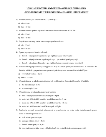 LOKALNE KRYTERIA WYBORU DLA OPERACJI Z DZIAŁANIA „RÓŻNICOWANIE W KIERUNKU DZIAŁALNOŚCI NIEROLNICZEJ” 1) Wnioskodawca jest członkiem LGD „SANŁĘG”: a) nie – 0 pkt b) tak – 10 pkt 2) Wnioskodawca spełnia kryteria kwalifikowalności określone w PROW: a) nie – 0 pkt b) tak – 40 pkt 3) Projekt sporządzony został na wymaganym formularzu: a) nie – 0 pkt b) tak – 40 pkt 4) Operacja przyczyni się do realizacji: a) dwóch i więcej celów ogólnych – po 5 pkt za każdy cel powyżej 1 b) dwóch i więcej celów szczegółowych – po 1 pkt za każdy cel powyżej 1 c) dwóch i więcej przedsięwzięć – po 1 pkt za każde przedsięwzięcie powyżej 1 5) Powierzchnia gospodarstwa, którą posiada lub, w którym pracuje wnioskodawca w stosunku do średniej wielkości gospodarstwa w gminach położonych na terenie działania LGD jest: a) równa lub wyższa – 0 pkt b) niższa – 5 pkt 6) Wnioskodawca w szkoleniach dotyczących problematyki Rozwoju Obszarów Wiejskich: a) nie uczestniczył – 0 pkt b) uczestniczył – 5 pkt 7) Wnioskowana kwota dofinansowania wynosi: a) 50% i więcej kosztów kwalifikowanych – 0 pkt b) mniej niż 50% do 40% kosztów kwalifikowanych – 5 pkt c) mniej niż 40% do 30% kosztów kwalifikowanych – 10 pkt d) mniej niż 30% kosztów kwalifikowanych – 15 pkt 8) Realizacja operacji spowoduje utworzenie w przeliczeniu na pełne etaty średniorocznie przez okres co najmniej dwóch lat: a) brak miejsc pracy – 0 pkt b) jednego miejsca pracy – 5 pkt c) dwóch miejsc pracy – 10 pkt d) powyżej trzech miejsc pracy – 15 pkt plus 5 pkt za każde jedno miejsce powyżej 3 9) Działalność, której operacja dotyczy, służyć będzie skupowi bądź zagospodarowaniu zasobów lokalnych, w tym lokalnych produktów rolnych i leśnych: a) nie – 0 pkt b) tak – 10 pkt 10) Działalność, której operacja dotyczy, oparta będzie na wykorzystaniu walorów środowiska naturalnego albo dziedzictwa kulturowego i historycznego, dorobku kulturalnego oraz tradycyjnego rzemiosła: a) nie – 0 pkt b) tak – 10 pkt 11) Operacja ma innowacyjny charakter: a) nie – 0 pkt b) tak – 5 pkt 12) Operacja jest komplementarna w stosunku do innych projektów realizowanych lub zrealizowanych na obszarze wdrażania LSR: a) nie – 0 pkt b) tak – 10 pkt 13) Działalność, której operacja dotyczy, służyć będzie ochronie środowiska naturalnego, porządku i czystości w środowisku: a) nie – 0 pkt b) tak – 10 pkt 14) Wdrożenie operacji, podniesie stopień zaspokojenia potrzeb mieszkańców na usługi: a) nie – 0 pkt b) tak – 5 pkt 15) Operacja stanowi dobry wzór do naśladowania: a) nie – 0 pkt b) tak – 5 pkt