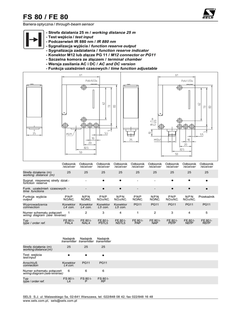 FS 80 / FE 80 Bariera optyczna / through-beam sensor - Strefa dzia³ania 25 m / working distance 25 m - Test wejcia / test input - Podczerwieñ IR 880 nm / IR 880 nm - Sygnalizacja wyjcia / function reserve output - Sygnalizacja zadzia³ania / function reserve indicator - Konektor M12 lub z³¹cze PG 11 / M12 connector or PG11 - Szczelna komora ze z³¹czem / terminal chamber - Wersja zasilania AC i DC / AC and DC version - Funkcja uzale¿nieñ czasowych / time function adjustable Odbiornik receiver Odbiornik receiver Odbiornik receiver Odbiornik receiver Odbiornik receiver Odbiornik receiver Odbiornik receiver Odbiornik receiver Odbiornik receiver 25 25 25 25 25 25 25 25 25 Sygnal. niepewnej strefy dzia³.function reserve - - - - - - - - Funk. uzale¿nieñ czasowych time functions - - - - - - - - Strefa dzia³ania (m) working distance (m) Funkcja wyjcia output PNP N.O./N.C. NPN N.O./N.C. PNP N.O.o.N.C. NPN N.O.o.N.C. PNP N.O./N.C. NPN N.O./N.C. PNP N.O.o.N.C. Wyprowadzenia connection Konektor L4 con. Konektor L4 con. Konektor L5 con. Konektor L5 con. PG11 PG11 PG11 PG11 PG11 2 3 4 1 2 3 4 5 FE 80 INAL4 FE 80 IPSTL5 FE 80 INSTL5 FE 80 IPAP FE 80 INAP FE 80 IPSTP FE 80 INSTP FE 80 IRSTP Numer schematu po³¹czeñ 1 wiring diagram (see reverse) Typ type / order ref. FE 80 IPAL4 Nadajnik Nadajnik Nadajnik transmitter transmitter transmitter Strefa dzia³ania (m) working distance (m) 25 25 25 - - - Konektor L4 con. PG11 PG11 6 6 6 FS 80 IL4 FS 80 IP FS 80 IRP Test wejcia test input Anschluß connection Numer schematu po³¹czeñ wiring diagram (see reverse) Typ type / order ref. SELS S.J. ul. Malawskiego 5a, 02-641 Warszawa, tel. 022/848 08 42, fax 022/848 16 48 www.sels.com.pl, [email protected] NPN Przekanik N.O.o.N.C. FS 80 / FE 80 Bariera optyczna / through-beam sensor Wyprowadzenia / wiring Rys. 1 / fig. 1 Prze³¹cznik funkcji czasowych Rys. 2 / fig. 2 Prze³¹cznik fun.wyj.MOD (NO - D ; NC - N) Stan normalny D Regulacja czasu T TIM Rys. 3 / fig. 3 Rys. 4 / fig. 4 Realizowane funkcje QH czujnika L1/L+ AIN - efekt od wykrywanego obiektu; QH - funkcja wyjcia (pin4) AIN 1 H N/L- 0 NC 1 C NO QH 0 D H QH Rys. 5 / fig. 5 1 1 2 3 4 0 D Jeden impuls H QH 1 T D H Opónienie wy³¹czenia 0 1 T D T QH T 1 2 3 4 T H T T QH min max T T T DC 0,01s 1 s D H QH UC 0,1s 10s 1 2 3 4 Opónienie w³¹czenia 1 T D 0 QH H Rys. 6 / fig. 6 0 QH H 0 1 T D 0 1 D 1 T 1 2 3 4 T T H 0 MOD TI M 1 4 Parametry elektryczne / Electrical data (typ.) Napiêcie zasilania: operating voltage: 10 ... 36 V DC 10 ... 36 V DC Napiêcie zasilania (UC): operating voltage (UC): Maksymalne têtnienia: max. residual ripple: 10 % 10 % Zabezpieczenie przed zm. pol. i krótk. przeci¹¿eniem: polarity reversal protection, short circuit protection: Pobór pr¹du bez obci¹¿.: power consumption (no load): Pokrêt³o reg. czasu T i prze³¹czniki pod pokryw¹ czujnika UC 20 ... 265 V UC 20 ... 265 V tak yes < 30 mA bei 24 V DC < 30 mA bei 24 V DC Pobór mocy (wersja AC) : power consumption (UC): Funkcja wyjcia: signal output: Max pr¹d wyjciowy: output current: Max pr¹d wyjciowy (wyrsja AC): output current (UC): Czêstotliwoæ prze³¹czania (ti/tp 1:1): switching frequency (at ppp 1:1): Czêstotliwoæ prze³¹czania (wersja AC): switching frequency (UC): < 2 VA < 2 VA patrz tabela see selection table 200 mA 200 mA 2 A (AC 240 V) 2 A (AC 240 V) 1000 Hz 1000 Hz 20 Hz 20 Hz Parametry optyczne / Optical data (typ.) Strefa dzia³ania: working distance: Regulacja czu³oci: sensitivity adjustment: 25 m 25 m 2 obrotowy potencjometr z podzia³k¹ 2 turn with indicator Rodzaj wiat³a: used light: IR 880 nm, pulsuj¹ce IR 880 nm, pulsed Norma warunków optycznych: ambient light: EN 60947-5-2 EN 60947-5-2 Parametry mechaniczne / Mechanical data Materia³ obudowy: casing material: Klasa ochrony: protection standard: PBTP, Crastin PBTP, crastin IP67 IP67 Temperatura pracy: ambient temperature range: -20 ... +60 °C -20 ... +60 °C -20 ... +80 °C -20 ... +80 °C Sygnalizacja funkcji wyjcia: output signal indicator: LED ¿ó³ty LED yellow Temperatura przechowywania: storage temperature range: Sygnalizacja niepewnej strefy dzia³ania: function reserve: LED zielony LED green Maksymalna d³ugoæ kabla: max. permitted cable length: 100 m 100 m Masa (wersja z konektorem): weight (plug): ca. 100 g app. 100 g Klasa bezpieczeñstwa: protection class: Powy¿szy czujnik nie mo¿e byæ stosowany w aplikacjach bezpieczeñstwa lub podobnych. These Proximity Switches are not suited for safety related applications. Pakowane bez akcesoriów do monta¿u packaging without mounting bracket SELS S.J. ul. Malawskiego 5a, 02-641 Warszawa, tel. 022/848 08 42, fax 022/848 16 48 www.sels.com.pl, [email protected]