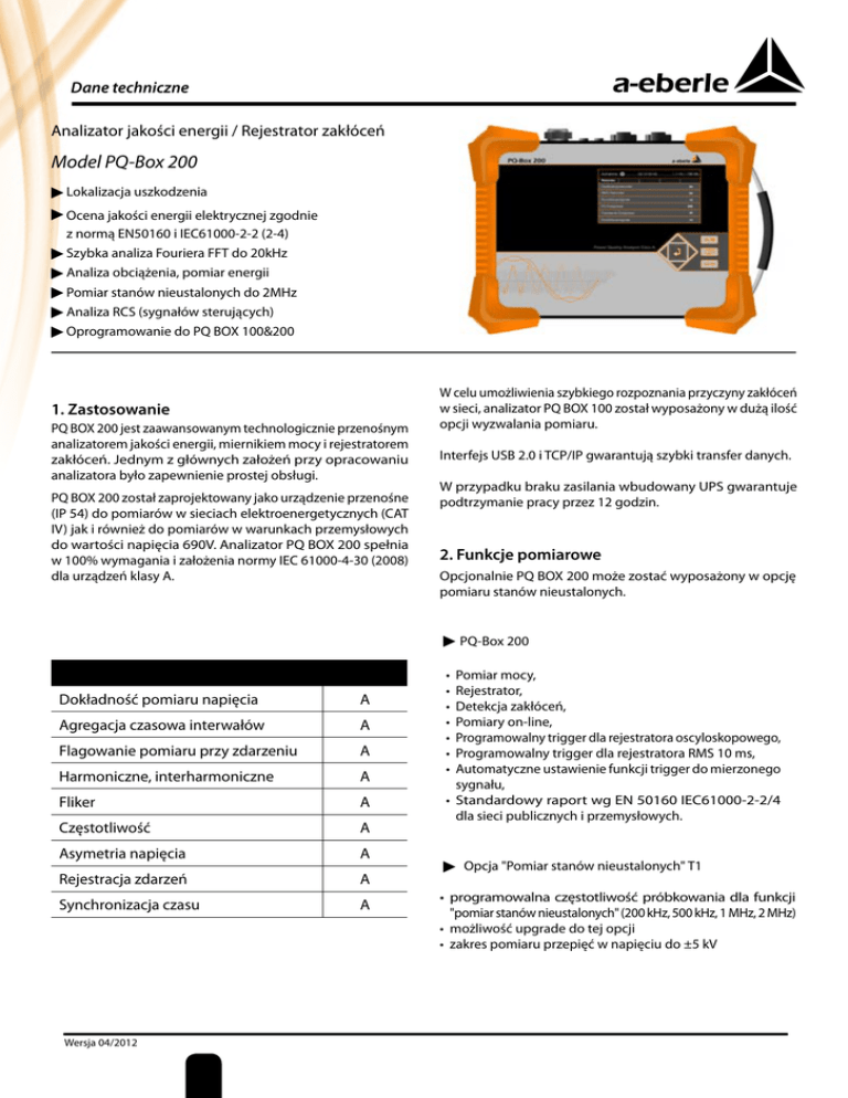 Dane techniczne Analizator jakości energii / Rejestrator zakłóceń Model PQ-Box 200 Lokalizacja uszkodzenia Ocena jakości energii elektrycznej zgodnie z normą EN50160 i IEC61000-2-2 (2-4) Szybka analiza Fouriera FFT do 20kHz Analiza obciążenia, pomiar energii Pomiar stanów nieustalonych do 2MHz Analiza RCS (sygnałów sterujących) Oprogramowanie do PQ BOX 100&200 1. Zastosowanie PQ BOX 200 jest zaawansowanym technologicznie przenośnym analizatorem jakości energii, miernikiem mocy i rejestratorem zakłóceń. Jednym z głównych założeń przy opracowaniu analizatora było zapewnienie prostej obsługi. PQ BOX 200 został zaprojektowany jako urządzenie przenośne (IP 54) do pomiarów w sieciach elektroenergetycznych (CAT IV) jak i również do pomiarów w warunkach przemysłowych do wartości napięcia 690V. Analizator PQ BOX 200 spełnia w 100% wymagania i założenia normy IEC 61000-4-30 (2008) dla urządzeń klasy A. W celu umożliwienia szybkiego rozpoznania przyczyny zakłóceń w sieci, analizator PQ BOX 100 został wyposażony w dużą ilość opcji wyzwalania pomiaru. Interfejs USB 2.0 i TCP/IP gwarantują szybki transfer danych. W przypadku braku zasilania wbudowany UPS gwarantuje podtrzymanie pracy przez 12 godzin. 2. Funkcje pomiarowe Opcjonalnie PQ BOX 200 może zostać wyposażony w opcję pomiaru stanów nieustalonych. PQ-Box 200 Parametr Klasa Dokładność pomiaru napięcia A Agregacja czasowa interwałów A Flagowanie pomiaru przy zdarzeniu A Harmoniczne, interharmoniczne A Fliker A Częstotliwość A Asymetria napięcia A Rejestracja zdarzeń A Synchronizacja czasu A Wersja 04/2012 1 • Pomiar mocy, • Rejestrator, • Detekcja zakłóceń, • Pomiary on-line, • Programowalny trigger dla rejestratora oscyloskopowego, • Programowalny trigger dla rejestratora RMS 10 ms, • Automatyczne ustawienie funkcji trigger do mierzonego sygnału, • Standardowy raport wg EN 50160 IEC61000-2-2/4 dla sieci publicznych i przemysłowych. Opcja "Pomiar stanów nieustalonych" T1 • programowalna częstotliwość próbkowania dla funkcji "pomiar stanów nieustalonych" (200 kHz, 500 kHz, 1 MHz, 2 MHz) • możliwość upgrade do tej opcji • zakres pomiaru przepięć w napięciu do ±5 kV Zwracamy uwagę na to. Wielkości pomiarowe/Funkcje PQ-Box 200 Automatyczne wykrywanie zdarzeń i ocena z normą: EN50160 (2011) / IEC61000-2-2 / IEC61000-2-12 /IEC61000-2-4 (Klasse 1; 2; 3) / NRS048 / IEEE519 Rejestracja z dowolnym interwałem (>2.500 parametrów równolegle) Napięcie: min. max. średnie Prąd: min. max. średni Moc P, Q, S, PF, cos phi, sin phi, tan phi Moc odkształcona D Energia: P, Q, P+, P-, Q+, Q Fliker (Pst, Plt) Asymetria w napięciu i prądzie Harmoniczne w napięciu zgodnie z EN 61000-4-30 klasa A Harmoniczne w napięciu z pasmem 200 Hz Harmoniczne w prądzie Harmoniczne w prądzie z pasmem 200 Hz Kąt fazowy harmonicznych THD w napięciu i prądzie, PWHD, PWC do 50 2kHz do 9kHz do 50 2kHz do 9kHz do 50 FFT dla napięcia i prądu RCS Częstotliwość DC do 20kHz 15/30 min interwał – P, Q, S, D, cos phi, sin phi … Tryb online Rejestrator oscyloskopowy Prostopadłościan mocy (czynna, bierna, pozorna i odkształcenia) Harmoniczne w napięciu i prądzie DC do 20kHz Interharmoniczne (U, I) DC do 20kHz Kierunek harmonicznych&kąt fazowy między harmonicznymi Wyzwalanie (Trigger) Wyzwalanie ręczne Wyzwalanie RMS sub-out (U, I) Wyzwalanie skokiem RMS (U, I) Wyzwalanie przesunięciem fazy Wyzwalanie obwiednią Wyzwalanie automatyczne Wyzwalanie wejściem binarnym (0 – 250V AC/DC; swell 48V) Opcja - rejestracja RCS 2 5Hz do 5kHz 3 Konstrukcja 3.1 Analiza danych pomiarowych • Wyjątkowo mocna budowa mechaniczna, • Stopień ochrony IP 54, • B rak ruchomych elementów (wentylator, twardy dysk), • Pamięć 1GB, • Pamięć może być rozszerzona przez kartę SD do 32GB (możliwość rejestracji do kilku lat). Zarejestrowane dane są przesyłane do dalszej analizy do PC za pomocą USB lub TCP/IP. Pobieranie danych nie wymaga dodatkowego zasilania; analizator jest zasilany przez USB. Oprogramowanie jest bezpłatnie dodawane do zestawu i może być instalowane na dowolnej ilości komputerów. Oprogramowanie dostarcza szeroki zakres funkcji do analizy obciążenia, jakości energii elektrycznej czy detekcji źródła zakłóceń w sieci zasilającej. Raporty zgodności z normą EN 50160/IEC61000-2-2(2-4) są generowane automatycznie. Dodatkowo możemy używać pomiarów online. Update oprogramowania jest darmowy i pobieramy go bezpośrednio ze strony internetowej. Oprogramowanie obsługuje analizatory PQ BOX 100 i 200. 3.2 Wejścia i wyjścia pomiarowe, peryferia Wejścia binarne 230 V, 4mm 5 Wejść napięciowych 4 wejścia prądowe L1, L2, L3, N Wejście analogowe 0 ... 1 V (prąd, temperatura, itp. 8 klawiszy Zasilanie 15 VDC RJ-45 / TCP / IP 3 Zegar GPS USB Zwracamy uwagę na to. 3.3 Kolorowy wyświetlacz Wyświetlacz analiz atora dostarcza informacji o błędnie podłączonych przewodach pomiarowych napięciowych i prądowych oraz wyświetla dane online o napięciu, prądzie, THD i mocy. Czerwone wskazanie odczytów ostrzega przed niepoprawnym podłączeniem analizatora. Dodatkowo na wyświetlaczu uzyskujemy informację o ilości zdarzeń czasie pomiaru. W celu zabezpieczenia przed nieuprawnionym użytkowaniem klawiatura może zostać zablokowana. 3.4 Przyciski Klawisz Start/Stop rozpoczyna pomiar lub kończy go. Dowolna ilość pomiarów może być zapisana bez konieczności wymazywania pamięci. Klawisz „manual trigger” umożliwia ręczne wystartowanie rejestracji przebiegów oscyloskopowych i wartości RMS. Używając funkcji „scrolling” możemy poruszać się po danych na wyświetlaczu. Tym samym możemy szybko sprawdzić poprawność podłączenia analizatora do sieci. Klawisz „setup” umożliwia przeprowadzenie zmian nastaw bezpośrednio w analizatorze PQ BOX 200. 3.5 Synchronizacja czasu Porównanie danych w różnych analizatorów w