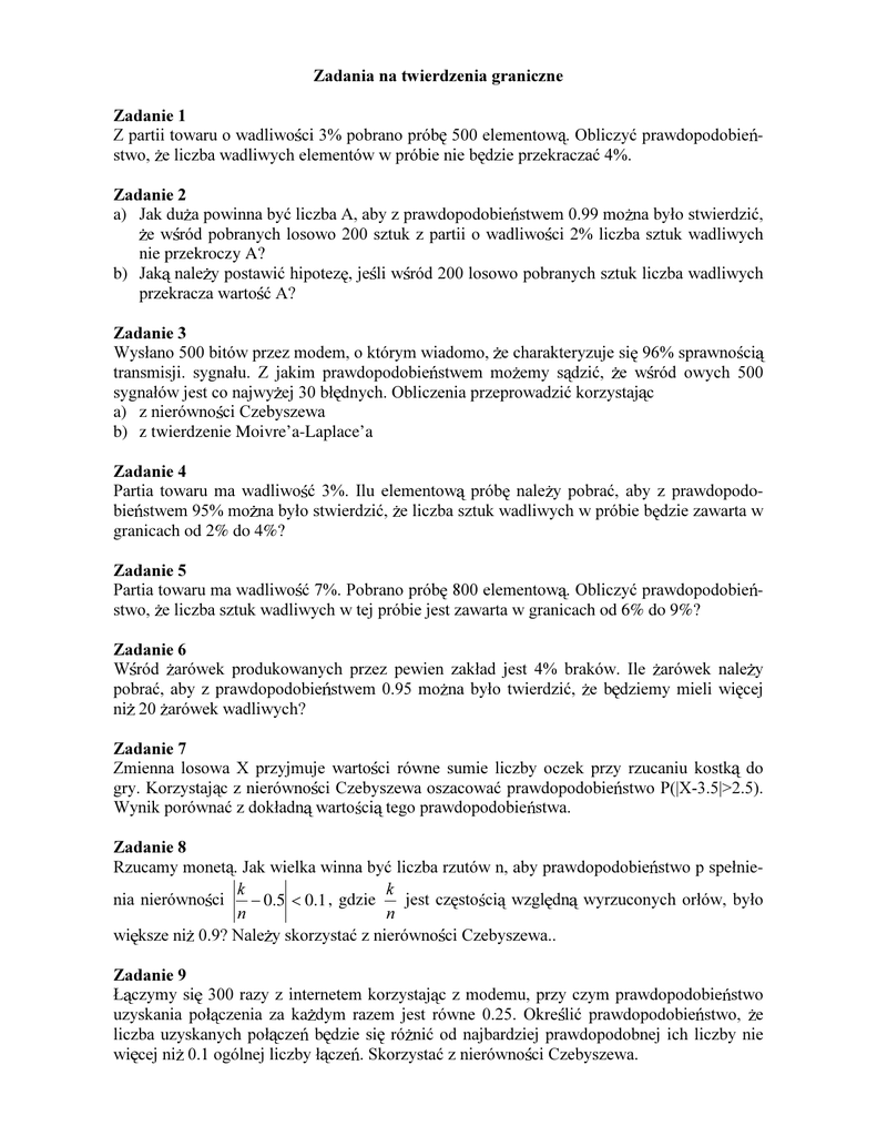 =DGDQLDQDWZLHUG]HQLDJUDQLF]QH =DGDQLH =SDUWLLWRZDUXRZDGOLZR FLSREUDQRSUyE HOHPHQWRZ 2EOLF]\üSUDZGRSRGRELH VWZR HOLF]EDZDGOLZ\FKHOHPHQWyZZSUyELHQLHE G]LHSU]HNUDF]Dü =DGDQLH a) -DNGX DSRZLQQDE\üOLF]ED$DE\]SUDZGRSRGRELH VWZHPPR QDE\áRVWZLHUG]Lü HZ UyGSREUDQ\FKORVRZRV]WXN]SDUWLLRZDGOLZR FLOLF]EDV]WXN ZDGOLZ\FK nie przekroczy A? b) -DN QDOH \SRVWDZLüKLSRWH] MH OLZ UyGORVRZRSREUDQ\FKV]WXNOLF]EDZDGOLZ\FK SU]HNUDF]DZDUWR ü$" =DGDQLH :\VáDQRELWyZSU]H]PRGHPRNWyU\PZLDGRPR HFKDUDNWHU\]XMHVL VSUDZQR FL WUDQVPLVML V\JQDáX = MDNLP SUDZGRSRGRELH VWZHP PR HP\ V G]Lü H Z UyG RZ\FK V\JQDáyZMHVWFRQDMZ\ HMEá GQ\FK2EOLF]HQLDSU]HSURZDG]LüNRU]\VWDM F a) ]QLHUyZQR FL&]HE\V]HZD b) z twierdzenie Moivre’a-Laplace’a =DGDQLH 3DUWLD WRZDUX PD ZDGOLZR ü ,OX HOHPHQWRZ SUyE QDOH \ SREUDü DE\ ] SUDZGRSRGoELH VWZHPPR QDE\áRVWZLHUG]Lü HOLF]EDV]WXNZDGOLZ\FKZSUyELHE G]LH]DZDUWDZ granicach od 2% do 4%? =DGDQLH 3DUWLDWRZDUXPDZDGOLZR ü3REUDQRSUyE HOHPHQWRZ 2EOLF]\üSUDZGRSRGRELH VWZR HOLF]EDV]WXNZDGOLZ\FKZWHMSUyELHMHVW]DZDUWDZJUanicach od 6% do 9%? =DGDQLH : UyG DUyZHN SURGXNRZDQ\FK SU]H] SHZLHQ ]DNáDG MHVW EUDNyZ ,OH DUyZHN QDOH \ SREUDü DE\ ] SUDZGRSRGRELH VWZHP PR QD E\áR WZLHUG]Lü H E G]LHP\ PLHOL ZL FHM QL DUyZHNZDGOLZ\FK" =DGDQLH =PLHQQD ORVRZD ; SU]\MPXMH ZDUWR FL UyZQH VXPLH OLF]E\ RF]HN SU]\ U]XFDQLX NRVWN GR JU\.RU]\VWDM F]QLHUyZQR FL&]HE\V]HZDRV]DFRZDüSUDZGRSRGRELH VWZR3_;_! :\QLNSRUyZQDü]GRNáDGQ ZDUWR FL WHJRSUDZGRSRGRELH VWZD =DGDQLH 5]XFDP\PRQHW -DNZLHONDZLQQDE\üOLF]EDU]XWyZQDE\SUDZGRSRGRELH VWZRSVSHáQLeN N QLD QLHUyZQR FL - 0.5 < 0.1 , gdzie MHVW F] VWR FL Z]JO GQ Z\U]XFRQ\FK RUáyZ E\áR Q Q ZL NV]HQL "1DOH \VNRU]\VWDü]QLHUyZQR FL&]HE\V]HZD =DGDQLH à F]\P\VL UD]\]LQWHUQHWHPNRU]\VWDM F]PRGHPXSU]\F]\PSUDZGRSRGRELH VWZR X]\VNDQLD SRá F]HQLD ]D ND G\P UD]HP MHVW UyZQH 2NUH OLü SUDZGRSRGRELH VWZR H OLF]EDX]\VNDQ\FK SRá F]H E G]LH VL Uy QLüRGQDMEDUG]LHM SUDZGRSRGREQHM LFK OLF]E\ QLH ZL FHMQL RJyOQHMOLF]E\á F]H 6NRU]\VWDü]QLHUyZQR FL&]HE\V]HZD =DGDQLH :DULDQFMD ND GHM ] QLH]DOH Q\FK ]PLHQQ\FK ORVRZ\FK R MHGQDNRZ\P UR]NáDG]LH MHVW UyZQD2EOLF]\üSUDZGRSRGRELH VWZR H UHGQLDW\FK]PLHQQ\FKRGFK\OLVL RGMHMZDUWoFLRF]HNLZDQHMQLHZL FHMQL R =DGDQLH =PLHQQDORVRZD<MHVW UHGQL DU\WPHW\F]Q QLH]DOH Q\FK]PLHQQ\FKORVRZ\FKRMHdQDNRZ\PUR]NáDG]LH]ZDUWR FL RF]HNLZDQ LZDULDQFM 2EOLF]\üSUDZGRSRGRELH VWZR H<SU]\MPLHZDUWR ü]SU]HG]LDáX =DGDQLH =PLHQQD ORVRZD < MHVW UHGQL DU\WPHW\F]Q QLH]DOH Q\FK ]PLHQQ\FK ORVRZ\FK R MHGQDNoZ\PUR]NáDG]LHDZDULDQFMDND GHJRVNáDGQLNDZ\QRVL,OHQDOH \Z]L üVNáDGQLNyZDE\ <]SUDZGRSRGRELH VWZHPFRQDMPQLHMQLHRGFK\ODáDVL RGVZHMZDUWR FLRF]HNLZaQHMRZL FHMQL R" =DGDQLH 5]XFDP\UD]\NRVWN GRJU\=QDOH üJUDQLFHZNWyU\FK]SUDZGRSRGRELH VWZHP E G]LH]DZLHUDüVL á F]QDOLF]EDRF]HN =DGDQLH 3U]\G]LDáDQLXSHZQHJRSURJUDPXNRPSXWHURZHJRQDOH \GRGDüOLF]E]NWyU\FKND GD MHVW GDQD ] GRNáDGQR FL -m =DNáDGDM F H Eá G\ ]DRNU JOH V Z]DMHPQLH QLH]DOH QH L PDM UR]NáDG UyZQRPLHUQ\ Z SU]HG]LDOH ¢10-m, 0.5¢10-m ]QDOH ü JUDQLFH Z NWyU\FK ] SUDZGRSRGRELH VWZHPZL NV]\PQL ]DZLHUDüVL E G]LHá F]Q\UR]NáDGVXP\ =DGDQLH 3DUWLD]DZLHUDE EUDNyZ-DNLHMHVWSUDZGRSRGRELH VWZRS HZSUyELHOLF] FHMQ N sztuk stosunek JG]LHNOLF]QDEUDNyZRGFK\OLVL RGERPQLHMQL "7RVDPR]DGDQLH Q QDOH \UR]ZL ]DüGODQ RUD]Q &RG]LHMHVL ]SUDZGRSRGRELH VWZHPSJG\OLFzEDQZ]UDVWD"-DNLHJRWZLHUG]HQLDLOXVWUDFM VWDQRZL SRZ\ V]HWU]\SU]\SDGNL"6NRU]\VWDM] QLHUyZQR FL&]HE\V]HZD =DGDQLH 3UDZGRSRGRELH VWZRZ\SURGXNRZDQLDGHWDOXSLHUZV]HMMDNR FLZSHZQ\P]DNáDG]LHZ\QRVL 2EOLF]\üSUDZGRSRGRELH VWZRWHJR HZ UyGORVRZRZ]L W\FKGHWDOLE G]LHGeWDOLSLHUZV]HMMDNR FL =DGDQLH 5]XFDP\V\PHWU\F]Q PRQHW =QDOH üSUDZGRSRGRELH VWZR HRU]HáZ\SDGQLHUD]\ =DGDQLH -DNLHMHVWSUDZGRSRGRELH VWZRZ\VW SLHQLDUD]\]MDZLVND$ ZVHULLGR ZLDGF]H MH HOLGR ZLDGF]HQLDV QLH]DOH QHLSUDZGRSRGRELH VWZR]MDZLVND$Z\QRVL =DGDQLH :RNUHVLHKGRNRQDQRORVRZRá F]H PRGHPX]OLQL WHOHIRQLF]Q -DNLHMHVWSUDZGoSRGRELH VWZR HZSU]HG]LDOHF]DVXOLF]EDá F]H ]PLH FLVL PL G]\L" 2GSRZLHG]L 1. 0.9065 2. a) A EZDGOLZR ü! 3. a) p>1/3 b) p 0.9887 4. n = 1118 5. 0.8532 6. ok. 1485 7. p ÊGRNáDGQDZDUWR üZ\QRVLS MDNRSUDZGRS]GDU]HQLDQLHPR Oiwego 8. n > 250 9. p Ë 0.938 10. 0.77 11. 0.97590 12. 450000 13. 3500 140 14. ¡3/2¢10-m+2 15. dla n=100 p Ë 0.96, dla n=400 p Ë 0.9900, dla n=1600 p Ë 0.9975 16. tw. lokalnego Moivre’ a-Laplace’ a: j(-1.02)/¡24 = 0.04385 17. j/w: j(2)/50 = 0.00108 18. j/w: j(0)/7.05 = 0.0566 19. tw. globalne Moivre’ a-Laplace’ a: P(40 Ê k Ê 60) f(2) - f(-2) = 0.9544