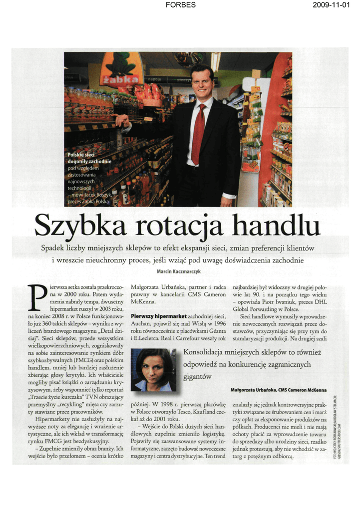 FORBES 2009-11-01 Polskie sieci dogoniły zachodnie pod względem najnowszych technologii / - mówi JacekjJcszyk, prezes Żabka Polska Szybka rotacja handlu Spadek liczby mniejszych sklepów to efekt ekspansji sieci, zmian preferencji klientów i wreszcie nieuchronny proces, jeśli wziąć pod uwagę doświadczenia zachodnie Marcin Kaczmarczyk P ierwsza setka została przekroczo na w 2000 roku. Potem wyda rzenia nabrały tempa, dwusetny hipermarket ruszył w 2003 roku, na koniec 2008 r. w Polsce funkcjonowa ło już 360 takich sklepów - wynika z wy liczeń branżowego magazynu „Detal dzi siaj". Sieci sklepów, przede wszystkim wielkopowierzchniowych, zogniskowały na sobie zainteresowanie rynkiem dóbr szybkozby walnych (FMCG) oraz polskim handlem, mniej lub bardziej zasłużenie zbierając głosy krytyki. Ich właściciele mogliby pisać książki o zarządzaniu kry zysowym, żeby wspomnieć tylko reportaż „Trzecie życie kurczaka" TVN obrazujący przemyślny „recykling" mięsa czy zarzu ty stawiane przez pracowników. Hipermarkety nie zasłużyły na naj wyższe noty za elegancję i wrażenie ar tystyczne, ale ich wkład w transformację rynku FMCG jest bezdyskusyjny. - Zupełnie zmieniły obraz branży. Ich wejście było przełomem - ocenia krótko Małgorzata Urbańska, partner i radca prawny w kancelarii CMS Cameron McKenna. Pierwszy hipermarket zachodniej sieci, Auchan, pojawił się nad Wisłą w 1996 roku równocześnie z placówkami Geanta i E.Leclerca. Real i Carrefour weszły rok £1 najbardziej był widoczny w drugiej poło wie lat 90. i na początku tego wieku - opowiada Piotr Iwaniuk, prezes DHL Global Forwarding w Polsce. Sieci handlowe wymusiły wprowadze nie nowoczesnych rozwiązań przez do stawców, przyczyniając się przy tym do standaryzacji produkcji. Na drugiej szali Konsolidacja mniejszych sklepów to również odpowiedź na konkurencję zagranicznych gigantów później. W 1998 r. pierwszą placówkę w Polsce otworzyło Tesco, Kaufland cze kał aż do 2001 roku. - Wejście do Polski dużych sieci han dlowych zupełnie zmieniło logistykę. Pojawiły się zaawansowane systemy in formatyczne, zaczęto budować nowoczesne magazyny i centra dystrybucyjne. Ten trend Małgorzata Urbańska, CMS Cameron McKenna znalazły się jednak kontrowersyjne prak tyki związane ze śrubowaniem cen i marż czy opłat za eksponowanie produktów na półkach. Producenci nie mieli i nie mają ochoty płacić za wprowadzenie towaru do sprzedaży albo urodziny sieci, rzadko jednak protestują, aby nie wchodzić w za targ z potężnym odbiorcą. FORBES Potężnym, ale nie wszechmocnym. Giganci czują na plecach oddech konku rencji. Co prawda w 2007 i 2008 r. w Polsce ubyło około 6 tys. małych sklepów (10 proc.) i był to już kolejny rok spadku (da ne The Nielsen Company). Przybywa za to średnich placówek (w tym samym cza sie ich liczba zwiększyła się z 31,9 tys. do 32,5 tys.) oraz supermarketów (wzrost z 3,5 tys. do 3,9 tys.), w czym mają udział i właściciele hipermarketów. W siłę rosną także sieci z rodzimymi korzeniami, takie jak Żabka. Zmiany w strukturze sprzedaży FMCG odpowiadają preferencjom klientów. Z ba dań Nielsena wynika, że Polacy coraz rzadziej robią zakupy w sklepach osiedlo wych (w 2007 r. przeciętnie 15 razy w miesiącu, w 2008 r. 13), z taką samą częstotliwością odwiedzają hipermarkety (5 razy w miesiącu), częściej za to chodzą do dyskontów (8 razy w miesiącu w 2008 roku wobec 6 wizyt w 2007 roku). Według różnych firm badawczych obecnie około 60 proc. handlu przypada w Polsce na małe sklepy, na rynkach naj bardziej rozwiniętych wskaźnik ten się ga 20 procent. Ale w Hiszpanii, Portugalii i innych krajach basenu Morza Śródziemnego oscyluje on przeciętnie między 50 a 60 procent. Wynika to między innymi ze struktury społeczeństwa: znaczna część klientów, podobnie jak w Polsce, pocho dzi z gospodarstw wiejskich. Liczby bezwzględne pokazują jednak, że zmiany są nieuchronne. Nad Wisłą działa około 150 tys. sklepów sprzedają cych produkty FMCG, w Hiszpanii blisko 53 tysiące (kraj ten ma o ponad 8 mln więcej mieszkańców niż Polska). Duże znaczenie dla przyszłej struk tury rynku ma zaangażowanie polityków hamujących ekspansję sieci dużych skle pów. Taką wymowę mają przepisy o za kazie handlu w niektóre dni świąteczne nieobejmujące placówek rodzinnych czy ograniczenia dotyczące inwestycji na rzucane przez niektóre samorządy. - Wprowadzane są kolejne regulacje obniżające konkurencyjność gospodar ki i zwiększające koszty sieci handlowych - ocenia Jacek Roszyk, prezes spółki Żabka Polska. - Politycy szukają sposo bów, by utrudnić działania branży, która tworzy około 20 proc. wartości PKB kraju i zatrudnia kilkaset tysięcy osób - dodaje. Branży, która tak jak inne musi stawić czoło kryzysowi. Z raportu The Nielsen Company wy nika, że jeszcze w 2008 r. sprzedaż pod stawowych produktów (pierwszej potrze by) zwiększyła się w Polsce o 16,5 proc, najwięcej w całej Europie. Mniejszy wzrost zanotowały druga w kolejności Turcja (13 proc.) i Czechy (11,7 proc), a największy spadek Irlandia (-3,8 proc.) i Dania (-2,9 proc). Wyniki za ten rok mogą nie być równie optymistyczne. International Paper Kwidzyn szacuje, że w pierwszym półroczu zapotrzebowa nie na opakowania towarów luksusowych 2009-11-01 spadło o kilkanaście procent w stosunku do ubiegłego roku. - Klienci większą wagę przywiązują do ceny opakowania. Godzą się nawet na nieco gorszą jakość. Rozszerzamy więc naszą ofertę, aby nie tracić rynku - ko mentuje Andrzej Samborski, kierownik działu logistyki w firmie International Paper Kwidzyn, która jest potentatem na rynku opakowań dla branży FMCG. DHL odczul spadek przewozów. - Zmniejszyły się też stawki. Koszt transportu kontenera z Azji do Polski wynosi około 1,2-1,4 tys. dolarów. Przed kryzysem sięgał 2 tys. dolarów - 