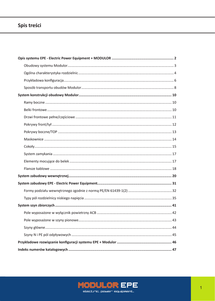Spis treści Opis systemu EPE - Electric Power Equipment + MODULOR............................................................. 2 Obudowy systemu Modulor.............................................................................................................. 3 Ogólna charakterystyka rozdzielnic................................................................................................... 4 Przykładowa konfiguracja.................................................................................................................. 6 Sposób transportu obudów Modulor................................................................................................ 8 System konstrukcji obudowy Modulor........................................................................................... 10 Ramy boczne................................................................................................................................... 10 Belki frontowe................................................................................................................................. 10 Drzwi frontowe pełne/częściowe.................................................................................................... 11 Pokrywy front/tył............................................................................................................................ 12 Pokrywy boczne/TOP...................................................................................................................... 13 Maskownice.................................................................................................................................... 14 Cokoły.............................................................................................................................................. 15 System zamykania........................................................................................................................... 17 Elementy mocujące do belek.......................................................................................................... 17 Flansze kablowe.............................................................................................................................. 18 System zabudowy wewnętrznej..................................................................................................... 20 System zabudowy EPE - Electric Power Equipment........................................................................ 31 Formy podziału wewnętrznego zgodnie z normą PE/EN 61439-1(2).............................................. 32 Typy pól rozdzielnicy niskiego napięcia........................................................................................... 35 System szyn zbiorczych.................................................................................................................. 41 Pole wyposażone w wyłącznik powietrzny ACB.............................................................................. 42 Pole wyposażone w szyny pionowe................................................................................................. 43 Szyny główne................................................................................................................................... 44 Szyny N i PE pól odpływowych........................................................................................................ 45 Przykładowe rozwiązanie konfiguracji systemu EPE + Modulor...................................................... 46 Indeks numerów katalogowych..................................................................................................... 47 1 Opis systemu EPE – Electric Power Equipment + MODULOR Wnętrzowy system rozdzielnic niskonapięciowych rozdziału energii typu EPE (Electric Power Equipment) przewidziany został do zasilania obiektów użyteczności publicznej i zakładów przemysłowych. System jest oparty na skręcanej konstrukcji ramowej w wersji stojącej, co umożliwia w łatwy sposób tworzenie zestawów szeregowych. Dzięki modułowej, skręcanej konstrukcji, system Modulor charakteryzuje się wysoką elastycznością, zarówno komponentów mechanicznych jak i elektrycznych. Aparatura rozdzielcza może być zabudowana bezpośrednio na ramie nośnej, płytach montażowych lub euroszynach. Dostęp do aparatów możliwy jest poprzez drzwi, maskownice lub po zdjęciu osłon. Dzięki modułowej konstrukcji bardzo łatwo można wydzielić przedziały szafy – kablowy, aparatowy, szynowy i obwodów wtórnych. System w całości jest skręcany, co zapewnia elastyczną rozbudowę oraz łatwiejszy transport szaf. Używamy podzespołów czołowych europejskich producentów materiałów elektrotechnicznych. Szafy mogą zostać wyposażone w cokoły, zamontowane na dole szaf – cozwiększa ich funkcjonalność. Podstawową zaletą montażu cokołów jest oszczędność czasu, dzięki szybkiemu montażowi elementów cokołu oraz łatwym transporcie szafy. Ze względu na rozbudowaną ofertę elementów dodatkowych bardzo łatwo dobrać właściwą aplikację rozdzielni. Nasi dostawcy: Nasza firma zaopatruje się wyłącznie u sprawdzonych dostawców. Są nimi znani i cenieni producenci materiałów elektrotechnicznych, dzięki czemu możemy zagwarantować najwyższą jakość naszych wyrobów. 2 Obudowy systemu MODULOR MODULOR – System obudów do niskonapięciowych rozdzielnic i sterownic do rozdziału energii elektrycznej Przykładowe wykonanie. 3 Ogólna charakterystyka rozdzielnic Zalety systemu rozdziału energii: • system umożliwia konfigurowanie szaf w większe zestawy • sztywna konstrukcja • lekka, modułowa konstrukcja • bezpieczna i łatwa obsługa • przejrzystość układu połączeń • łatwość montażu • możliwość wysyłki części mechanicznych w systemie Flat Pack Rozdzielnice spełniają wymagania norm: • PN-EN 61439-1:2011, • PN-EN 61439-2:2011, • PN-EN 62208:20