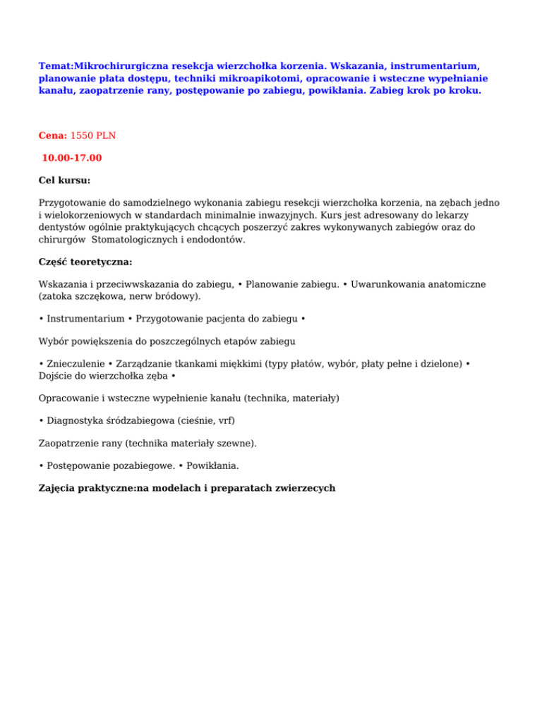 Temat:Mikrochirurgiczna resekcja wierzchołka korzenia. Wskazania, instrumentarium, planowanie płata dostępu, techniki mikroapikotomi, opracowanie i wsteczne wypełnianie kanału, zaopatrzenie rany, postępowanie po zabiegu, powikłania. Zabieg krok po kroku. Cena: 1550 PLN 10.00-17.00 Cel kursu: Przygotowanie do samodzielnego wykonania zabiegu resekcji wierzchołka korzenia, na zębach jedno i wielokorzeniowych w standardach minimalnie inwazyjnych. Kurs jest adresowany do lekarzy dentystów ogólnie praktykujących chcących poszerzyć zakres wykonywanych zabiegów oraz do chirurgów Stomatologicznych i endodontów. Część teoretyczna: Wskazania i przeciwwskazania do zabiegu, • Planowanie zabiegu. • Uwarunkowania anatomiczne (zatoka szczękowa, nerw bródowy). • Instrumentarium • Przygotowanie pacjenta do zabiegu • Wybór powiększenia do poszczególnych etapów zabiegu • Znieczulenie • Zarządzanie tkankami miękkimi (typy płatów, wybór, płaty pełne i dzielone) • Dojście do wierzchołka zęba • Opracowanie i wsteczne wypełnienie kanału (technika, materiały) • Diagnostyka śródzabiegowa (cieśnie, vrf) Zaopatrzenie rany (technika materiały szewne). • Postępowanie pozabiegowe. • Powikłania. Zajęcia praktyczne:na modelach i preparatach zwierzecych
