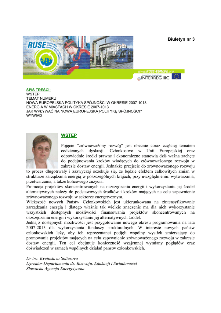 Biuletyn nr 3 SPIS TREŚCI: WSTĘP TEMAT NUMERU NOWA EUROPEJSKA POLITYKA SPÓJNOŚCI W OKRESIE 2007-1013 ENERGIA W MIASTACH W OKRESIE 2007-1013 JAK WPŁYWAĆ NA NOWĄ EUROPEJSKĄ POLITYKĘ SPÓJNOŚCI? WYWIAD WSTĘP Pojęcie ”zrównoważony rozwój” jest obecnie coraz częściej tematem codziennych dyskusji. Członkostwo w Unii Europejskiej oraz odpowiednie środki prawne i ekonomiczne stanowią dziś ważną zachętę do podejmowania kroków wiodących do zrównoważonego rozwoju w zakresie dostaw energii. Jednakże przejście do zrównoważonego rozwoju to proces długotrwały i zazwyczaj oczekuje się, że będzie efektem całkowitych zmian w strukturze zarządzania energią w poszczególnych krajach, przy uwzględnieniu: wytwarzania, przetwarzania, a także końcowego zużycia. Promocja projektów skoncentrowanych na oszczędzaniu energii i wykorzystaniu jej źródeł alternatywnych należy do podstawowych środków i kroków mających na celu zapewnienie zrównoważonego rozwoju w sektorze energetycznym. Większość nowych Państw Członkowskich jest ukierunkowana na zintensyfikowanie zarządzania energią i dlatego właśnie tak wielkie znaczenie ma dla nich wykorzystanie wszystkich dostępnych możliwości finansowania projektów skoncentrowanych na oszczędzaniu energii i wykorzystaniu jej alternatywnych źródeł. Jedną z dostępnych możliwości jest przygotowanie nowego okresu programowania na lata 2007-2013 dla wykorzystania funduszy strukturalnych. W interesie nowych państw członkowskich leży, aby ich reprezentanci podjęli wspólny wysiłek zmierzający do promowania projektów mających na celu zapewnienie zrównoważonego rozwoju w zakresie dostaw energii. Ten cel obejmuje konieczność wzajemnej wymiany poglądów oraz doświadczeń w ramach wspólnych działań państw członkowskich. Dr inż. Kvetoslava Soltesova Dyrektor Departamentu ds. Rozwoju, Edukacji i Świadomości Słowacka Agencja Energetyczna TEMAT NUMERU Nowa europejska polityka spójności w okresie 2007-1013 Aktualny okres programowania dla funduszy strukturalnych zakończy się w grudniu 2006 r. Komisja Europejska, Parlament Europejski, państwa członkowskie oraz regiony przygotowują się obecnie do nowego okresu programowania 2007-2013. Główny dokument dotyczący przyszłej europejskiej polityki regionalnej oraz ram dla nowych projektów dofinansowywanych z funduszy strukturalnych nosi tytuł: „Polityka spójności wspierająca wzrost gospodarczy i zatrudnienie: strategiczne wytyczne wspólnotowe, 2007-1013”. Określa on priorytety i cele polityki. Priorytety definiują, „co chcemy osiągnąć”, a cele określają „kto i jak skorzysta z funduszy, aby mógł to osiągnąć”. 3 priorytety nowej polityki spójności: 1. Podniesienie atrakcyjności Europy i jej regionów pod względem inwestowania i pracy. 2. Udoskonalenie wiedzy i innowacyjności służące wzrostowi. 3. Zwiększenie ilości i poprawa jakości miejsc pracy. Działania wspierane w ramach polityki spójności powinny koncentrować się na promowaniu zrównoważonego rozwoju, konkurencyjności i zatrudnienia, jak to zostało określone/ustalone w Strategii Lizbońskiej*. Cele te powinny być osiągane przy zachowaniu zasad poszanowania środowiska, zapewniających zrównoważony rozwój. Zagadnienia dotyczące zrównoważonej energii są środkiem do osiągnięcia celów polityki spójności, chociaż nie należą ani do celów, ani do priorytetów tej polityki. A zatem niezwykle ważne jest, aby znaleźć sposób, w jaki projekty związane ze zrównoważonym wykorzystaniem energii mogłyby przyczynić się do realizacji tych priorytetów. Na przykład można by podjąć działania w następujących zagadnieniach dotyczących energii: Porada wskazuje, jak zagadnienie może wiązać się ze zrównoważoną energią Podniesienie atrakcyjności Europy i jej regionów pod względem inwestowania i pracy... ► Promowanie inwestycji, które przyczyniają się do realizacji zobowiązań z Kioto. ► Wspieranie projektów w celu poprawy efektywności energetycznej i rozpowszechniania wzorców niskiego zużywania energii. ► Wspieranie rozwoju odnawialnych i alternatywnych technologii, które wzmocniłyby pozycję Europy w stosunku do jej konkurentów. ► Rozszerzanie i udoskonalanie infrastruktury transportu przy jednoczesnym respektowaniu w najwyższym możliwym stopniu zasad zrównoważenia środowiska, promujące środowiskowo zrównoważone sieci transportu. Należą do nich urządzenia transportu publicznego (z infrastrukturami park-and-ride), planowanie ruchu, ruch okrężny zwiększający bezpieczeństwo na skrzyżowaniach, miękki transport (ścieżki rowerowe, chodniki dla pieszych). Tu także zaliczane są działania zapewniające dostęp pewnych grup docelowych (ludzie starsi, niepełnosprawni) do powszechnych usług transportu publicznego oraz zapewniające sieci dystrybucyjne dla paliw alternatywnych. ► Skoncentrowanie inwestowania na tradycyjnych źródłach energii w celu rozwinięcia sieci tam, gdzie istnieją dowody na niepowodzenia na rynku. Inwestycje te głównie dotyczą ‘regionów konwergencji’ (zob. poniżej). Rozwój wiedzy i innowacyjności na rzecz wzrostu gospodarczego... ► Promocja innowacji dzięki nowym, udoskonalonym produktom, procesom i usługom. Porada: Produkty, procesy i usługi, które są bardziej efektywne energetycznie lub wykorzystują alternatywną czystszą energię. ► Inwestowanie w badania i rozwój technologii. Porada: Wsparcie dla instytutów badawczych lub uniwersytetów prowadzących badania dotyczące nowych technologii zwiększających efektywność energetyczną lub wykorzystanie odnawialnych źródeł energii. Zapewnienie większej liczby lepszych miejsc pracy... ► Adaptacja systemów edukacyjnych i szkoleniowych w odpowiedzi na nowe wymagania dotyczące kompetencji, np. szkolenia dla urzędników zajmujących się energią, kursy edukacyjne. Porada: Szkolenia 