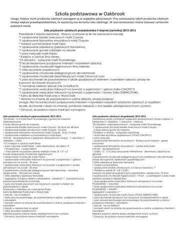 Szkoła podstawowa w Oakbrook Uwaga: Podane marki przyborów szkolnych wymagane są ze względów jakościowych. Przy zastosowaniu takich przyborów szkolnych istnieje większe prawdopodobieństwo, że wystarczą one do końca roku szkolnego. W razie konieczności można stosować zamienniki podanych marek. Lista przyborów szkolnych przedszkolaka II stopnia (zerówka) 2015-2016 Przedszkole II stopnia (zerówka): Wszyscy uczniowie (o ile nie zaznaczono inaczej) *1 opakowanie kredek świecowych marki Crayola *1 opakowanie flamastrów zmywalnych marki Crayola * markery suchościeralne marki Expo *1 opakowanie zakreślaczy (jaskrawych flamastrów) *1 opakowanie gumek-nakładek na ołówek *1 para nożyczek marki Fiskars * 8 klejów w sztyfcie firmy Elmers *12 ołówków - wyłącznie marki Ticonderoga *2 teczki kieszeniowe (podpisane imieniem i nazwiskiem dziecka) *1 opakowanie chusteczek higienicznych firmy Kleenex *1 rolka ręczników papierowych *1 opakowanie chusteczek pielęgnacyjnych dla niemowląt *1 opakowanie chusteczek dezynfekujących marki Clorox lub Lysol *1 para słuchawek do pozostawienia w szkole (podpisanych imieniem i nazwiskiem dziecka; proszę nie kupować słuchawek dousznych) *1 normalnej wielkości plecak (nie na kółkach) *1 opakowanie woreczków foliowych na żywność o pojemności 1 galona (tylko CHŁOPCY) *1 opakowanie woreczków foliowych na żywność o pojemności 1 kwarty (tylko DZIEWCZYNKI) * Karta do Biblioteki Publicznej w Wood Dale * Ubrania na zmianę do pozostawienia w szafce dziecka, proszę podpisać Uwaga: Nie ma konieczności podpisywania imieniem i nazwiskiem wszystkich przyborów szkolnych (z wyjątkiem teczek, słuchawek i ubrań na zmianę), ponieważ większość z nich będzie udostępniana innym uczniom. * Oznacza, że podana nazwa marki jest wymagana Lista przyborów szkolnych ppierwszoklasisty 2015-2016 *24 ołówki - nr 2 marki Dixon Ticonderoga z gumką do mazania, zatemperowane 2 duże różowe gumki do mazania 1 opakowanie kredek świecowych marki Crayola - 24 sztuki lub 48 sztuk 1 opakowanie kredek ołówkowych marki Crayola - 24 sztuk 1 opakowanie flamastrów zmywalnych marki Crayola - 8 lub 10 sztuk 1 opakowanie markerów suchościeralnych marki Expo 3 teczki - dwukieszeniowe z zapięciem skoroszytowym (wąsy) - 1 czerwona, 1 niebieska, 1 żółta *12-14 klejów w sztyfcie marki Elmer 1 para nożyczek marki Fiskars - ostro zakończone, dla dzieci, 5" 1 temperówka - z pojemnikiem 1 mały piórnik na przybory szkolne wielkości maks. 8” x 5” x 2" 2 duże opakowania chusteczek higienicznych 1 opakowanie chusteczek marki Clorox 1 opakowanie woreczków foliowych na żywność o pojemności 1 galona zamykanych na suwak - 20 sztuk 1 opakowanie woreczków foliowych na żywność o pojemności 1 kwarty zamykanych na suwak - 25 sztuk 2 opakowania chusteczek pielęgnacyjnych dla niemowląt - normalne opakowanie - 150 sztuk lub więcej 1 żółty zakreślacz (jaskrawy flamaster) 1 segregator 3-ringowy (kółka z zatrzaskiem) - szerokość 1”, panoramiczny (z przezroczystą kieszenią na froncie) 1 para słuchawek dousznych lub nausznych z prostym wtykiem do pozostawienia w szkole Ściereczka z mikrofibry do czyszczenia iPada Karta do Biblioteki Publicznej w Wood Dale 1 plecak - nie na kółkach 1 para obuwia sportowego, do pozostawienia w szafce - podpisana imieniem i nazwiskiem 1 komplet ubrań na zmianę do pozostawienia w szafce, podpisany imieniem i nazwiskiem 2 zeszyty w szeroką linię na spirali 1 rolka ręczników papierowych Niektóre przybory szkolne będą udostępniane innym uczniom * Oznacza, że podana nazwa marki jest wymagana Lista przyborów szkolnych drugoklasisty 2015-2016 3 plastikowe teczki z potrójnym zapięciem skoroszytowym (3 pary wąsów) i z kieszeniami (1 niebieska, 1 czerwona, 1 zielona) *36 ołówków, zatemperowanych - wyłącznie marki Ticonderoga *1 opakowanie (24 sztuki) kredek świecowych marki Crayola 2 duże różowe gumki do mazania *18 klejów w sztyfcie - wyłącznie marki Elmer 1 duża rolka ręczników papierowych (TYLKO CHŁOPCY) 1 para nożyczek 1 opakowanie flamastrów zmywalnych - 8 klasycznych kolorów - gruba końcówka 1 opakowanie flamastrów zmywalnych - cienka końcówka 4 teczki - dwukieszeniowe 1 Linijka, 12", 1/16 oraz oznaczenie milimetrowe - drewniana, odporna na zginanie 2 opakowania chusteczek pielęgnacyjnych lub nawilżanych dla niemowląt proszę nie kupować opakowań uzupełniających 2 żółte zakreślacze (jaskrawe flamastry) 1 marker suchościeralny 1 opakowanie kredek ołówkowych (12 różnych kolorów), 7" 1 Plastikowy piórnik (5” x 8" x 2,25") 3 zeszyty na spirali do pojedynczych przedmiotów, szeroka linia, 70 stron 2 opakowania chusteczek higienicznych, 175 szt. - w późniejszym czasie może zaistnieć potrzeba większej ilości 1 duże opakowanie woreczków foliowych zamykanych na suwak POJEMNOŚĆ 1 GALONA 1 duże opakowanie woreczków foliowych zamykanych na suwak POJEMNOŚĆ 1 KWARTY Segregator o szerokości 1” 1 opakowanie chusteczek marki Clorox (TYLKO DZIEWCZYNKI) 1 para słuchawek dousznych lub nausznych do pozostawienia w szkole 1 para obuwia sportowego (sznurowanego) do pozostawienia w szafce i podpisana imieniem i nazwiskiem 1 plecak - nie na kółkach 1 komplet ubrań na zmianę do pozostawienia w szafce, podpisany imieniem i nazwiskiem Niektóre przybory szkolne będą udostępniane innym uczniom * Oznacza, że podana nazwa marki jest wymagana