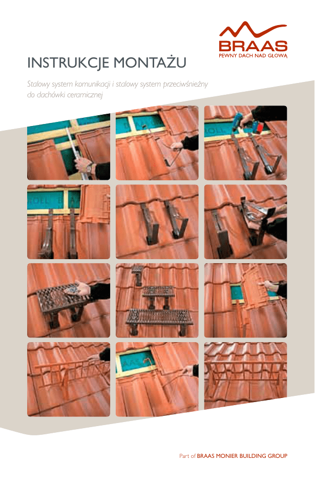 INSTRUKCJE MONTAŻU Stalowy system komunikacji i stalowy system przeciwśnieżny do dachówki ceramicznej Part of Braas Monier Building Group 1 STALOWY SYSTEM KOMUNIKACJI 2 Part of Braas Monier Building Group 3 System elementów s¸u˚Ñcych do chodzenia po dachu Braas, zapewnia bezpiecznÑ komunikacj¢ dla osób pracujÑcych na dachu. W sk∏ad systemu komunikacji wchodzà: Stalowy wspornik do dachówek, stalowy stopieƒ kominiarski, stalowe ∏awy kominiarskie ró˝nej d∏ugoÊci, stalowy ∏uk wspierajàcy i stalowy ∏àcznik ∏aw kominiarskich. Elementy systemu komunikacji dachowej wykonane sà ze stali ocynkowanej ogniowo i lakierowanej proszkowo, a powierzchnie u˝ytkowe stopni i ∏aw kominiarskich majà antypoÊlizgowà powierzchni´. Zapotrzebowanie i wymiary •Stalowy stopieƒ kominiarski (133x250mm) - jeden wspornik. •Stalowa ∏awa kominiarska 400 (400x250mm) - dwa ∏uki wspierajàce + dwa wsporniki. •Stalowa ∏awa kominiarska 800 (800x250mm) - dwa ∏uki wspierajàce + dwa wsporniki. •Stalowa ∏awa kominiarska 1000 (1000x250mm) - trzy ∏uki wspierajàce + trzy wsporniki. •Stalowa ∏awa kominiarska 2000 (2000x250mm) - cztery ∏uki wspierajàce + cztery wsporniki. •Na zamówienie dost´pne sà elementy d∏u˝sze ni˝ 2 m nazywane pomostami. 4 Rozmieszczenie elementów komunikacji na dachu: •System komunikacji mo˝na instalowaç na dachu w trakcie jego uk∏adania jak i na istniejàcym pokryciu. •Przy nachyleniu dachu ≤45o elementy komunikacji dachowej mo˝na rozmieÊciç w co drugim rz´dzie dachówek. •Przy nachyleniu dachu >45o elementy komunikacji dachowej nale˝y rozmieÊciç w ka˝dym rz´dzie dachówek. Monta˝: •Do montowania stopnia kominiarskiego wykorzystuje si´ pojedynczy wspornik. •Przy montowaniu stalowej ∏awy kominiarskiej 400 dachówki, na których zamocowane sà wsporniki znajdujà si´ obok siebie. •Przy montowaniu stalowej ∏awy kominiarskiej 800 mi´dzy dachówkami, na których zamocowane sà wsporniki nale˝y umieÊciç jednà dachówk´ podstawowà. •Przy mocowaniu d∏u˝szych ∏aw i pomostów w ciàgi komunikacyjne wykorzystuje si´ stalowe ∏àczniki ∏aw kominiarskich. Pami´taç nale˝y o zachowaniu maksymalnej odleg∏oÊci mi´dzy wspornikami nie przekraczajàcej 70 cm. Dotyczy to zarówno ca∏ych sk∏adanych ciàgów komunikacyjnych jak równie˝ pojedynczych pomostów. Stalowa ∏awa kominiarska d∏. 400mm, 800mm, 1000mm, 2000mm, (inne d∏ugoÊci dost´pne na specjalne zamówienie) Stalowy stopieƒ kominiarski Stalowy ∏uk wspierajàcy Stalowy ∏àcznik ∏aw i pomostów Stalowy wspornik ∏aw ze stopà gumowà EPDM 5 6 •Wyjąć dachówki powyżej rzędu, gdzie będzie mocowana ława kominiarska, lub stopień kominiarski. •W rozstawie 10 cm przykręcić łatę wspierającą. Wymiar ten warto sprawdzić przykładając wspornik i ewentualnie skorygować go dla innych modeli dachówek. •Dla niektórych dachówek (np. Turmalin) może wystąpić konieczność podłożenia pod łatę wspierającą klocków dystansowych w celu jej uniesienia. •Wsporniki zahaczyć za łatę wspierającą i ułożyć na dachówkach. •Wsporniki przykręcić do łaty wspierającej. Każdy wspornik przykręcić dwoma ocynkowanymi wkrętami. •W dachówkach, na których mają być zamocowane wsporniki wyciąć zamki poziome tak, aby wsporniki znalazły się na środku wypłaszczonych części profili dachówek. •Na wsporniki nałożyć gumowe stopy. •W dachówkach, które mają leżeć nad wspornikami wyciąć dolne zamki tak, aby po ułożeniu dachówki na miejscu pozostawić na szerokości wspornika kilkumilimetrowy luz. 7 8 •Ułożyć nad wspornikami dachówki z wyciętymi zamkami i uzupełnić pozostałe dachówki. •Łuk przykręcić do wspornika dwoma śrubami. •Na wsporniku ułożyć łuk i wypoziomować go. •W analogiczny sposób zamocować drugi łuk. 9 •Na łuki nałożyć ławę kominiarską. •Ławę przykręcić do łuków czterema śrubami. •Śruby dołączone są do łuku wspierającego ławy kominiarskiej. •W analogiczny sposób montować wsporniki, łuki, ławy krótkie, ławy długie i pomosty. Pamiętać należy o maksymalnej odległości wsporników nie przekraczającej 70 cm. STALOWY SYSTEM PRZECIWŚNIEŻNY •Stopień kominiarski jest zintegrowany z łukiem i należy montować go bezpośrednio do wspornika poziomując go i przykręcając dwoma śrubami. 10 Part of Braas Monier Building Group 11 System zapór przeciwÂnie˚nych sk¸ada si¢ z elementów s∏u˚Ñcych zapobieganiu osuwaniu si¢ Âniegu z po¸aci dachu. W sk∏ad stalowego systemu przeciwÊnie˝nego Braas wchodzà: stalowy uchwyt p∏otka przeciwÊnie˝nego, stalowy p∏otek przeciwÊnie˝ny, stalowa klamry do ∏àczenia p∏otków. Elementy wykonane sà ze stali ocynkowanej ogniowo i lakierowane proszkowo. Wymiary zapory i zapotrzebowanie elementów: •Stalowy p∏otek przeciwÊnie˝ny 3000x200mm i 2000x200mm •Stalowa klamra do ∏àczenia p∏otków przeciwsnie˝nych – 2 sztuki na ka˝de po∏àczenie p∏otków. •Stalowy uchwyt do p∏otka przeciwÊnie˝nego – montowany nie rzadziej jak co oko∏o 70 cm, a od koƒca p∏otka nie dalej jak 20 cm. 12 Rozmieszczenie stalowego systemu przeciwÊnie˝nego na dachu: • Stalowy system przeciwÊnie˝ny mo˝na instalowaç na dachu w trakcie jego uk∏adania jak i na istniejàcym pokryciu. •Zapory (p∏otki) nale˝y montowaç w takich miejscach na dachu, aby zgromadzony za nimi Ênieg obcià˝a∏ podpor´ krokwi, mur∏at´, lub p∏atew. •Pami´taç nale˝y, ˝e system przeciwÊnie˝ny potrafi gromadziç na dachu znaczne iloÊci Êniegu, co wymaga indywidualnego projektowania i uwzgl´dnienia tego faktu w obliczeniach konstrukcyjnych wi´êby dachowej. Stalowy p∏otek przeciwÊnie˝ny (2000x200mm i 3000x200mm) Stalowa klamra do ∏àczenia p∏otków przeciwsnie˝nych Stalowy uchwyt do p∏otka przeciwÊnie˝nego 13 14 •Wyjąć dachówki powyżej rzęd