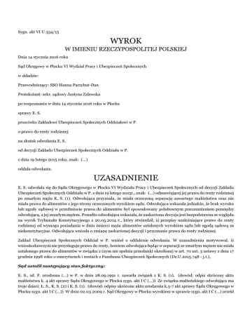 Sygn. akt VI U 334/15 WYROK W IMIENIU RZECZYPOSPOLITEJ POLSKIEJ Dnia 14 stycznia 2016 roku Sąd Okręgowy w Płocku VI Wydział Pracy i Ubezpieczeń Społecznych w składzie: Przewodniczący: SSO Hanna Parzybut-Dan Protokolant: sekr. sądowy Justyna Zalewska po rozpoznaniu w dniu 14 stycznia 2016 roku w Płocku sprawy E. S. przeciwko Zakładowi Ubezpieczeń Społecznych Oddziałowi w P. o prawo do renty rodzinnej na skutek odwołania E. S. od decyzji Zakładu Ubezpieczeń Społecznych Oddziału w P. z dnia 19 lutego 2015 roku, znak: (...) oddala odwołanie. UZASADNIENIE E. S. odwołała się do Sądu Okręgowego w Płocku VI Wydziału Pracy i Ubezpieczeń Społecznych od decyzji Zakładu Ubezpieczeń Społecznych Oddziału w P. z dnia 19 lutego 2015r., znak: (...) odmawiającej jej prawa do renty rodzinnej po zmarłym mężu K. S. (1). Odwołująca przyznała, że miała orzeczoną separację zawartego małżeństwa oraz nie miała prawa do alimentów z jego strony orzeczonych wyrokiem sądu. Odwołująca wskazała jednakże, że brak wyroku lub ugody sądowej w przedmiocie prawa do alimentów był spowodowany polubownym porozumieniem pomiędzy odwołującą, a jej zmarłym mężem. Ponadto odwołująca wskazała, że zaskarżona decyzja jest bezpodstawna ze względu na wyrok Trybunału Konstytucyjnego z 20.05.2014 r., który stwierdził, iż przepisy uzależniające prawo do renty rodzinnej od wymogu posiadania w dniu śmierci męża alimentów ustalonych wyrokiem sądu lub ugodą sądową za niekonstytucyjne. Odwołująca wniosła o zmianę zaskarżonej decyzji i przyznanie prawa do renty rodzinnej. Zakład Ubezpieczeń Społecznych Oddział w P. wniósł o oddalenie odwołania. W uzasadnieniu motywował, iż wnioskodawczyni nie przysługuje prawo do renty, bowiem odwołująca będąc w separacji ze zmarłym mężem nie miała ustalonego prawa do alimentów w związku z czym nie spełnia przesłanki określonej w art. 70 ust. 3 ustawy z dnia 17 grudnia 1998 roku o emeryturach i rentach z Funduszu Ubezpieczeń Społecznych (Dz.U.2015.748 - j.t.), Sąd ustalił następujący stan faktyczny: E. S., zd. P. urodzona (...) w P. w dniu 28.09.1991 r. zawarła związek z K. S. (1). (dowód: odpis skrócony aktu małżeństwa k. 4 akt sprawy Sądu Okręgowego w Płocku sygn. akt I C (...)) Ze związku małżeńskiego odwołująca ma troje dzieci: Ł. S., K. S. (2) i K. S. (1). (dowód: odpisy skrócone aktu urodzenia k.5-7 akt sprawy Sądu Okręgowego w Płocku sygn. akt I C (...)) W dniu 02.03.2009 r. Sąd Okręgowy w Płocku wyrokiem w sprawie sygn. akt I C (...) orzekł separację małżeństwa zawartego w dniu 28.09.1991 r. w miejscowości J. pomiędzy K. S. (1), ur. (...) w P., s. J. i M., a E. P., ur. (...) w M., c. A. i G. I.. (dowód: wyrok k. 43 akt sprawy Sądu Okręgowego w Płocku sygn. akt I C (...)) Mąż odwołującej zmarł w dniu 17.08.2010 r. (dowód: odpis skrócony aktu zgonu k. 17 akt o rentę rodzinną J. S.) Ubezpieczona nie miała prawa do alimentów ze strony małżonka ustalonych wyrokiem lub ugodą sądową. Zmarły mąż nie przekazywał również ubezpieczonej dobrowolnie żadnych kwot tytułem alimentów, ani też innych kwot od orzeczenia separacji do dnia jego śmierci. Odwołująca przed orzeczeniem separacji małżeństwa wyprowadziła się razem z dziećmi do swojego ojca do miejscowości N.. Od tej pory małżonkowie zamieszkiwali osobno, nie utrzymywali ze sobą kontaktu. E. S. odwiedzała jedynie małżonka w weekendy w celu umożliwienia mu kontaktów z dziećmi, które chciały spotykać się z ojcem. Po separacji odwołująca nie mieszkała z mężem, ponieważ był agresywny i nadużywał alkoholu. (dowód: zeznania odwołującej k. 20 i 12-13 akt sprawy) W dniu 16.01.2015 r. odwołująca złożyła w ogranie rentowym wniosek o rentę rodzinną. (dowód: wniosek k. 1-8 akt organu rentowego) Decyzją z dnia 19.02.2015 r. znak: (...) Zakład Ubezpieczeń Społecznych Oddział w P. odmówił odwołującej prawa do renty rodzinnej po zmarłym w dniu 17.08.2010 r. K. S. (1). (dowód: decyzja k. 19 akt organu rentowego) Powyższy stan faktyczny Sąd ustalił na podstawie w/w dokumentów znajdujących się w aktach sprawy, w tym w aktach organu rentowego oraz aktach sprawy Sądu Okręgowego w Płocku sygn. akt I C (...). Ponadto podstawę ustaleń stanowiły zeznania odwołującej. Sąd dał wiarę zeznaniom odwołującej, bowiem brak jest podstaw do ich kwestionowania. Zeznania te Sąd uznał za logicznie przedstawiające rzeczywisty stan rzeczy. Faktem naturalnym jest, że odwołująca wyprowadziła się od męża, po orzeczonej separacji, bowiem chciała uniknąć negatywnego wpływu zachowań męża na nią samą, jak również na trójkę dzieci. W ocenie Sądu wiarygodne są wszystkie pozostałe załączone do akt sprawy dokumenty, ponieważ nie ma żadnych przesłanek do ich kwestionowania, tak od strony formalnej, jak i merytorycznej. Sąd zważył, co następuje: W świetle art. 70 ust. 1 i 2 ustawy z dnia 17.12.1998 r. o emeryturach i rentach z Funduszu Ubezpieczeń Społecznych ( Dz.U. z 2015 r. poz.748) zwanej dalej ustawą emerytalną wdowa ma prawo do renty rodzinnej, jeżeli: w chwili śmierci męża osiągnęła wiek 50 lat lub była niezdolna do pracy albo wychowuje co najmniej jedno z dzieci, wnuków lub rodzeństwa uprawnione do renty rodzinnej po zmarłym mężu, które nie osiągnęło 16 lat, a jeżeli kształci się w szkole - 18 lat życia, lub jeżeli sprawuje pieczę nad dzieckiem całkowicie niezdolnym do pracy oraz do samodzielnej egzystencji lub całkowicie niezdolnym do pracy, uprawnionym do renty rodzinnej. Prawo do renty rodzinnej nabywa również wdowa, która osiągnęła wiek 50 lat lub stała się niezdolna do pracy po śmierci męża, nie później jednak niż w ciągu 5 lat od jego śmierci lub od zaprzestania wychowywania osób wymienionych w ust. 1 pkt 2. Małżonka rozwiedziona lub wdowa, która do dnia śmierci męża n