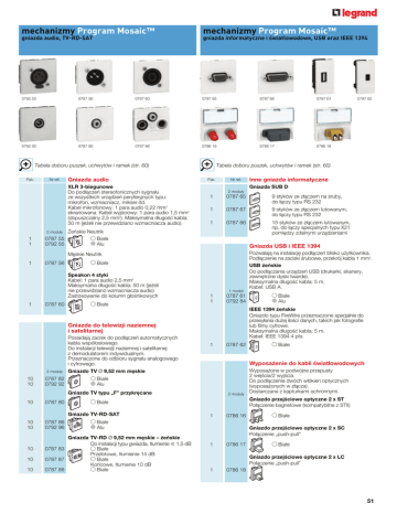mechanizmy Program Mosaic™ mechanizmy Program Mosaic™ gniazda audio, TV-RD-SAT gniazda informatyczne i światłowodowe, USB oraz IEEE 1394 0792 55 0787 56 0787 60 0787 65 0787 66 0787 61 0792 92 0787 80 0787 86 0786 16 0786 17 0786 18 Tabela doboru puszek, uchwytów i ramek (str. 60) Pak. Nr ref. Gniazda audio XLR 3-biegunowe Do podłączeń stereofonicznych sygnału ze wszystkich urządzeń peryferyjnych typu: mikrofon, wzmacniacz, mikser itd. Kabel mikrofonowy: 1 para audio 0,22 mm2 ekranowana. Kabel wyjściowy: 1 para audio 1,5 mm2 (dopuszczalny 2,5 mm2). Maksymalna długość kabla: 50 m (jeżeli nie przewidziano wzmacniacza audio). 2 moduły 1 1 0787 55 0792 55 Tabela doboru puszek, uchwytów i ramek (str. 60) Pak. Nr ref. 2 moduły 0787 56 0787 65 9 styków ze złączem na śruby, do łączy typu RS 232 1 0787 67 9 styków ze złączem lutowanym, do łączy typu RS 232 1 0787 66 15 styków ze złączem lutowanym, np. do łączy specjalnych typu X21 pomiędzy zdalnymi urządzeniami Żeńskie Neutrik Białe Alu Gniazda USB i IEEE 1394 Białe Speakon 4 styki Kabel: 1 para audio 2,5 mm2 Maksymalna długość kabla: 50 m (jeżeli nie przewidziano wzmacniacza audio) Zastosowanie do kolumn głośnikowych 1 0787 60 Białe 1 1 1 moduł 0787 61 0792 84 2 moduły 10 10 0787 82 0792 92 1 0787 80 10 10 0787 86 0792 96 10 10 10 0787 62 Białe Alu 2 moduły Białe Gniazdo TV-RD-SAT 1 0786 16 Białe Alu Gniazda TV-RD Ø 9,52 mm męskie – żeńskie Do instalacji typu gwiazda, tłumienie ≤ 1,5 dB Białe 0787 83 Przelotowe, tłumienie 14 dB 0787 87 Białe Końcowe, tłumienie 10 dB 0787 88 Białe Białe Alu Białe Wyposażenie do kabli światłowodowych Gniazdo TV typu „F” przykręcane 10 Pozwalają na instalację podłączeń blisko użytkownika. Podłączenie na zaciski śrubowe, przekrój kabla 1 mm2. USB żeńskie Do podłączania urządzeń USB (drukarki, skanery, zewnętrzne dyski twarde). Maksymalna długość kabla: 5 m. Kabel: USB A. IEEE 1394 żeńskie Gniazdo typu FireWire przeznaczone specjalnie do przesyłania dużej ilości danych, takich jak fotografie lub filmy cyfrowe. Maksymalna długość kabla: 5 m. Kabel: IEEE 1394 4 pts. Gniazda do telewizji naziemnej i satelitarnej Posiadają zacisk do podłączeń automatycznych kabla współosiowego. Do instalacji telewizji naziemnej i satelitarnej z demodulatorem indywidualnym. Przeznaczone do odbioru sygnału analogowego i cyfrowego. Gniazdo TV Ø 9,52 mm męskie Inne gniazda informatyczne Gniazda SUB D 1 Męskie Neutrik 1 0787 62 Wyposażone w podwójne przepusty 2 wejścia/2 wyjścia. Do podłączenia dwóch włókien optycznych (wyposażonych w złącza). Dostarczane z kapturkami ochronnymi. Gniazdo przejściowe optyczne 2 x ST Połączenie bagnetowe (kompatybilne z STII) Białe Gniazdo przejściowe optyczne 2 x SC Połączenie „push-pull” 1 0786 17 Białe Gniazdo przejściowe optyczne 2 x LC Połączenie „push-pull” 1 0786 18 51