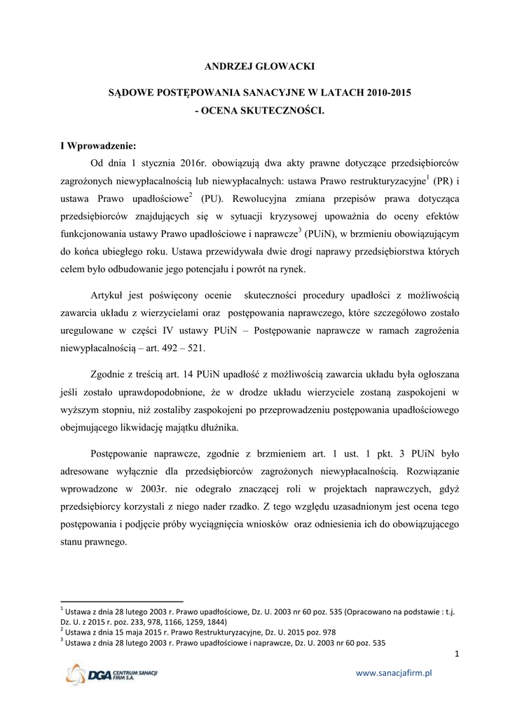ANDRZEJ GŁOWACKI SĄDOWE POSTĘPOWANIA SANACYJNE W LATACH 2010-2015 - OCENA SKUTECZNOŚCI. I Wprowadzenie: Od dnia 1 stycznia 2016r. obowiązują dwa akty prawne dotyczące przedsiębiorców zagrożonych niewypłacalnością lub niewypłacalnych: ustawa Prawo restrukturyzacyjne1 (PR) i ustawa Prawo upadłościowe2 (PU). Rewolucyjna zmiana przepisów prawa dotycząca przedsiębiorców znajdujących się w sytuacji kryzysowej upoważnia do oceny efektów funkcjonowania ustawy Prawo upadłościowe i naprawcze3 (PUiN), w brzmieniu obowiązującym do końca ubiegłego roku. Ustawa przewidywała dwie drogi naprawy przedsiębiorstwa których celem było odbudowanie jego potencjału i powrót na rynek. Artykuł jest poświęcony ocenie skuteczności procedury upadłości z możliwością zawarcia układu z wierzycielami oraz postępowania naprawczego, które szczegółowo zostało uregulowane w części IV ustawy PUiN – Postępowanie naprawcze w ramach zagrożenia niewypłacalnością – art. 492 – 521. Zgodnie z treścią art. 14 PUiN upadłość z możliwością zawarcia układu była ogłoszana jeśli zostało uprawdopodobnione, że w drodze układu wierzyciele zostaną zaspokojeni w wyższym stopniu, niż zostaliby zaspokojeni po przeprowadzeniu postępowania upadłościowego obejmującego likwidację majątku dłużnika. Postępowanie naprawcze, zgodnie z brzmieniem art. 1 ust. 1 pkt. 3 PUiN było adresowane wyłącznie dla przedsiębiorców zagrożonych niewypłacalnością. Rozwiązanie wprowadzone w 2003r. nie odegrało znaczącej roli w projektach naprawczych, gdyż przedsiębiorcy korzystali z niego nader rzadko. Z tego względu uzasadnionym jest ocena tego postępowania i podjęcie próby wyciągnięcia wniosków oraz odniesienia ich do obowiązującego stanu prawnego. 1 Ustawa z dnia 28 lutego 2003 r. Prawo upadłościowe, Dz. U. 2003 nr 60 poz. 535 (Opracowano na podstawie : t.j. Dz. U. z 2015 r. poz. 233, 978, 1166, 1259, 1844) 2 Ustawa z dnia 15 maja 2015 r. Prawo Restrukturyzacyjne, Dz. U. 2015 poz. 978 3 Ustawa z dnia 28 lutego 2003 r. Prawo upadłościowe i naprawcze, Dz. U. 2003 nr 60 poz. 535 1 www.sanacjafirm.pl II. Koncepcja upadłości z możliwością zawarcia układu. Niewypłacalny dłużnik składał, zgodnie z poprzednio obowiązującym porządkiem prawnym wniosek o ogłoszenie upadłości (art.20 i kolejne PUiN), a dodatkowo w przypadku wnoszenia o ogłoszenie upadłości z możliwością zawarcia układu dołączał propozycje układowe wraz z propozycjami finansowania układu. Ten ostatni dokument miał za zadanie przekonać sąd, że po ogłoszeniu upadłości z możliwością zawarcia układu, dłużnik będzie generował dodatnie przepływy pieniężne, a po restrukturyzacji zobowiązań i zawarciu układu z wierzycielami będzie w stanie go wykonać. Propozycje układowe mogły wskazywać jeden lub więcej sposobów restrukturyzacji zobowiązań, w szczególności (art.270 ust. 1 PUiN): 1. Odroczenie wykonania zobowiązań 2. Rozłożenie spłaty długów raty 3. Zmniejszenie sumy długów 4. Konwersję wierzytelności na udziały lub akcje 5. Zmianę, zamianę lub uchylenie prawa zabezpieczającego określoną wierzytelność. Postępowanie upadłościowe z możliwością zawarcia układu po jego ogłoszeniu składało się m.in. z takich działań, jak: Zgłaszanie wierzytelności przez wierzycieli, Zatwierdzanie listy wierzytelności przez sędziego – komisarza, Głosowanie nad układem na zgromadzeniu wierzycieli, przyjęcie układu, Zatwierdzenie układu przez sąd Realizacja układu, spłata zobowiązań. Założeniem prawodawcy było sprawne przeprowadzenie postępowania. Układ z wierzycielami miał na celu okresową ochronę dłużnika i umożliwienie wdrożenia działań restrukturyzacyjnych. III Koncepcja postępowania naprawczego w ustawie PUiN. 2 www.sanacjafirm.pl Art. 492 ust. 1 i 2 PUiN stanowił, że przepisy o postępowaniu naprawczym stosuje się do przedsiębiorców zagrożonych niewypłacalnością. Ten stan ma miejsce, gdy przedsiębiorca pomimo wykonywania swoich zobowiązań, według rozsądnej oceny jego sytuacji ekonomicznej jest oczywistym, że w niedługim czasie stanie się niewypłacalny. Z brzmienia tego przepisu można wnosić, że ustawodawca przyjął, że przedsiębiorca dysponując wiedzą o nieuchronności pewnych zdarzeń podejmie działania ukierunkowane na zneutralizowanie ich skutków poprzez zawarcie układu z wierzycielami, a następnie wdrożenie planu naprawczego. Art. 494 ustawy PUiN wskazywał, że przedsiębiorca zagrożony niewypłacalnością może złożyć w sądzie oświadczenie o wszczęciu postępowania naprawczego przy zachowaniu ustawowych wymogów i składając wymagany zestaw dokumentów i oświadczeń. Kluczowymi dokumentami dołączanymi do oświadczenia o wszczęciu postępowania naprawczego były plan naprawczy oraz dokumenty świadczące o sytuacji finansowej wskazane w art. 23 ust.1 ustawy PUiN. Zgodnie z artykułem 494 ust. 3, sąd mógł w ciągu 14 dni od złożenia oświadczenia zakazać wszczęcia postępowania naprawczego. Brak zakazu sądu o wszczęciu postępowania naprawczego upoważniał przedsiębiorcę do umieszczenia w Monitorze Sądowym i Gospodarczym obwieszczenia o złożonym oświadczeniu, a dzień ogłoszenia stawał się dniem wszczęcia postępowania naprawczego. Odstępując od szczegółowej analizy przebiegu postępowania naprawczego, uzasadnionym jest zwrócenie uwagi na jego najważniejsze etapy /zgodnie z art. 497-540 PUiN/: 1. Ustanowienie przez sąd nadzorcy sądowego i zawarcie umowy zlecenia pomiędzy nim a przedsiębiorcą, 2. Zawieszenie wykonywania zobowiązań przedsiębiorcy, 3. Prezentacja wierzycielom planu naprawczego i propozycji układowych i zwołanie zgromadzenia wierzycieli, 4. Głosowanie propozycji układowych, przejęcie układu przez wierzycieli 5. Zatwierdzenie układu przez sąd, 6. Realizacja planu naprawczego i wykonanie przez przedsiębio