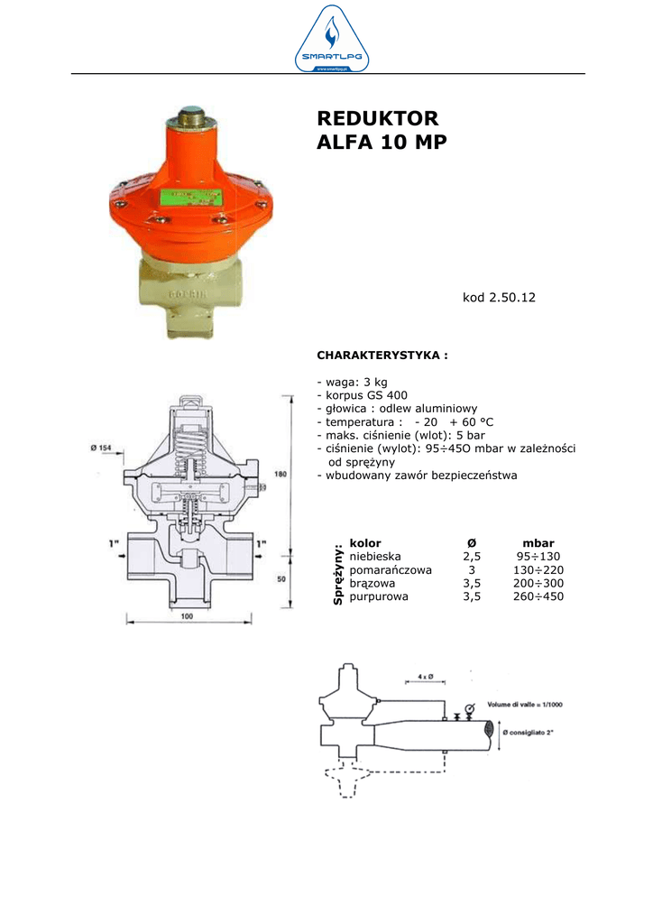 100 Płońsk, ul. Wyszog dzka 61 tel.+48 692 198 426 tel.+ uro REDUKTOR ALFA 10 MP kod 2.50.12 CHARAKTERYSTYKA : waga: 3 kg korpus GS 400 głowica : odlew aluminiowy temperatura : - 20 + 60 °C maks. ciśnienie (wlot): 5 bar ciśnienie (wylot): 95÷45O mbar w zależności od sprężyny - wbudowany zawór bezpieczeństwa Sprężyny: - kolor niebieska pomarańczowa brązowa purpurowa Ø 2,5 3 3,5 3,5 mbar 95÷130 130÷220 200÷300 260÷450