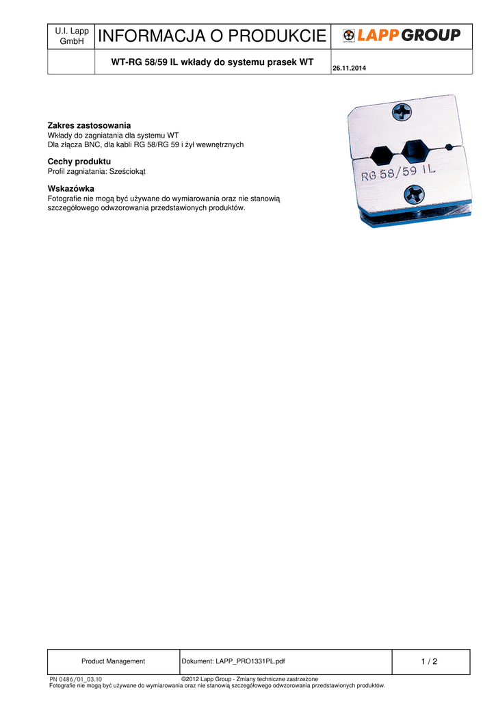 U.I. Lapp GmbH INFORMACJA O PRODUKCIE WT-RG 58/59 IL wkłady do systemu prasek WT 26.11.2014 Zakres zastosowania Wkłady do zagniatania dla systemu WT Dla złącza BNC, dla kabli RG 58/RG 59 i żył wewnętrznych Cechy produktu Profil zagniatania: Sześciokąt Wskazówka Fotografie nie mogą być używane do wymiarowania oraz nie stanowią szczegółowego odwzorowania przedstawionych produktów. Product Management Dokument: LAPP_PRO1331PL.pdf ©2012 Lapp Group - Zmiany techniczne zastrzeżone PN 0486/01_03.10 Fotografie nie mogą być używane do wymiarowania oraz nie stanowią szczegółowego odwzorowania przedstawionych produktów. 1/2 Powered by TCPDF (www.tcpdf.org) Odpowiedni do: Profil zagniatania Liczba sztuk w opakowaniu 61752950 WT-RG 58/59 IL wtyk BNC sześciokąt 1 INFORMACJA O PRODUKCIE Dokument: LAPP_PRO1331PL.pdf WT-RG 58/59 IL wkłady do systemu prasek WT Product Management U.I. Lapp GmbH Oznaczenie wyrobu 26.11.2014 ©2012 Lapp Group - Zmiany techniczne zastrzeżone PN 0486/01_03.10 Fotografie nie mogą być używane do wymiarowania oraz nie stanowią szczegółowego odwzorowania przedstawionych produktów. 2/2 Powered by TCPDF (www.tcpdf.org) Numer artykułu
