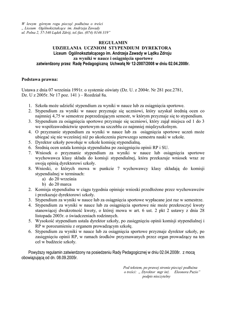 W lewym górnym rogu pieczęć podłużna o treści „ Liceum Ogólnokształcące im. Andrzeja Zawady ul. Polna 2, 57-540 Lądek Zdrój, tel./fax. (074) 8146 319” REGULAMIN UDZIELANIA UCZNIOM STYPENDIUM DYREKTORA Liceum Ogólnokształcącego im. Andrzeja Zawady w Lądku Zdroju za wyniki w nauce i osiągnięcia sportowe zatwierdzony przez Radę Pedagogiczną Uchwałą Nr 12-2007/2008 w dniu 02.04.2008r. Podstawa prawna: Ustawa z dnia 07 września 1991r. o systemie oświaty (Dz. U. z 2004r. Nr 281 poz.2781, Dz. U z 2005r. Nr 17 poz. 141 ) – Rozdział 8a. 1. Szkoła może udzielić stypendium za wyniki w nauce lub za osiągnięcia sportowe. 2. Stypendium za wyniki w nauce przyznaje się uczniowi, który uzyskał średnią ocen co najmniej 4,75 w semestrze poprzedzającym semestr, w którym przyznaje się to stypendium. 3. Stypendium za osiągnięcia sportowe przyznaje się uczniowi, który zajął miejsca od 1 do 3 we współzawodnictwie sportowym na szczeblu co najmniej międzyszkolnym. 4. O przyznanie stypendium za wyniki w nauce lub za osiągnięcia sportowe uczeń może ubiegać się nie wcześniej niż po ukończeniu pierwszego semestru nauki w szkole. 5. Dyrektor szkoły powołuje w szkole komisję stypendialną. 6. Średnią ocen ustala komisja stypendialna po zasięgnięciu opinii RP i SU. 7. Wniosek o przyznanie stypendium za wyniki w nauce lub osiągnięcia sportowe wychowawca klasy składa do komisji stypendialnej, która przekazuje wniosek wraz ze swoją opinią dyrektorowi szkoły. 8. Wnioski, o których mowa w punkcie 7 wychowawcy klasy składają do komisji stypendialnej w terminach: a) do 20 września b) do 20 marca 2. Komisja stypendialna w ciągu tygodnia opiniuje wnioski przedłożone przez wychowawców i przekazuje dyrektorowi szkoły. 3. Stypendium za wyniki w nauce lub za osiągnięcia sportowe wypłacane jest raz w semestrze. 4. Stypendium za wyniki w nauce lub za osiągnięcia sportowe nie może przekroczyć kwoty stanowiącej dwukrotność kwoty, o której mowa w art. 6 ust. 2 pkt 2 ustawy z dnia 28 listopada 2003r. o świadczeniach rodzinnych. 5. Wysokość stypendium ustala dyrektor szkoły, po zasięgnięciu opinii komisji stypendialnej i RP w porozumieniu z organem prowadzącym szkołę. 6. Stypendium za wyniki w nauce lub za osiągnięcia sportowe przyznaje dyrektor szkoły, po zasięgnięciu opinii RP, w ramach środków przyznawanych przez organ prowadzący na ten cel w budżecie szkoły. Powyższy regulamin zatwierdzony na posiedzeniu Rady Pedagogicznej w dniu 02.04.2008r. z mocą obowiązującą od dn. 08.09.2005r. Pod tekstem, po prawej stronie pieczęć podłużna o treści: „ Dyrektor mgr inż. Eleonora Puzio” podpis nieczytelny