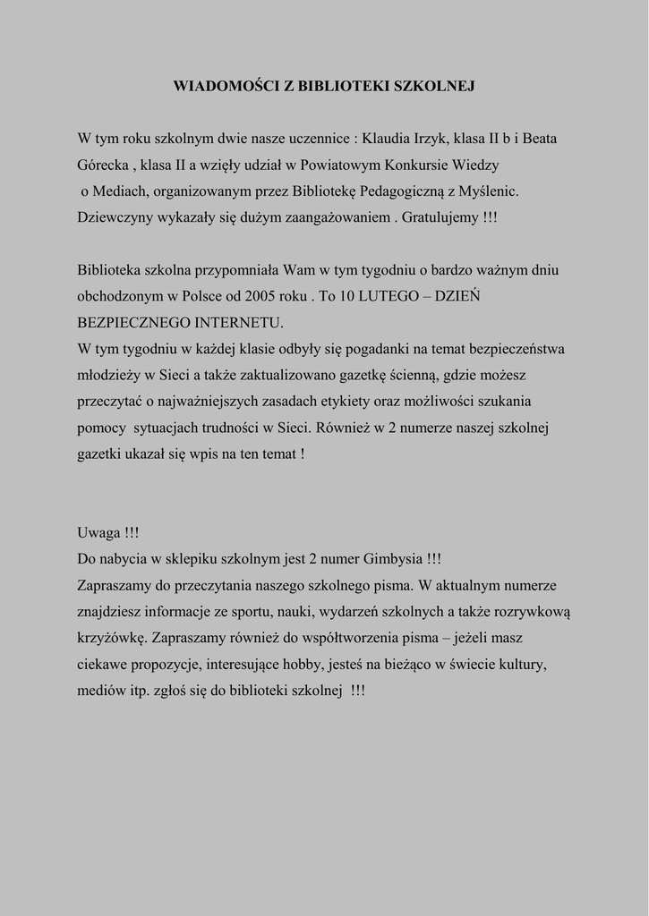 WIADOMOŚCI Z BIBLIOTEKI SZKOLNEJ W tym roku szkolnym dwie nasze uczennice : Klaudia Irzyk, klasa II b i Beata Górecka , klasa II a wzięły udział w Powiatowym Konkursie Wiedzy o Mediach, organizowanym przez Bibliotekę Pedagogiczną z Myślenic. Dziewczyny wykazały się dużym zaangażowaniem . Gratulujemy !!! Biblioteka szkolna przypomniała Wam w tym tygodniu o bardzo ważnym dniu obchodzonym w Polsce od 2005 roku . To 10 LUTEGO – DZIEŃ BEZPIECZNEGO INTERNETU. W tym tygodniu w każdej klasie odbyły się pogadanki na temat bezpieczeństwa młodzieży w Sieci a także zaktualizowano gazetkę ścienną, gdzie możesz przeczytać o najważniejszych zasadach etykiety oraz możliwości szukania pomocy sytuacjach trudności w Sieci. Również w 2 numerze naszej szkolnej gazetki ukazał się wpis na ten temat ! Uwaga !!! Do nabycia w sklepiku szkolnym jest 2 numer Gimbysia !!! Zapraszamy do przeczytania naszego szkolnego pisma. W aktualnym numerze znajdziesz informacje ze sportu, nauki, wydarzeń szkolnych a także rozrywkową krzyżówkę. Zapraszamy również do współtworzenia pisma – jeżeli masz ciekawe propozycje, interesujące hobby, jesteś na bieżąco w świecie kultury, mediów itp. zgłoś się do biblioteki szkolnej !!!