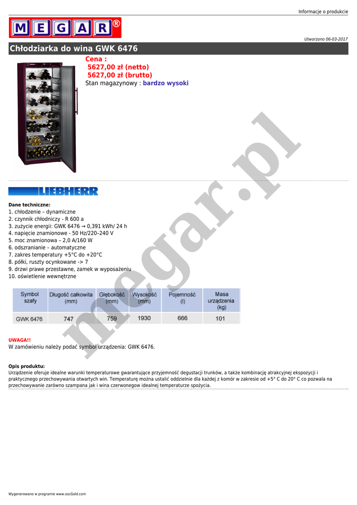 Informacje o produkcie Utworzono 06-03-2017 Chłodziarka do wina GWK 6476 Cena : 5627,00 zł (netto) 5627,00 zł (brutto) .p l Stan magazynowy : bardzo wysoki ar Dane techniczne: m eg 1. chłodzenie – dynamiczne 2. czynnik chłodniczy - R 600 a 3. zużycie energii: GWK 6476 → 0,391 kWh/ 24 h 4. napięcie znamionowe - 50 Hz/220–240 V 5. moc znamionowa – 2,0 A/160 W 6. odszranianie – automatyczne 7. zakres temperatury +5°C do +20°C 8. półki, ruszty ocynkowane -> 7 9. drzwi prawe przestawne, zamek w wyposażeniu 10. oświetlenie wewnętrzne UWAGA!! W zamówieniu należy podać symbol urządzenia: GWK 6476. Opis produktu: Urządzenie oferuje idealne warunki temperaturowe gwarantujące przyjemność degustacji trunków, a także kombinację atrakcyjnej ekspozycji i praktycznego przechowywania otwartych win. Temperaturę można ustalić oddzielnie dla każdej z komór w zakresie od +5° C do 20° C co pozwala na przechowywanie zarówno szampana jak i wina czerwonegow idealnej temperaturze spożycia. Wygenerowano w programie www.oscGold.com