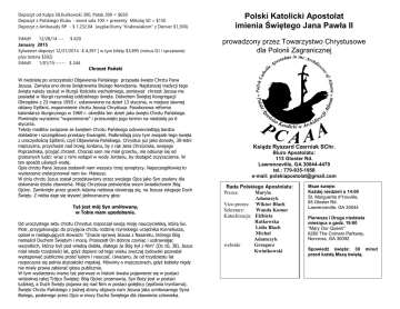 Depozyt od Kulpa 50,Kulikowski 300, Patak 300 = $650 Depozyt z Polskiego Klubu - zwrot sala 100 + prezenty Mikolaj 50 = $150 Depozyt z Ambasady RP - $ 1,232.04 (wyplacilismy "Krakowiakom" z Denver $1,300) StMdY 12/28/14 --- $ 620 January 2015 Sylwester depozyt 12/31/2014 -$ 4,397 [ w tym bilety $3,895 (minus DJ i sprzatanie) plus loteria $502] StMdY 1/01/15------ $ 244 Chrzest Pański W niedzielę po uroczystości Objawienia Pańskiego przypada święto Chrztu Pana Jezusa. Zamyka ono okres świętowania Bożego Narodzenia. Najstarszej tradycji tego święta należy szukać w liturgii Kościoła wschodniego, ponieważ chrzest Jezusa nie posiadał w liturgii rzymskiej oddzielnego święta. Dekretem Świętej Kongregacji Obrzędów z 23 marca 1955 r. ustanowiono na dzień 13 stycznia, w miejsce dawnej oktawy Epifanii, wspomnienie chrztu Jezusa Chrystusa. Posoborowa reforma kalendarza liturgicznego w 1969 r. określiła ten dzień jako święto Chrztu Pańskiego. Pominięto wyrażenie "wspomnienie" i przesunięto jego termin na niedzielę po 6 stycznia. Teksty modlitw związane ze świętem Chrztu Pańskiego odzwierciedlają bardzo dokładnie i szczegółowo przekazy Ewangelii. Podkreślają przy tym związek tego święta z uroczystością Epifanii, czyli Objawienia Pańskiego. Chrystus już jako dorosły, 30-letni mężczyzna, przychodzi nad brzeg Jordanu, by z rąk Jana Chrzciciela, swojego Poprzednika, przyjąć chrzest. Chociaż sam nie miał grzechu, nie odsunął się od grzesznych ludzi: wraz z nimi wstąpił w wody Jordanu, by dostąpić oczyszczenia. W ten sposób uświęcił wodę. Opis chrztu Pana Jezusa zostawili nam wszyscy trzej synoptycy. Najszczegółowiej to wydarzenie zrelacjonował nam św. Mateusz. W dniu chrztu Jezus został przedstawiony przez swojego Ojca jako Syn posłany dla dokonania dzieła zbawienia. Misję Chrystusa potwierdza swym świadectwem Bóg Ojciec. Zamknięte przez grzech Adama niebiosa otwierają się, na Jezusa zstępuje Duch Święty. Z nieba daje się słyszeć jednoznaczny głos: Tyś jest mój Syn umiłowany, w Tobie mam upodobanie. Od uroczystego aktu chrztu Chrystus rozpoczął swoją misję nauczycielską, którą św. Piotr, przygotowując do przyjęcia chrztu rodzinę rzymskiego urzędnika Korneliusza, opisał w następujących słowach: "Znacie sprawę Jezusa z Nazaretu, którego Bóg namaścił Duchem Świętym i mocą. Przeszedł On dobrze czyniąc i uzdrawiając wszystkich, którzy byli pod władzą diabła, dlatego że Bóg był z Nim" (Dz 10, 38). Jezus miał wtedy trzydzieści lat, gdyż dopiero od tego wieku zwyczaj żydowski pozwalał występować publicznie przed ludem i nauczać. Uważano, że od trzydziestu lat rozpoczyna się pełnia dojrzałości męskiej. Mówimy o mężczyznach, gdyż kobiety nigdy nie miały prawa zabierać głosu publicznie. W tym wydarzeniu mamy też pierwsze w historii świata pojawienie się w postaci widzialnej całej Trójcy Świętej: Bóg Ojciec przemawia, Syn Boży jest w postaci ludzkiej, a Duch Święty pojawia się nad Nim w postaci gołębicy (epifania trynitarna). Święto Chrztu Pańskiego z jednej strony objawia nam Jezusa jako umiłowanego Syna Bożego, posłanego przez Ojca w mocy Ducha Świętego dla zbawienia człowieka. Polski Katolicki Apostolat imienia Świętego Jana Pawła II prowadzony przez Towarzystwo Chrystusowe dla Polonii Zagranicznej Ksiądz Ryszard Czerniak SChr. Biuro Apostolatu: 113 Gloster Rd. Lawrenceville, GA 30044-4470 tel.: 770-935-1958 e-mail: [email protected] Rada Polskiego Apostolatu: Prezes: Maryla Adamczyk Vice-prezes: Wiktor Błach Sekretarz: Wanda Komor Katechizacja: Elżbieta Rutkowska Lidia Błach Michał Adamczyk webside Grzegorz Kwiatkowski Msze święte: Każdej niedzieli o 14:00 St. Marguerita d'Youville, 85 Gloster Rd. Lawrenceville, GA 30044 Pierwsza i Druga niedziela miesiąca o godz. 19:00 "Mary Our Queen" 6260 The Corners Parkway, Norcross, GA 30092 Spowiedź święta: 30 minut przed każdą Mszą świętą. Biuletyn: 11 stycznia 2015 jest zatem ostatecznym słowem,które Ojciec wypowiada do świata. Święto Chrztu Pańskiego Otwarło się niebo i zabrzmiał głos Ojca: To jest mój Syn umiłowany, Jego słuchajcie. Duch Święty zstępuje na Chrystusa pod postacią gołębicy. Ten obraz jest nadal przedmiotem dyskusji. Gołębica bywa obrazem Izraela, narodu, który jest oblubienicą Jahwe. W judaizmie mówi się też o głosie Boga, który rozbrzmiewa w świątyni tak, jak gruchanie gołębicy. Wydaje mi się jednak, że najbardziej prawdopodobne jest odniesienie do Ducha, który na początku stworzenia unosi się nad pierwotnym chaosem, wprowadzając weń porządek (por. Rdz 1,2). Teraz Duch jest obecny na początku nowego stworzenia. Wraz z chrztem Jezusa „rozpoczynają się nowe dzieje, dzieje nowego świata” ****************************************************************************************************************************** ************************************************************************************************************************* Niedziela, 11 stycznia 2015 Md'Y - 2:00pm * W 24 rocznicę śmierci Edwarda Łapińskiego. MourQ - 7:00pm ** O Boże błogosławieństwo dla Wandy Komor i potrzebne łaski w rocznicę urodzin. Niedziela, 25 stycznia 2015 Md'Y - 2:00pm Dziękczynna za 22 lata małżeństwa, Boże błogosławieństwo na dalsze lata i opiekę Matki Bożej Częstochowskiej dla całej rodziny. OGŁOSZENIA 1. Chopin Society zaprasza na "Piano Recital" w wykonaniu Yulianna Avdeeva w 8 lutego 2015. 2. Trawamy w Roku Jubileuszowym celebrując 25-tą rocznicę powstania naszej wspólnoty i z czasem utworzenia Polskiego Apostolatu. Zachęcam wszystkich do znalezienia czasu na prywatną adorację Najświętszego Sakramentu w kaplicy wieczysej adoracji. W kaplicy znajdują się relikwie św. Jana Pawła II, patrona naszego Apostolatu. Przed obliczem Chrystusa ukrytego w Najświętszym Sakramencie za wstawiennictwem św. J