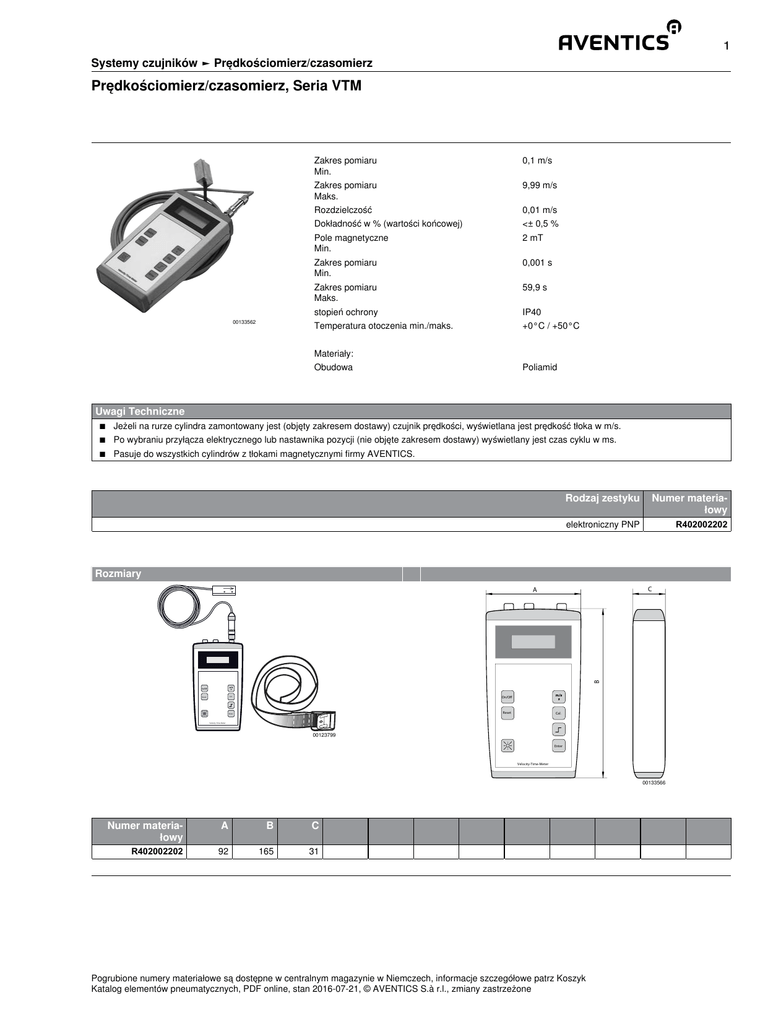 1 Systemy czujników ► Prędkościomierz/czasomierz Prędkościomierz/czasomierz, Seria VTM 00133562 Zakres pomiaru Min. 0,1 m/s Zakres pomiaru Maks. 9,99 m/s Rozdzielczość 0,01 m/s Dokładność w % (wartości końcowej) <± 0,5 % Pole magnetyczne Min. 2 mT Zakres pomiaru Min. 0,001 s Zakres pomiaru Maks. 59,9 s stopień ochrony IP40 Temperatura otoczenia min./maks. +0°C / +50°C Materiały: Obudowa Poliamid Uwagi Techniczne ■ Jeżeli na rurze cylindra zamontowany jest (objęty zakresem dostawy) czujnik prędkości, wyświetlana jest prędkość tłoka w m/s. ■ Po wybraniu przyłącza elektrycznego lub nastawnika pozycji (nie objęte zakresem dostawy) wyświetlany jest czas cyklu w ms. ■ Pasuje do wszystkich cylindrów z tłokami magnetycznymi firmy AVENTICS. Rodzaj zestyku elektroniczny PNP Numer materiałowy R402002202 Rozmiary C B A On/Off Cal. Reset Reset Enter Cal. Velocity-Time-Meter 00123799 Enter Velocity-Time-Meter 00133566 Numer materiałowy R402002202 A B C 92 165 31 Pogrubione numery materiałowe są dostępne w centralnym magazynie w Niemczech, informacje szczegółowe patrz Koszyk Katalog elementów pneumatycznych, PDF online, stan 2016-07-21, © AVENTICS S.à r.l., zmiany zastrzeżone
