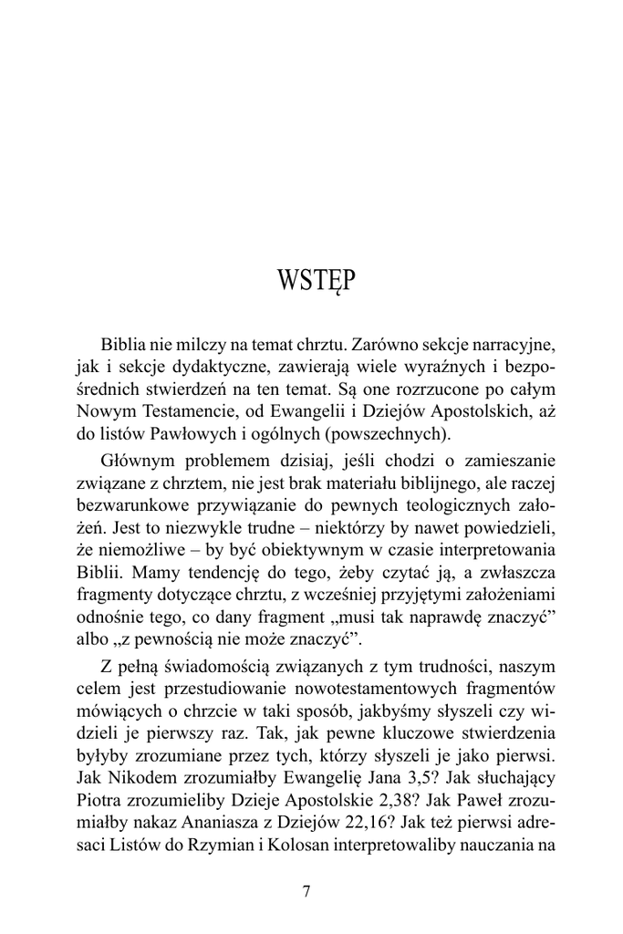 Wstęp Biblia nie milczy na temat chrztu. Zarówno sekcje narracyjne, jak i sekcje dydaktyczne, zawierają wiele wyraźnych i bezpośrednich stwierdzeń na ten temat. Są one rozrzucone po całym Nowym Testamencie, od Ewangelii i Dziejów Apostolskich, aż do listów Pawłowych i ogólnych (powszechnych). Głównym problemem dzisiaj, jeśli chodzi o zamieszanie związane z chrztem, nie jest brak materiału biblijnego, ale raczej bezwarunkowe przywiązanie do pewnych teologicznych założeń. Jest to niezwykle trudne – niektórzy by nawet powiedzieli, że niemożliwe – by być obiektywnym w czasie interpretowania Biblii. Mamy tendencję do tego, żeby czytać ją, a zwłaszcza fragmenty dotyczące chrztu, z wcześniej przyjętymi założeniami odnośnie tego, co dany fragment „musi tak naprawdę znaczyć” albo „z pewnością nie może znaczyć”. Z pełną świadomością związanych z tym trudności, naszym celem jest przestudiowanie nowotestamentowych fragmentów mówiących o chrzcie w taki sposób, jakbyśmy słyszeli czy widzieli je pierwszy raz. Tak, jak pewne kluczowe stwierdzenia byłyby zrozumiane przez tych, którzy słyszeli je jako pierwsi. Jak Nikodem zrozumiałby Ewangelię Jana 3,5? Jak słuchający Piotra zrozumieliby Dzieje Apostolskie 2,38? Jak Paweł zrozumiałby nakaz Ananiasza z Dziejów 22,16? Jak też pierwsi adresaci Listów do Rzymian i Kolosan interpretowaliby nauczania na 7 temat chrztu, zawarte w tych listach? Jak odnosiliby to nauczanie do swojego życia? Jakie jest naturalne, bezpośrednie znaczenie fragmentów mówiących o chrzcie dla osoby, która teraz czyta Nowy Testament? Jak zrozumiałaby odniesienia do chrztu, jeśli nie znałaby albo nie byłaby przywiązana do żadnego konkretnego teologicznego punktu widzenia, np. reformowanego, katolickiego, luterańskiego, czy „campbellowskiego”1? Choć jest to niezwykle trudne, powinno być celem każdej egzegezy czy hermeneutyki. Musimy odrzucić wszystkie hermeneutyczne teorie, które mówią, że pierwotne znaczenie tekstu jest albo nie do odkrycia, albo nie ma znaczenia. Musimy podchodzić do Biblii z przekonaniem, że oryginalne znaczenie większości tekstów - i takie, jakie było w zamierzeniu autora, i takie, jak rozumieli je pierwsi adresaci - jest dla nas do odzyskania z dużą dozą prawdopodobieństwa. Musimy też uznawać to pierwotne znaczenie za precyzyjne i miarodajne. Nie chodzi o to, że perspektywa historyczna i teologiczna nie ma znaczenia przy dążeniu do tego celu. Musimy być gotowi na przyjęcie pomocy od każdego, kto już przestudiował dany tekst i posiada wiedzę potrzebną do jego właściwego zrozumienia. Nie możemy też zignorować właściwego ograniczenia nakładanego przez teologię systematyczną, jeśli chodzi o egzegezę, zwłaszcza jeśli wierzymy w logiczną spójność Biblii. O ile nie jesteśmy irracjonalistami, musimy wierzyć, że wszystkie biblijne doktryny są ze sobą spójne. Cokolwiek jest powiedziane na temat chrztu, musi to być zgodne z tym, co zostało powiedziane na temat takich tematów jak grzech, zbawienie i Kościół. Relacja między systematyczną teologią i egzegezą jest w pewnym sensie dialektyczna. Dane otrzymane z egzegezy fragmentów, których znaczenie jest wyraźniejsze, muszą być ciągle porównywane i zestawiane, żeby płynące z tego wnioski mogły być właściwie użyte do egzegezy innych (zwłaszcza trudniejszych) fragmentów. Biorąc pod uwagę tę dialektyczną relację – albo być może z jej powodu – musimy być bardzo sceptyczni względem każdego systemu, który zmusza nas, byśmy występowali przeciwko 8 naturalnemu i oczywistemu znaczeniu dużej liczby fragmentów, zwłaszcza jeśli mówią o tym samym, np. o chrzcie. Trzeba zakwestionować wiarygodność systemu, który zmusza nas do interpretowania takich fragmentów w nienaturalny albo naciągany sposób, dzięki któremu wyciąga się z nich coś, czego w nich tak naprawdę nie ma. Innymi słowy, jeśli jedynym powodem naruszenia spójności grupy fragmentów jest powód dogmatyczny, to prawdopodobnie musimy przemyśleć nasz system teologiczny tak, żeby pozwolił nam na odkrycie prawdziwego znaczenia tych fragmentów. Naszym celem w tej książce jest danie przyzwolenia, aby tekst nowotestamentowy mówił tak obiektywnie jak to tylko możliwe, z minimum odniesienia do systemów teologicznych. Naszymi głównymi narzędziami będą studia lingwistyczne, leksykograficzne oraz tła, co jest uznaną od dawna hermeneutyczną zasadą porównywania Pisma z Pismem. Omówimy dwanaście fragmentów kluczowych dla znaczenia2 chrztu, w kolejności, w której pojawiają się one w naszych Bibliach. (Wszystkie cytaty pochodzą z Biblii Warszawskiej, o ile nie zaznaczono inaczej).