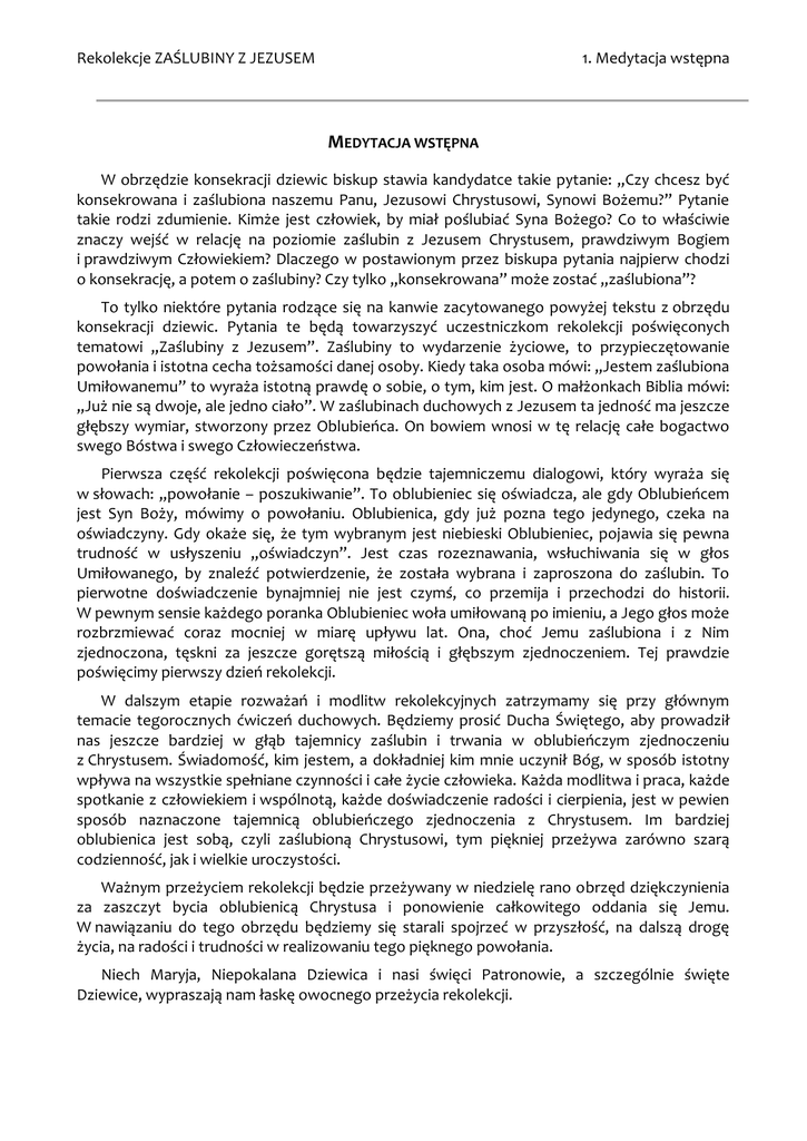 Rekolekcje ZAŚLUBINY Z JEZUSEM 1. Medytacja wstępna MEDYTACJA WSTĘPNA W obrzędzie konsekracji dziewic biskup stawia kandydatce takie pytanie: „Czy chcesz być konsekrowana i zaślubiona naszemu Panu, Jezusowi Chrystusowi, Synowi Bożemu?” Pytanie takie rodzi zdumienie. Kimże jest człowiek, by miał poślubiać Syna Bożego? Co to właściwie znaczy wejść w relację na poziomie zaślubin z Jezusem Chrystusem, prawdziwym Bogiem i prawdziwym Człowiekiem? Dlaczego w postawionym przez biskupa pytania najpierw chodzi o konsekrację, a potem o zaślubiny? Czy tylko „konsekrowana” może zostać „zaślubiona”? To tylko niektóre pytania rodzące się na kanwie zacytowanego powyżej tekstu z obrzędu konsekracji dziewic. Pytania te będą towarzyszyć uczestniczkom rekolekcji poświęconych tematowi „Zaślubiny z Jezusem”. Zaślubiny to wydarzenie życiowe, to przypieczętowanie powołania i istotna cecha tożsamości danej osoby. Kiedy taka osoba mówi: „Jestem zaślubiona Umiłowanemu” to wyraża istotną prawdę o sobie, o tym, kim jest. O małżonkach Biblia mówi: „Już nie są dwoje, ale jedno ciało”. W zaślubinach duchowych z Jezusem ta jedność ma jeszcze głębszy wymiar, stworzony przez Oblubieńca. On bowiem wnosi w tę relację całe bogactwo swego Bóstwa i swego Człowieczeństwa. Pierwsza część rekolekcji poświęcona będzie tajemniczemu dialogowi, który wyraża się w słowach: „powołanie – poszukiwanie”. To oblubieniec się oświadcza, ale gdy Oblubieńcem jest Syn Boży, mówimy o powołaniu. Oblubienica, gdy już pozna tego jedynego, czeka na oświadczyny. Gdy okaże się, że tym wybranym jest niebieski Oblubieniec, pojawia się pewna trudność w usłyszeniu „oświadczyn”. Jest czas rozeznawania, wsłuchiwania się w głos Umiłowanego, by znaleźć potwierdzenie, że została wybrana i zaproszona do zaślubin. To pierwotne doświadczenie bynajmniej nie jest czymś, co przemija i przechodzi do historii. W pewnym sensie każdego poranka Oblubieniec woła umiłowaną po imieniu, a Jego głos może rozbrzmiewać coraz mocniej w miarę upływu lat. Ona, choć Jemu zaślubiona i z Nim zjednoczona, tęskni za jeszcze gorętszą miłością i głębszym zjednoczeniem. Tej prawdzie poświęcimy pierwszy dzień rekolekcji. W dalszym etapie rozważań i modlitw rekolekcyjnych zatrzymamy się przy głównym temacie tegorocznych ćwiczeń duchowych. Będziemy prosić Ducha Świętego, aby prowadził nas jeszcze bardziej w głąb tajemnicy zaślubin i trwania w oblubieńczym zjednoczeniu z Chrystusem. Świadomość, kim jestem, a dokładniej kim mnie uczynił Bóg, w sposób istotny wpływa na wszystkie spełniane czynności i całe życie człowieka. Każda modlitwa i praca, każde spotkanie z człowiekiem i wspólnotą, każde doświadczenie radości i cierpienia, jest w pewien sposób naznaczone tajemnicą oblubieńczego zjednoczenia z Chrystusem. Im bardziej oblubienica jest sobą, czyli zaślubioną Chrystusowi, tym piękniej przeżywa zarówno szarą codzienność, jak i wielkie uroczystości. Ważnym przeżyciem rekolekcji będzie przeżywany w niedzielę rano obrzęd dziękczynienia za zaszczyt bycia oblubienicą Chrystusa i ponowienie całkowitego oddania się Jemu. W nawiązaniu do tego obrzędu będziemy się starali spojrzeć w przyszłość, na dalszą drogę życia, na radości i trudności w realizowaniu tego pięknego powołania. Niech Maryja, Niepokalana Dziewica i nasi święci Patronowie, a szczególnie święte Dziewice, wypraszają nam łaskę owocnego przeżycia rekolekcji.